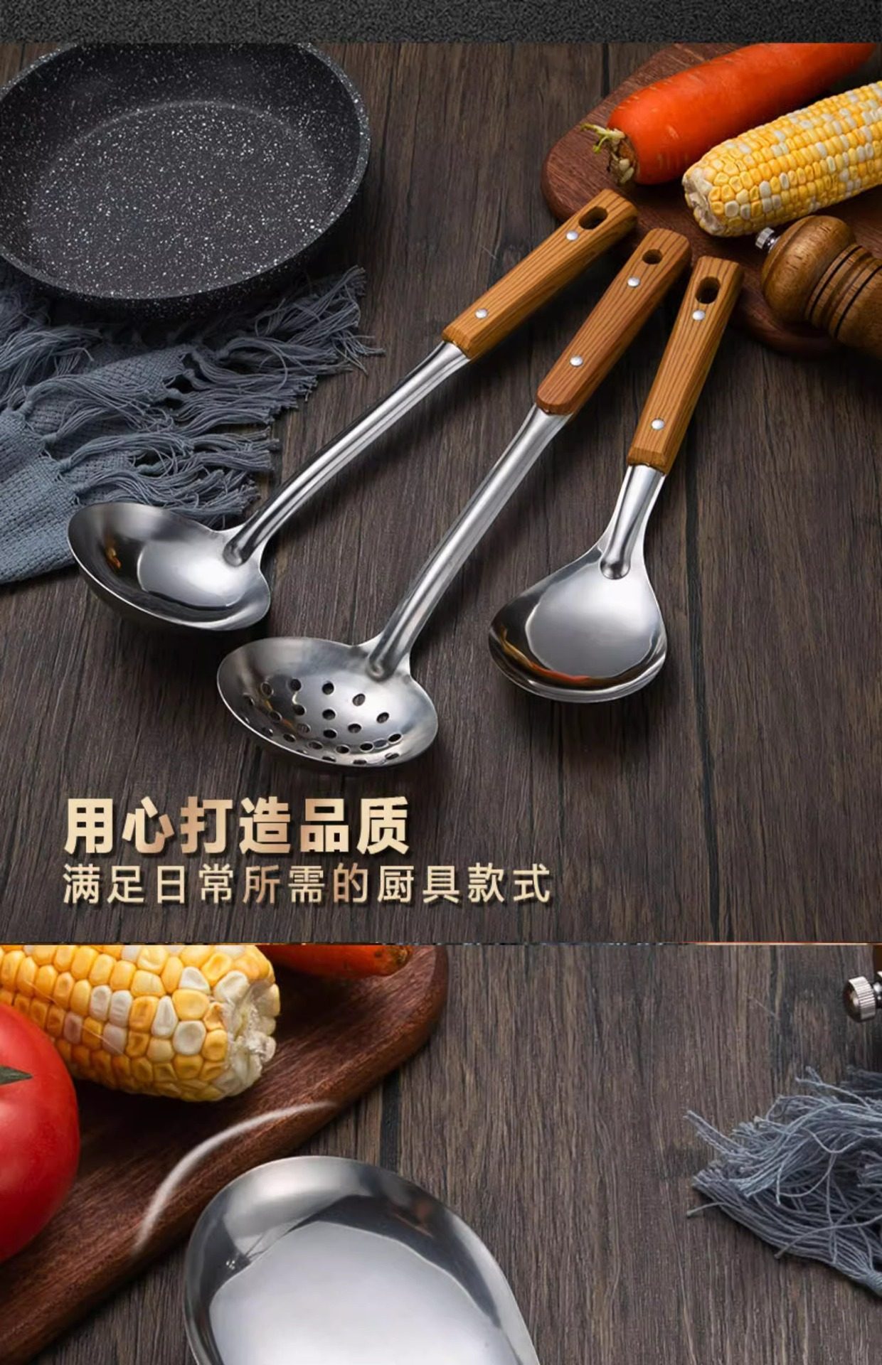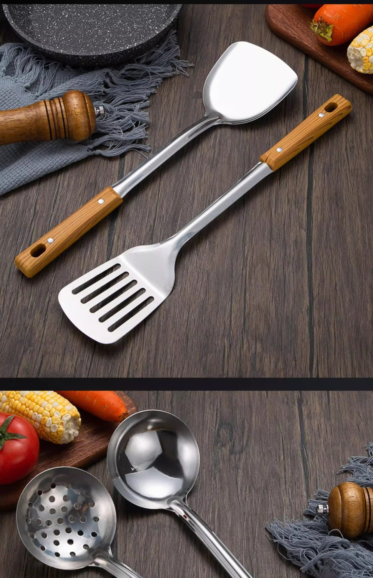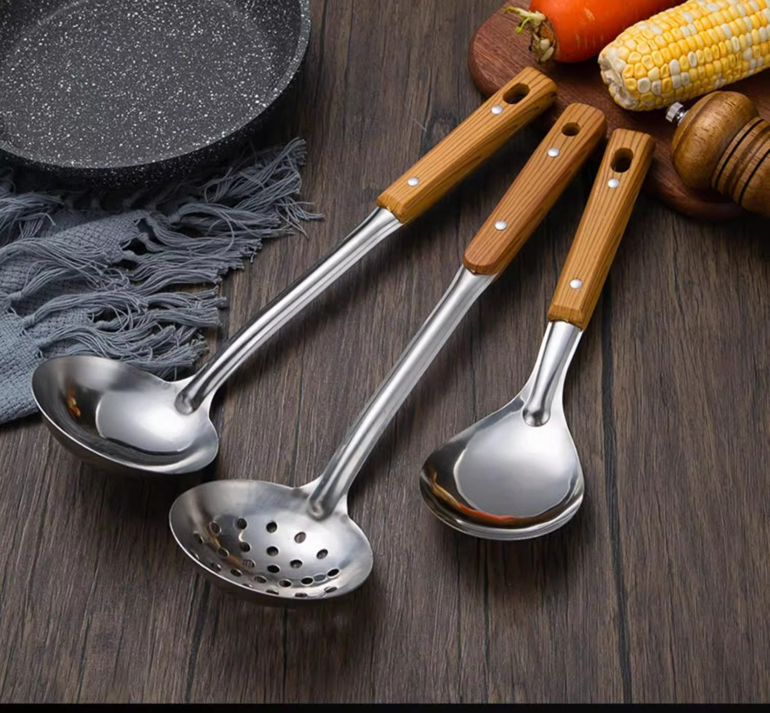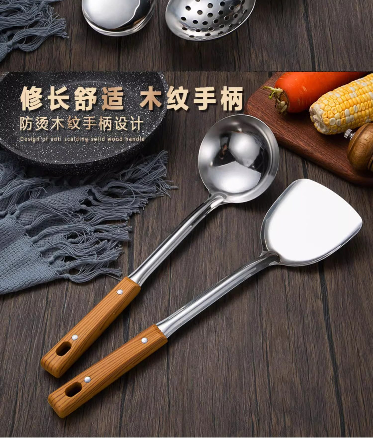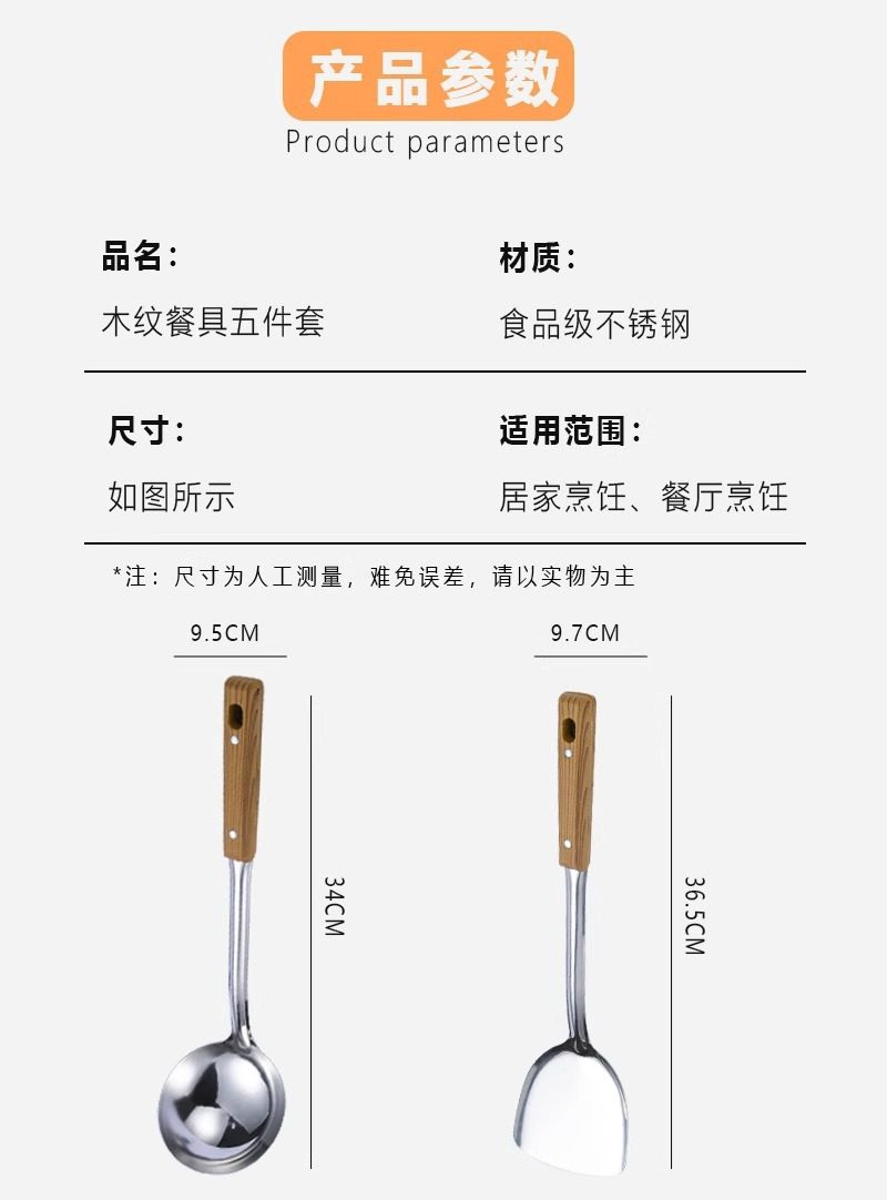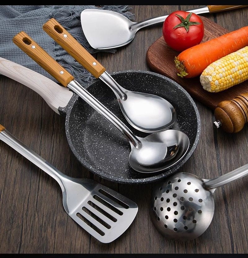 Stainless steel anti-scald handle spatula soup spoon colander imitation wood grain kitchenware suit kitchen household stir-frying spatula thickened