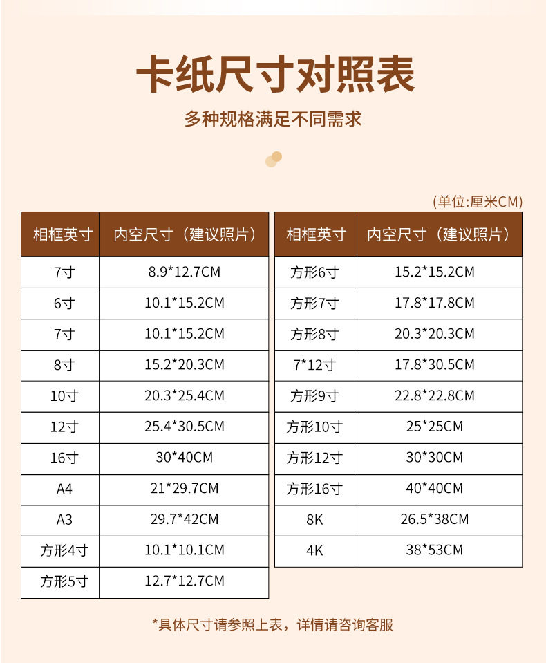 | Inner frame size | 5inch (8.9*12.7cm),6inch (10.1*15.2cm),7inch (12.7*17.8cm),8inch (15.2*20.3cm),10inch (20.3*25.4cm),12inch (25.4*30.5cm),16inch (30*40cm),A4(21*29.7cm),A3(29.7*42cm),Square 4inch (10.1*10.1cm),Square 5inch (12.7*12.7cm),Square 6inch (15.2*15.2cm),Square 7inch (17.8*17.8cm,Square 8inch (20.3*20.3cm),7*12inch (17.8*30.5cm),Square 9inch (22.8*22.8cm),Square 10inch (25*25cm),Square 12inch (30*30cm),Square 16inch (40*40cm),8K(26.5*38cm),4K(38*53cm) |