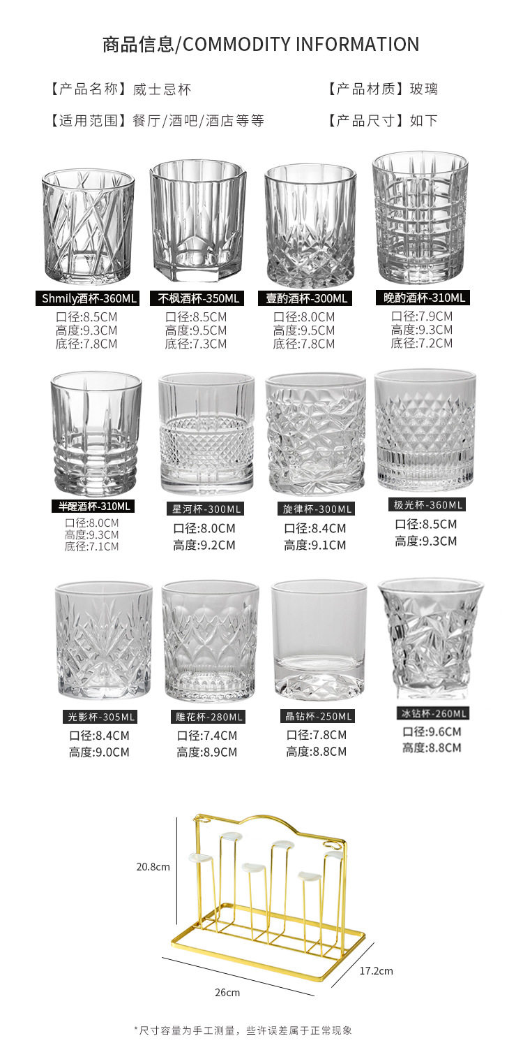 | Color | Whiskey glass no. 1 360ml,No. 2 classical cup 300ml,No. 3 wine cup 310ml,No. 4 phantom half wake cup 310ml,No. 5 Posey Cup 350ml,No. 6 aurora eternal cup 300ml,No. 7 melody cup 300ml,No. 8 aurora cup 360ml,No. 9 light and shadow cup 305ml,No. 10 whiskey glass 280ml,No. 11 crystal diamond cup 250ml,No. 12 ice diamond cup 260ml,Gold cup holder,No. 13 retro classic cup 300ml,No. 14 cup reflection cup 290ml,No. 15 tulip cup [crystal] 100ml,No. 17 soderros cup 360ml,No. 18 tall diamond cup 200ml,No. 19 vertical pattern classical cup 300ml,No. 20 thick bottom square cup 250ml,No. 21 cup tasting cup [crystal] 180ml,No. 23 ice pattern cup 320ml,No. 22 stillock cup 280ml |