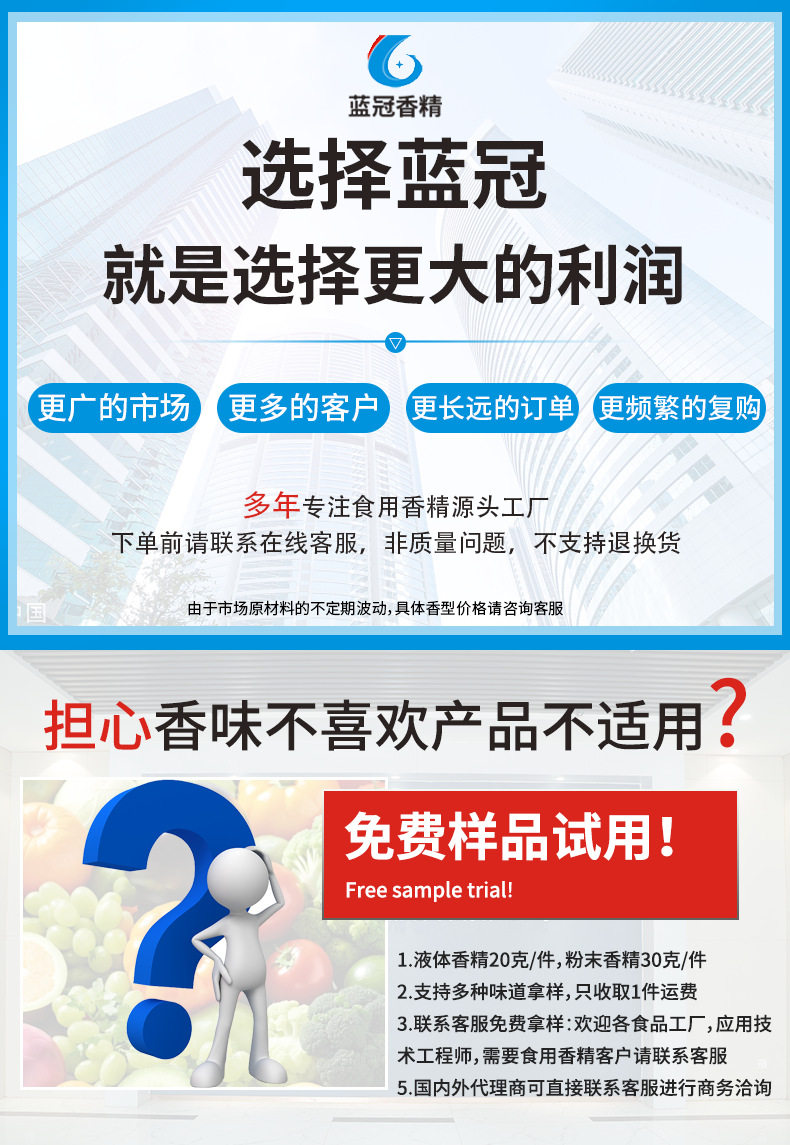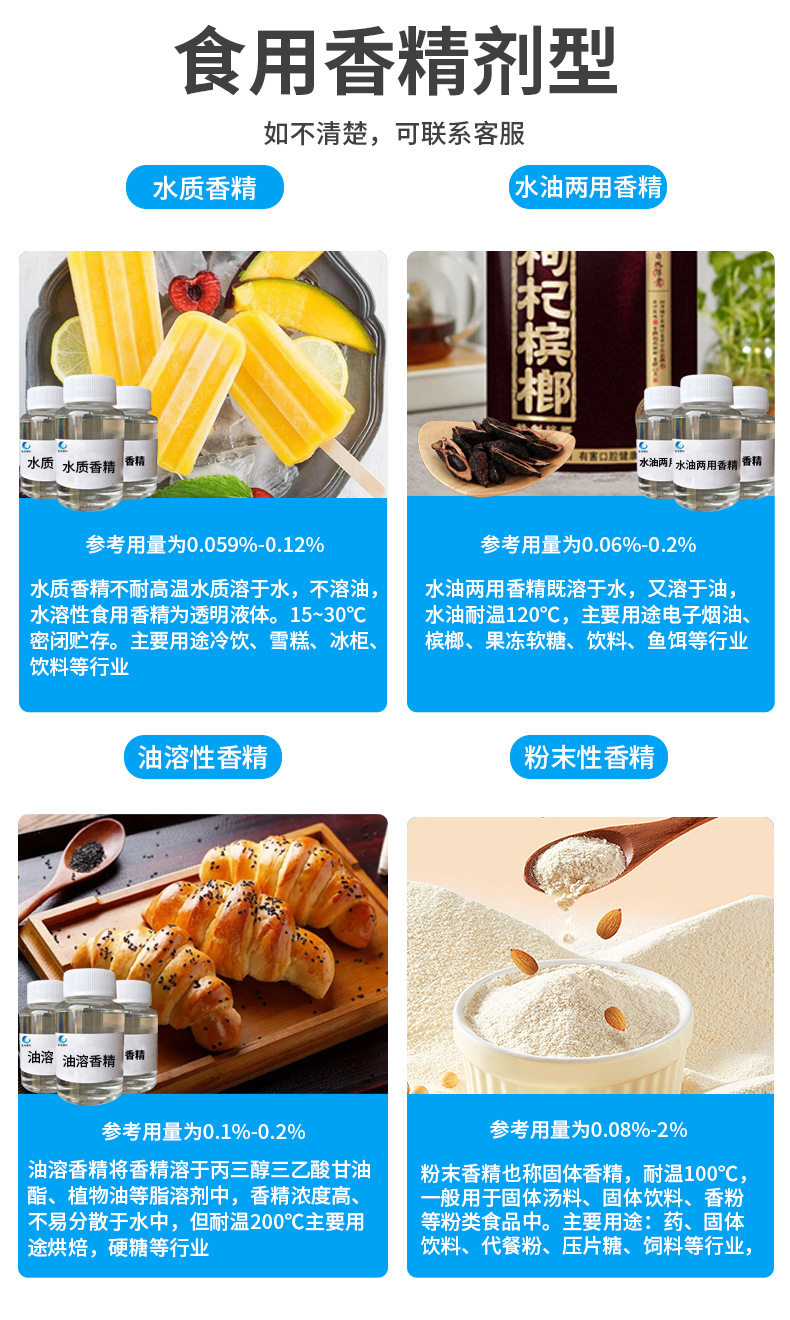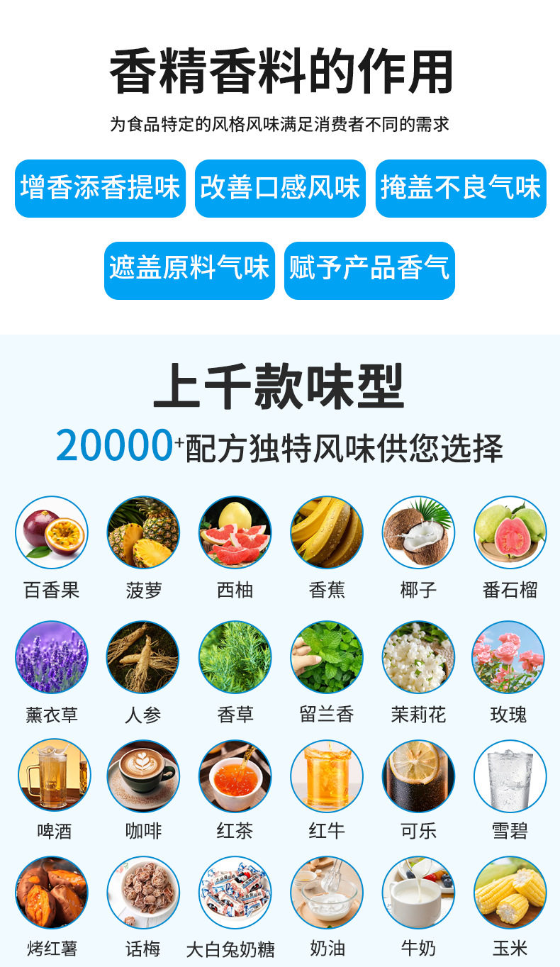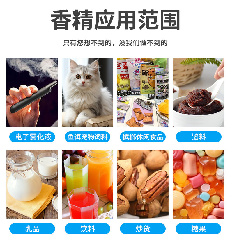 | Specifications and models | 20g sample*remarks: liquid (water, oil, water quality, oil soluble)/powder/industry (product)/*flavor type can be adjusted and customized,50g sample*remarks: liquid (water, oil, water quality, oil soluble)/powder/industry (product)/*flavor type can be adjusted and customized,100g small trial sample*remarks: liquid (water and oil, water quality, oil soluble)/powder/industry (product)/flavor type can be adjusted and customized,500g pilot sample *remarks: liquid (water and oil, water quality, oil soluble)/powder/industry (product)/*flavor type can be adjusted and customized,1000g/1kg pilot sample *remarks: liquid (water and oil, water quality, oil soluble)/powder/industry (product)/*flavor type can be adjusted and customized |