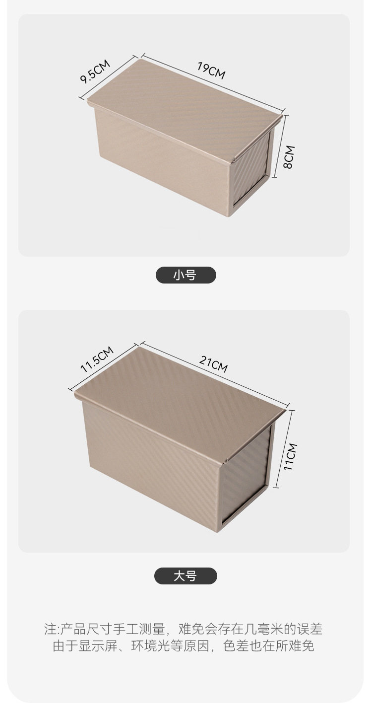 | Specifications | Rose gold 230g corrugated toast box with lid,Gold 230g corrugated toast box with lid,Black 230g corrugated toast box with lid,Golden square 250g toast box with lid,Gold 750g corrugated toast box with lid,Black 750g corrugated toast box with lid,(0.4 thick) rose gold corrugated toast box with lid,(0.4 thick) gold 450g corrugated toast box with lid,(0.5 thick) rose gold 450g corrugated toast box with lid,(0.5 thick) gold 450g corrugated toast box with lid,(0.5 thick) black 450g corrugated toast box with lid,(0.4 thick) - rose gold - small + large - corrugated toast box set with lid,(0.4 thick)-gold-small+large-corrugated toast box set with lid,(0.5 thick) - rose gold - small + large - corrugated toast box set with lid,(0.5 thick)-gold-small+large-corrugated toast box set with lid,(0.5 thick) - black - small + large - corrugated toast box set with lid,Rose gold small + large + green scraper three-piece corrugated toast box set with lid,Rose gold small + large + aged burgundy small silicone brush + small silicone knife with lid corrugated toast box set,2lb rose gold + 1lb black corrugated toast box with lid + beige three-piece set + green scraper three-piece set |