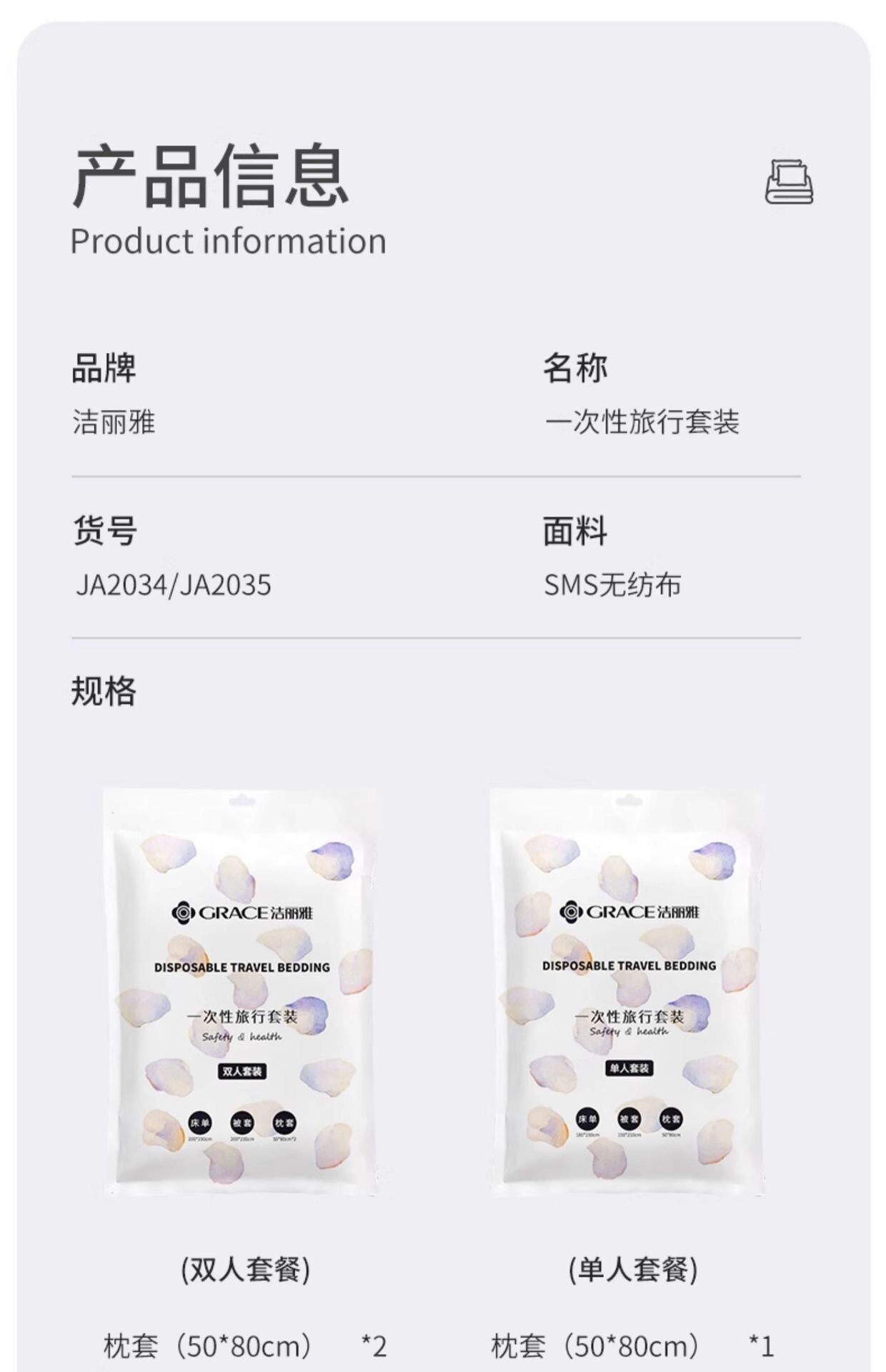 | Flower type | Ja2034 single travel set (1 pillowcase + 1 sheet + 1 quilt cover),Ja2035 double travel set (2 pillowcases + 1 sheets + 1 quilt cover) |