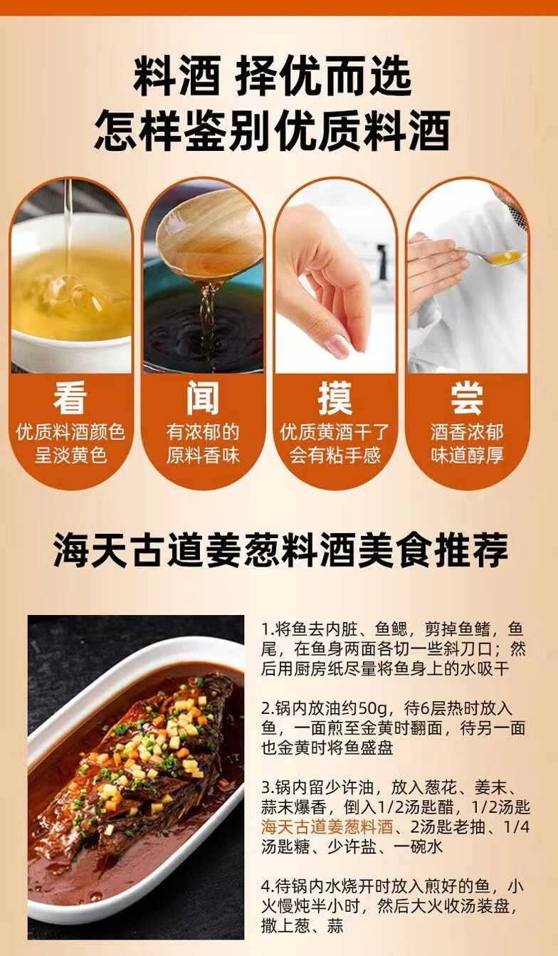 | Packaging specifications | Onion and ginger cooking wine 450ml*1 bottle,Onion and ginger cooking wine 450ml*2 bottles |