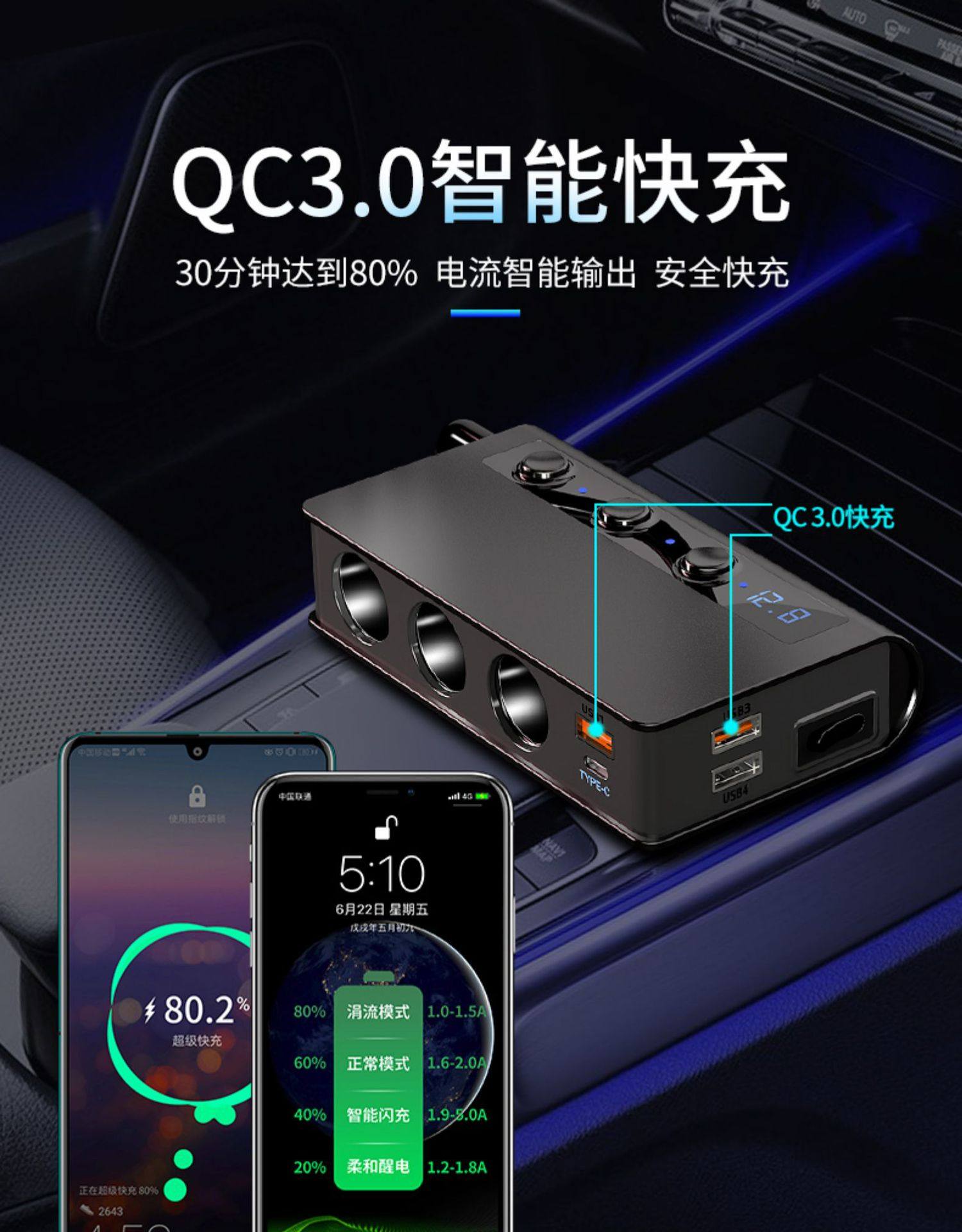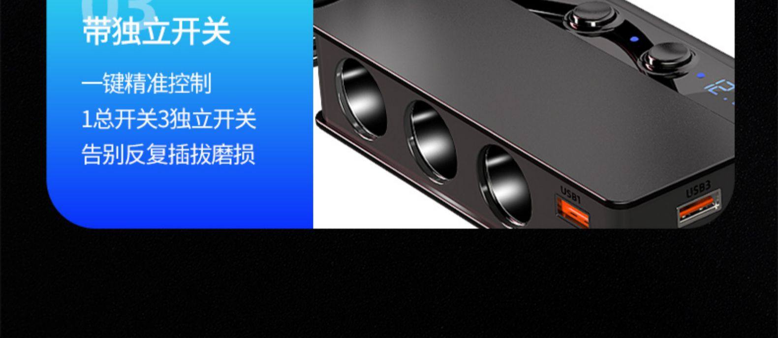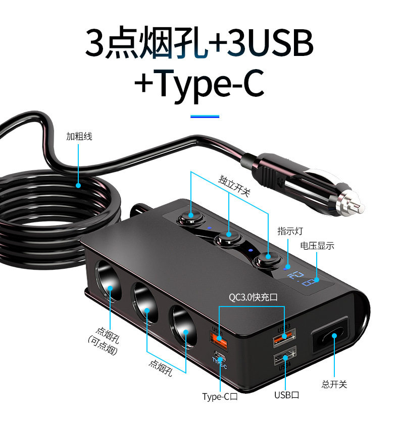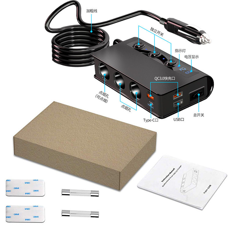 180W high-power car cigarette lighter one for three QC3.0 fast charging PD20W car mobile phone charger with digital display
