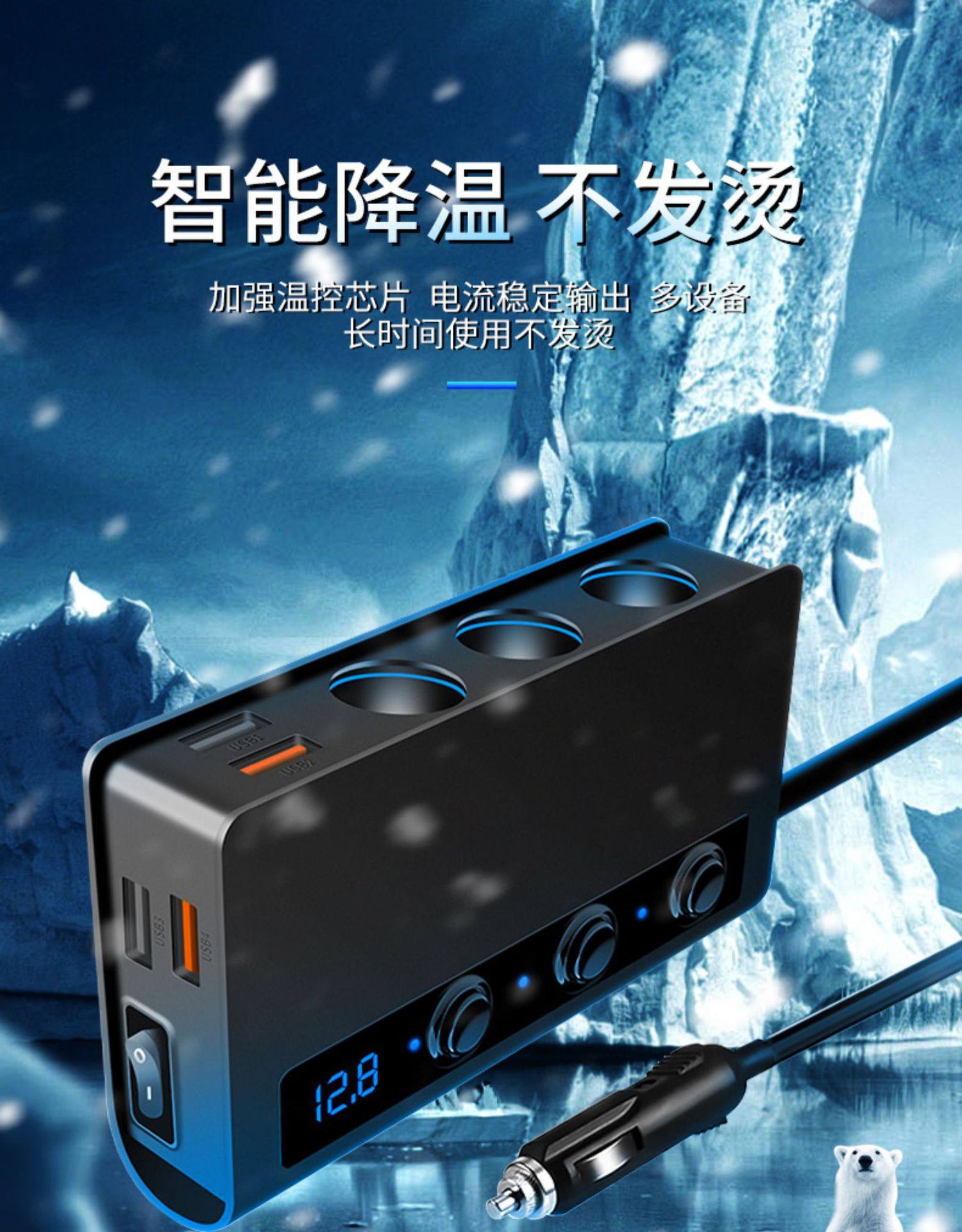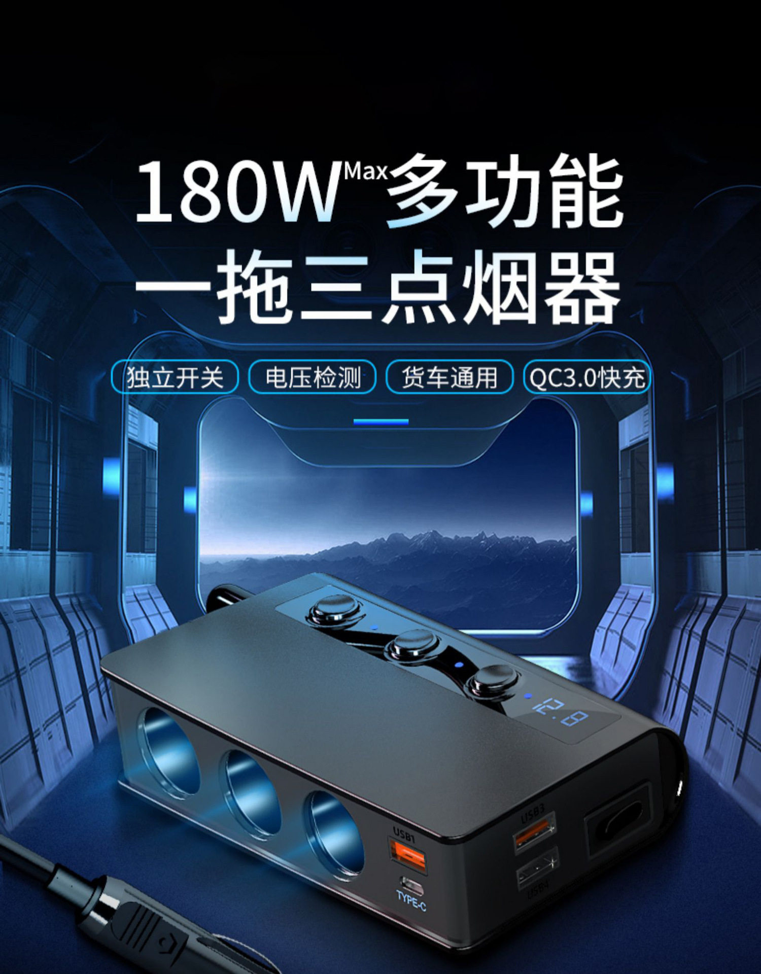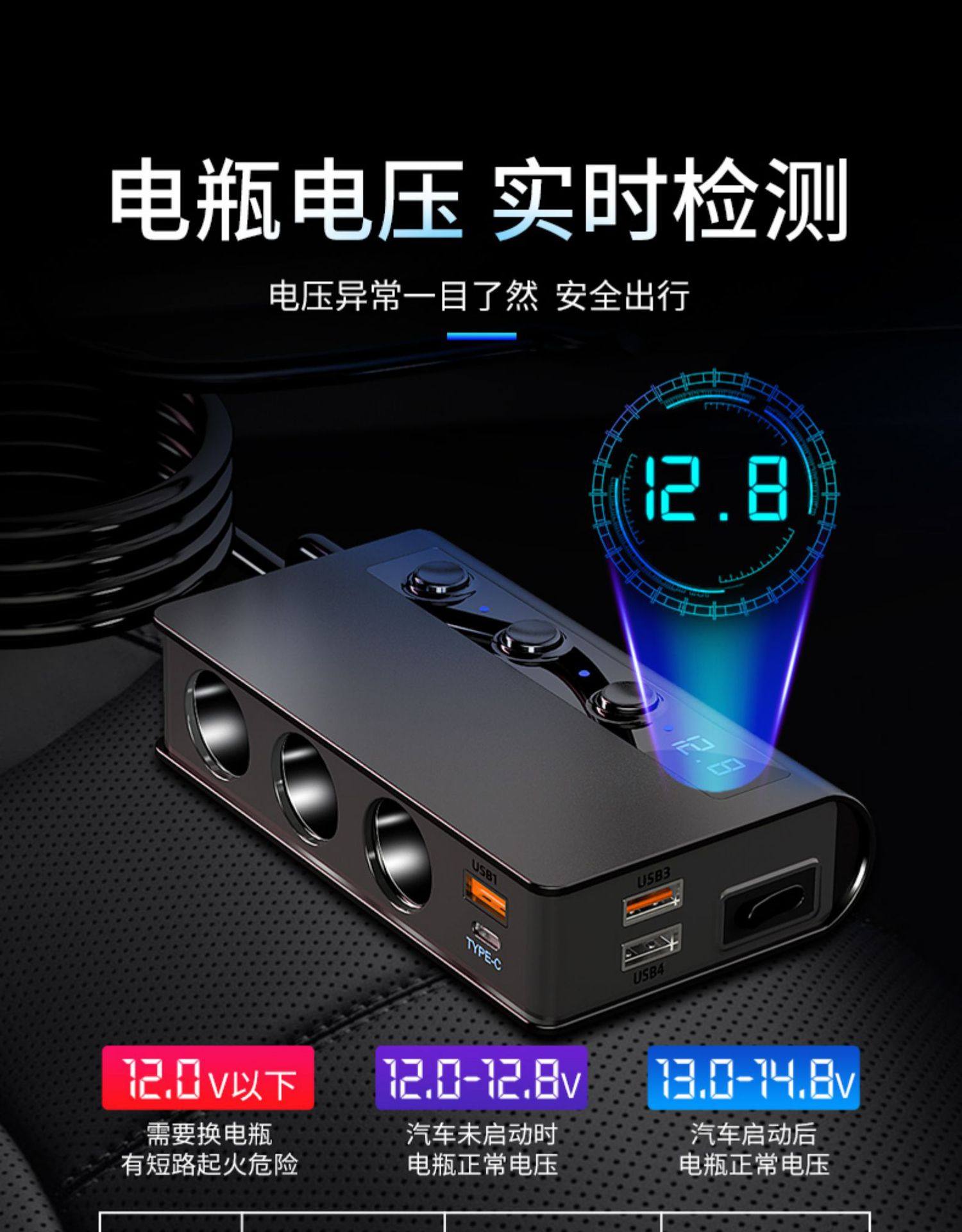 180W high-power car cigarette lighter one for three QC3.0 fast charging PD20W car mobile phone charger with digital display