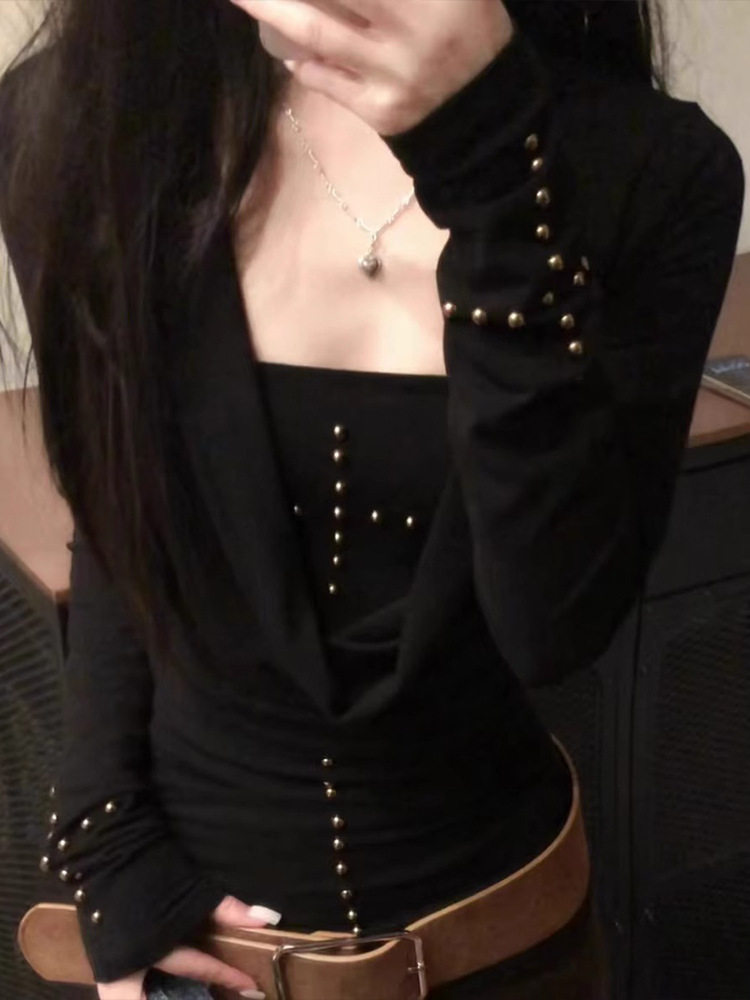 American-style Y2K Spice Girl Swing Collar Long-sleeved T-shirt Women's Spring and Autumn Black Slim-fit Rivet Top Stacked Tube Top Two-piece Suit