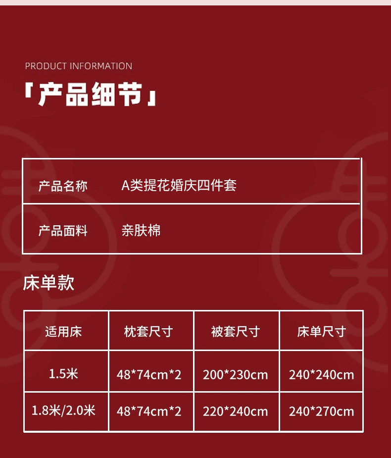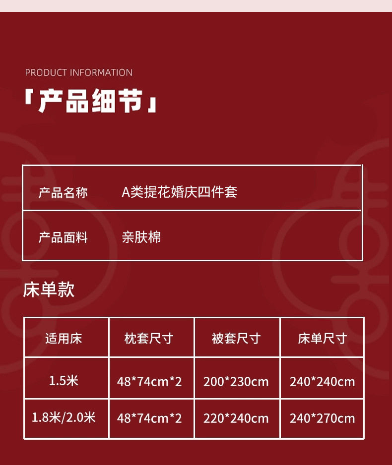 | Size specifications | 1.5m bed four-piece set (quilt cover 200*230cm),1.8m bed four-piece set (quilt cover 200*230cm),2.0m bed four-piece set (quilt cover 220*240cm),1.8 fitted sheet set of four: quilt cover 200x230cm |