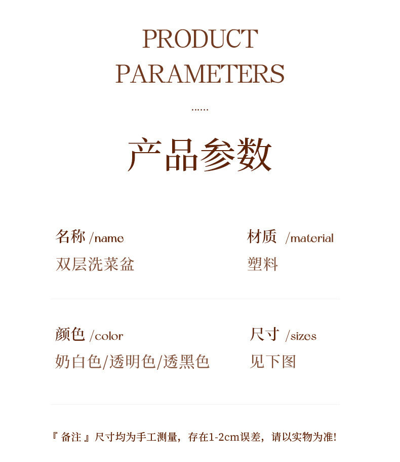 | Color | Small double-layer drain basket two-piece set-transparent color,9335 small drain basket two-piece set (transparent black bk),9335 small drain basket two-piece set (milk white wh),9335 medium drain basket two-piece set (transparent cl),9335 medium drain basket two-piece set (transparent black bk),9335 medium drain basket two-piece set (milk white wh),9335 large drain basket two-piece set (transparent cl),9335 large drain basket two-piece set (transparent black bk),9335 large drain basket two-piece set (milk white wh),9335 small drain basket two-piece set (green gn),9335 small drain basket two-piece set (purple pl |