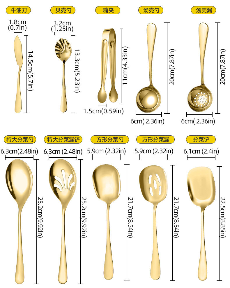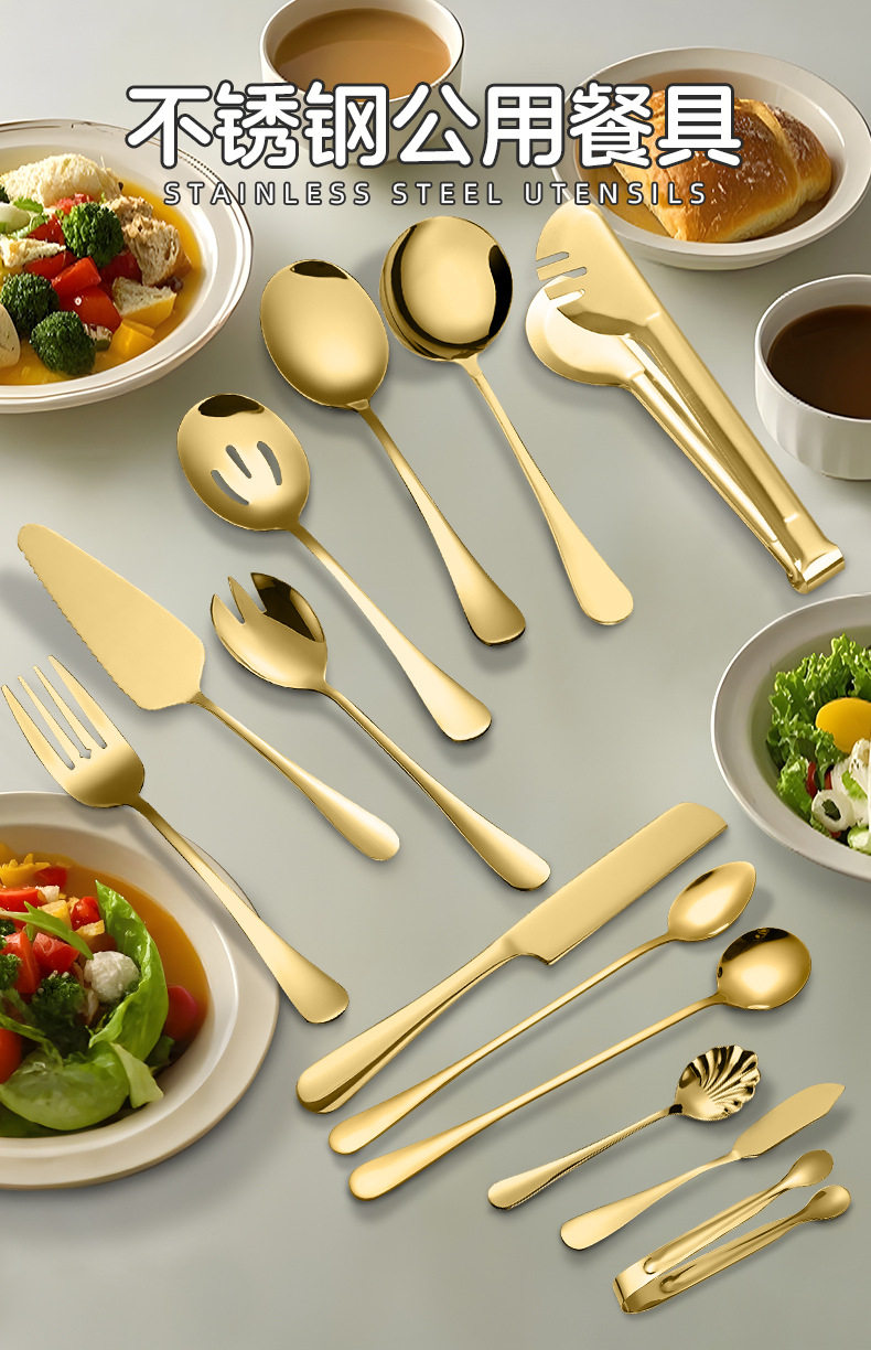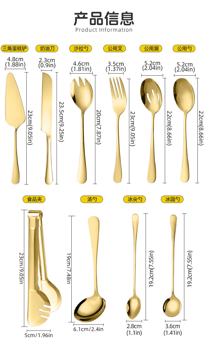 | Color | Public spoon (silver),Public spoon (gold),Public drain (silver),Public drain (gold),Public fork (silver),Public fork (gold),Triangular cake spatula (silver),Triangular cake spatula (gold),Butter knife (silver),Butter knife (gold),Ice round spoon (silver),Ice round spoon (gold),Ice tip spoon (silver),Ice tip spoon (gold),Salad spoon (silver),Salad spoon (gold),Butter knife (silver),Butter knife (gold),Shell spoon (silver),Shell spoon (gold),Sugar clip (silver),Sugar clip (gold),Food clip (silver),Food clip (gold),Spoon (silver),Spoon (gold),Cookie cake knife (silver),Cookie cake knife (gold),Cookie cake spatula (silver),Cookie cake spatula (gold),Large dish drain (silver),Large vegetable drain (gold),Large serving spoon (silver),Large serving spoon (gold),Square serving spatula (silver),Square serving spatula (gold),Square serving spoon (silver),Square serving spoon (gold),Square vegetable drain (silver),Square vegetable drain (gold),Soup drain (silver),Soup drain (gold),Heart-shaped candy tongs (silver),Love candy clip (gold),Dinner plate (20cm) |