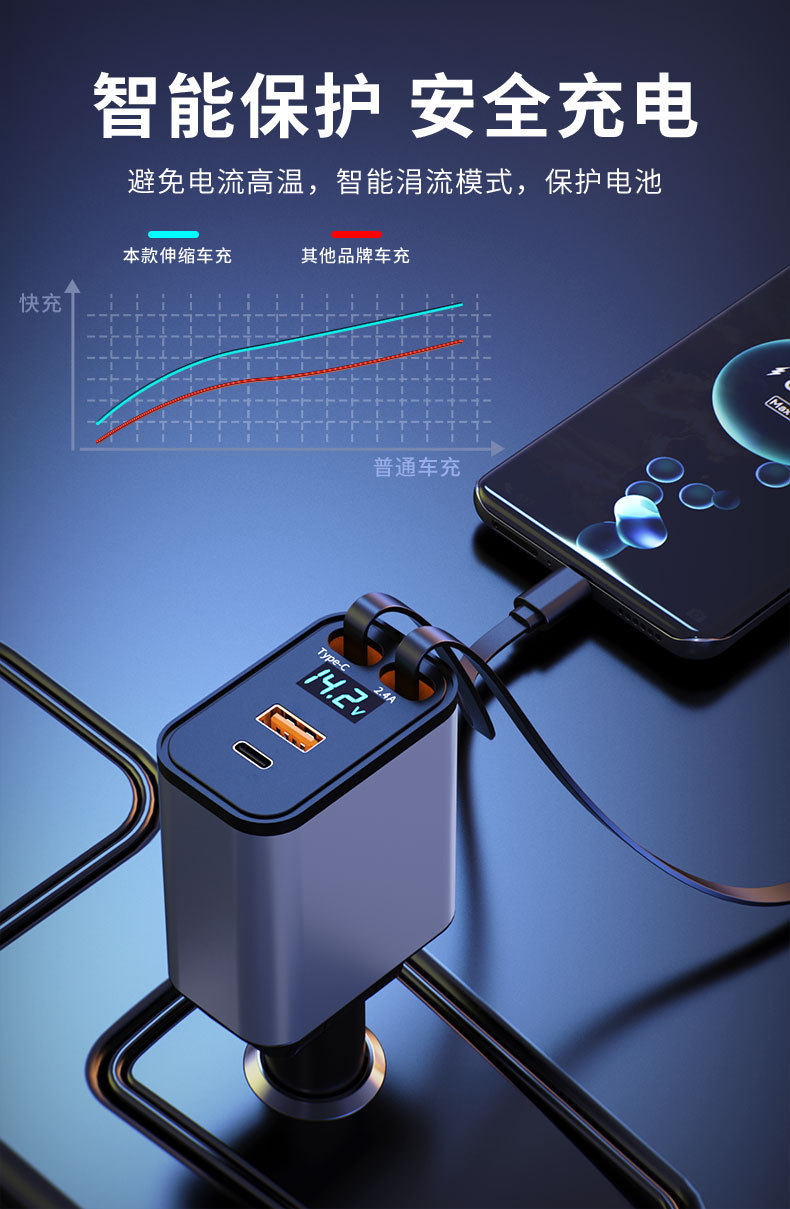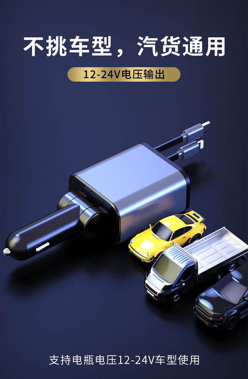 New car charger 120W super fast charge one drag four retractable line multi-function cigarette lighter mobile phone conversion head