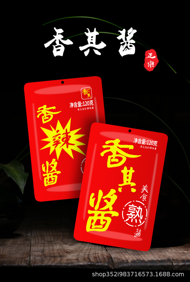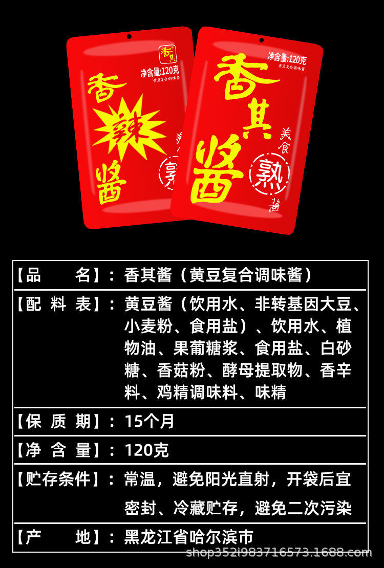 | Packaging specifications | Fragrant sauce original flavor 120g*5 bags,Spicy sauce 120g*5 bags,Fragrant sauce original flavor 120g*10 bags,Spicy fragrant sauce 120g*10 bags,Xiangqi sauce original flavor 120g*5 bags + spicy flavor 5 bags,Xiangqi sauce original flavor 120g*7 bags + spicy flavor 3 bags,Xiangqi sauce original flavor 120g*3 bags + spicy flavor 7 bags,Fragrant sauce original flavor 120g*20 bags,Spicy fragrant sauce 120g*20 bags,Fragrant sauce original flavor 120g*30 bags,Spicy fragrant sauce 120g*30 bags,Xiangqi sauce original flavor 120g*5 bags + spicy flavor 15 bags,Xiangqi sauce original flavor 120g*15 bags + spicy flavor 5 bags |