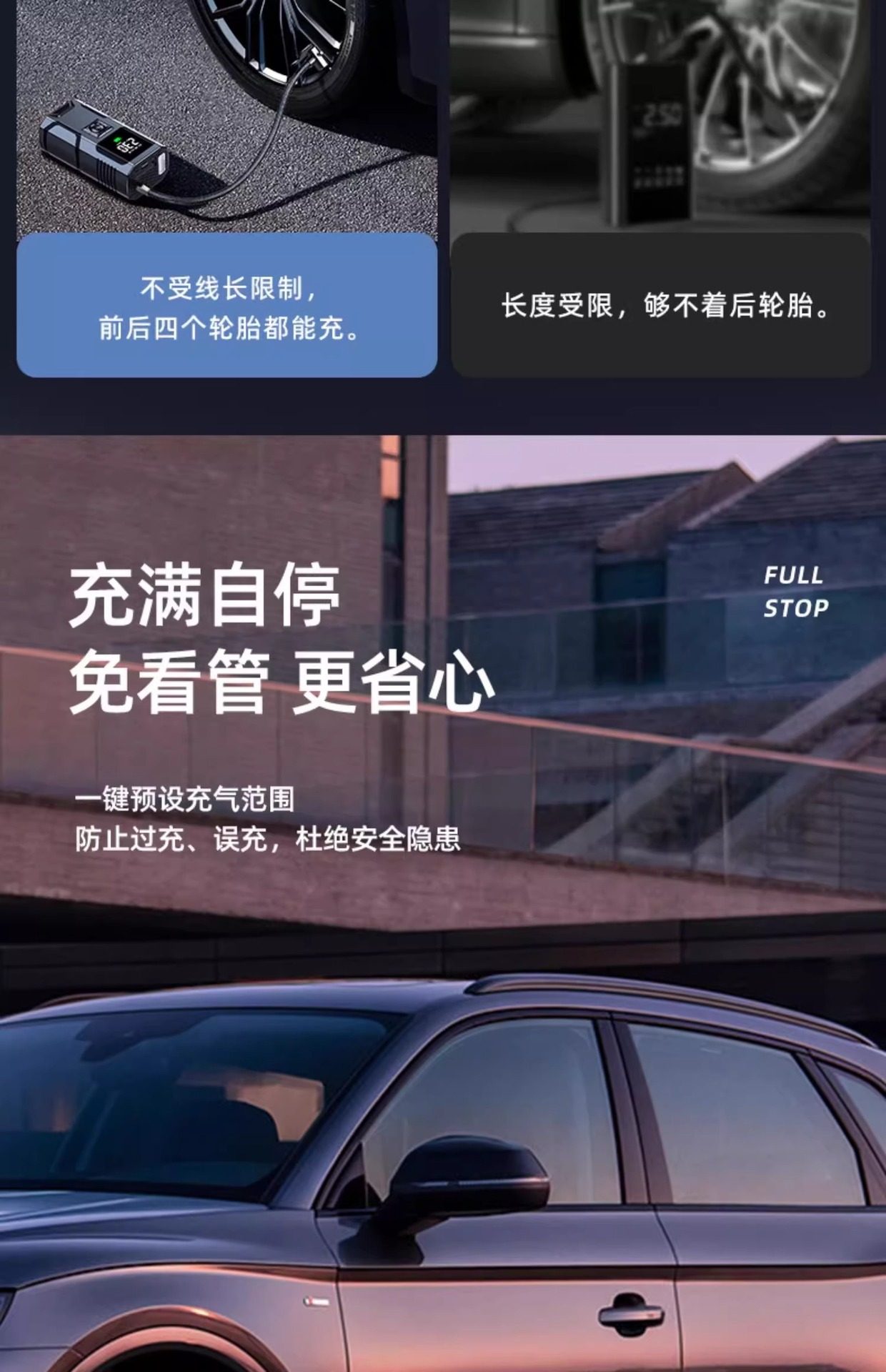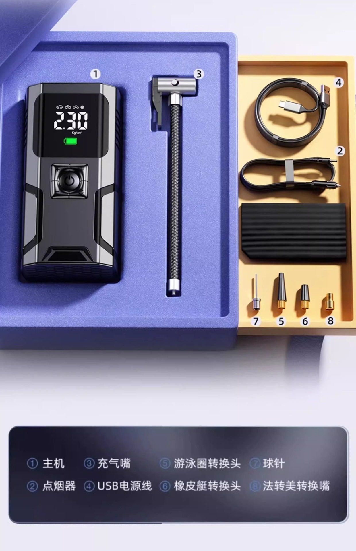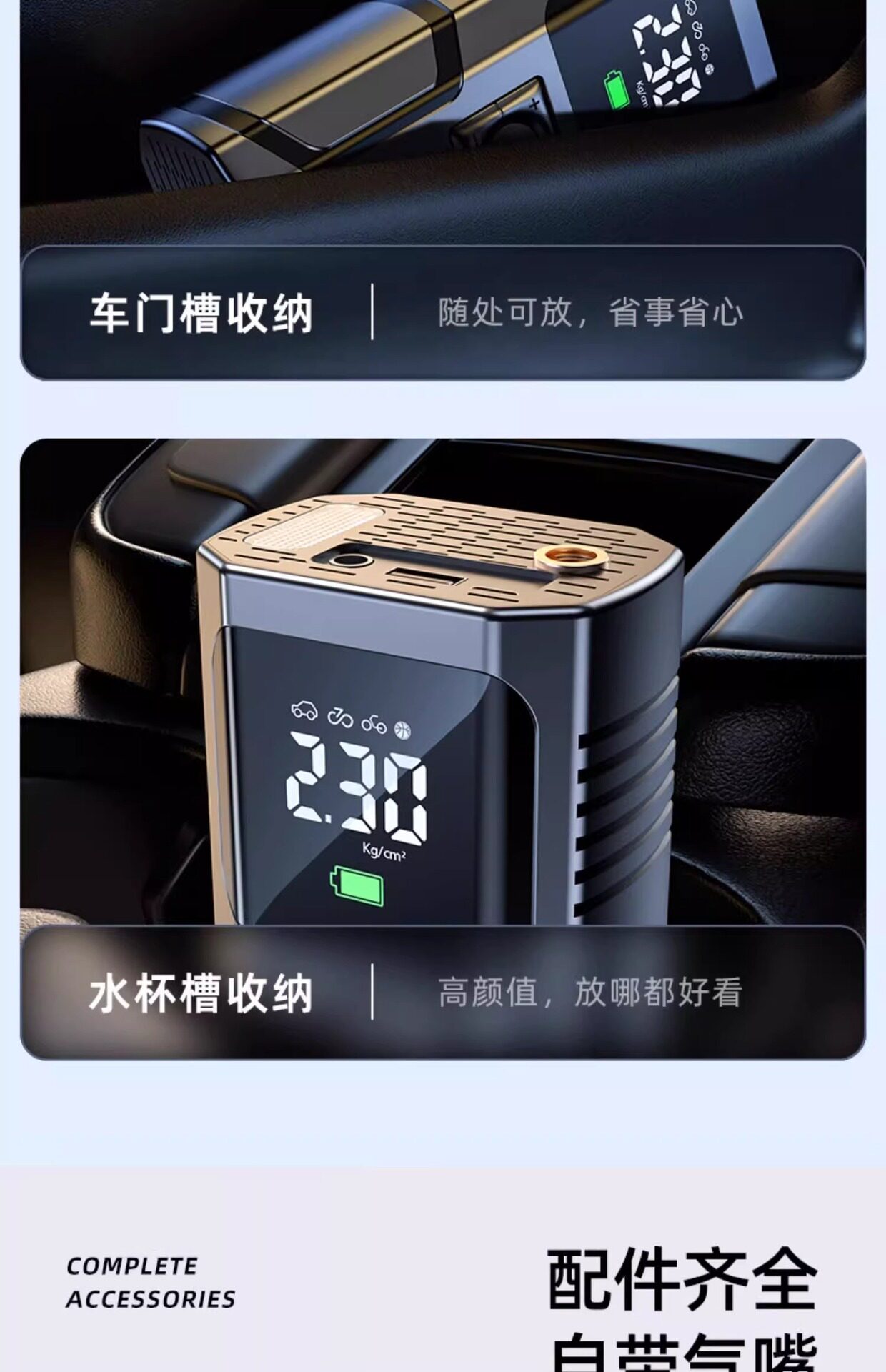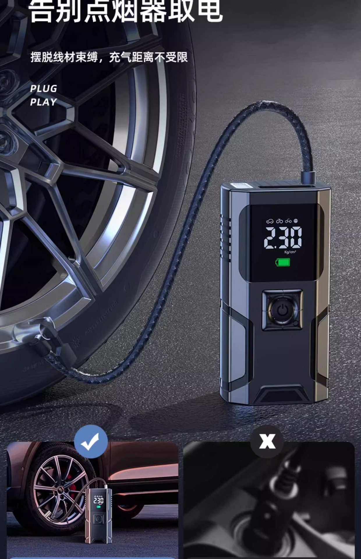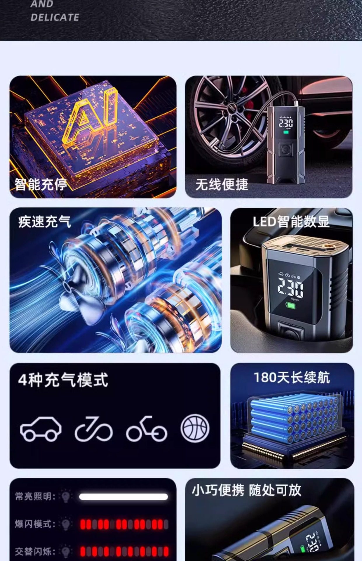 | Specification | [german wired digital display model] pump driving force, quick air replenishment in 5 seconds, free inflation kit (used by plugging in the cigarette lighter),[brushless luxury model can be used as a power bank] 5 seconds fast charging, speed increased by 100%, german ai battery, emergency lighting, cold nitrogen tire protection, automatic charging and stopping,[wireless classic model] german ai battery cell, cold nitrogen-filled tire protection, 2-second fast charging, poly-voltage lithium battery fast charging, automatic charging and stopping, free inflation kit,[can be used wirelessly or wired] german ai battery cell, cold nitrogen-filled tire protection, 2-second fast charging, poly-voltage lithium battery fast charging, automatic charging and stopping, free inflation kit,[brushless three-purpose luxury model] plug-in/rechargeable dual-use, speed increased by 150%, german ai battery core, cold nitrogen tire protection, used as power bank, emergency lighting |