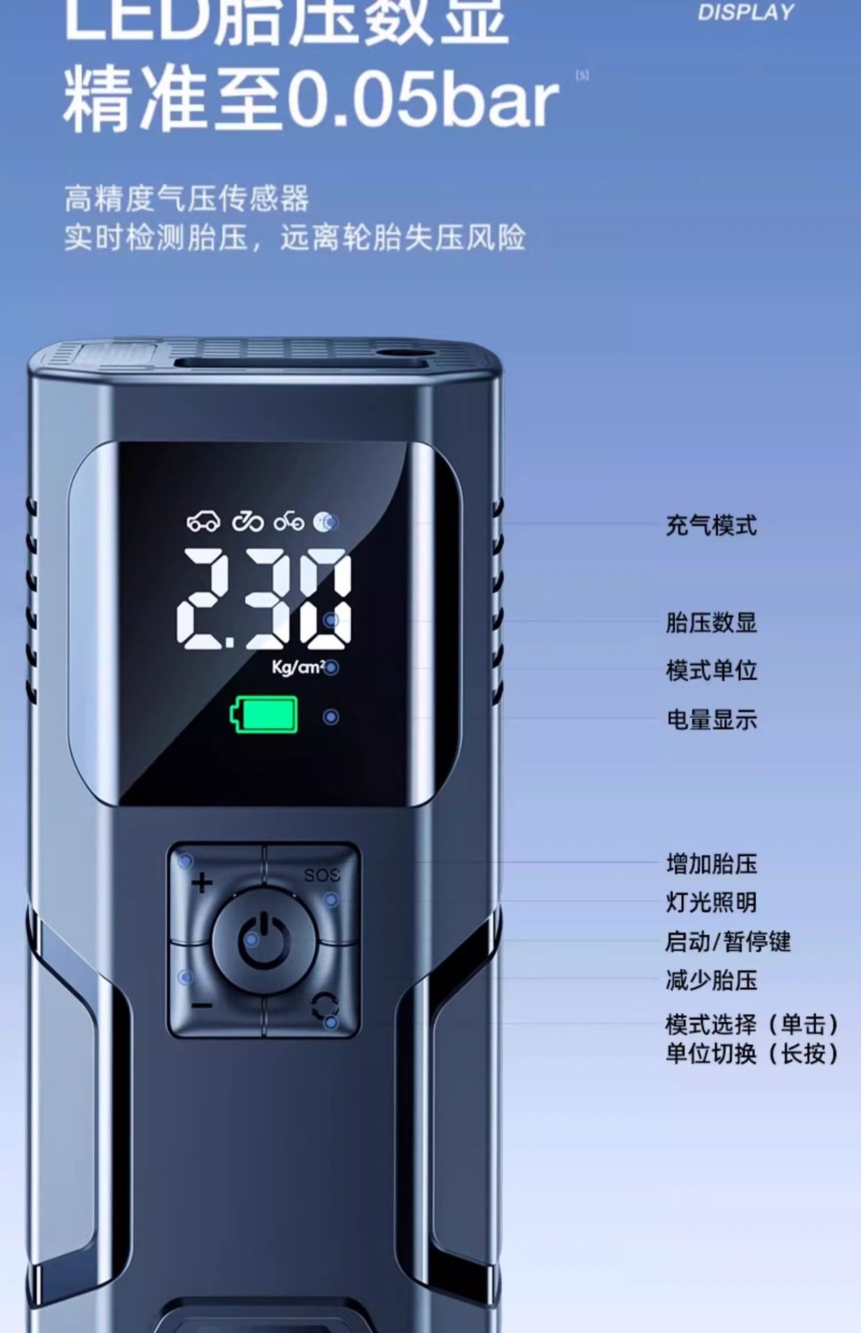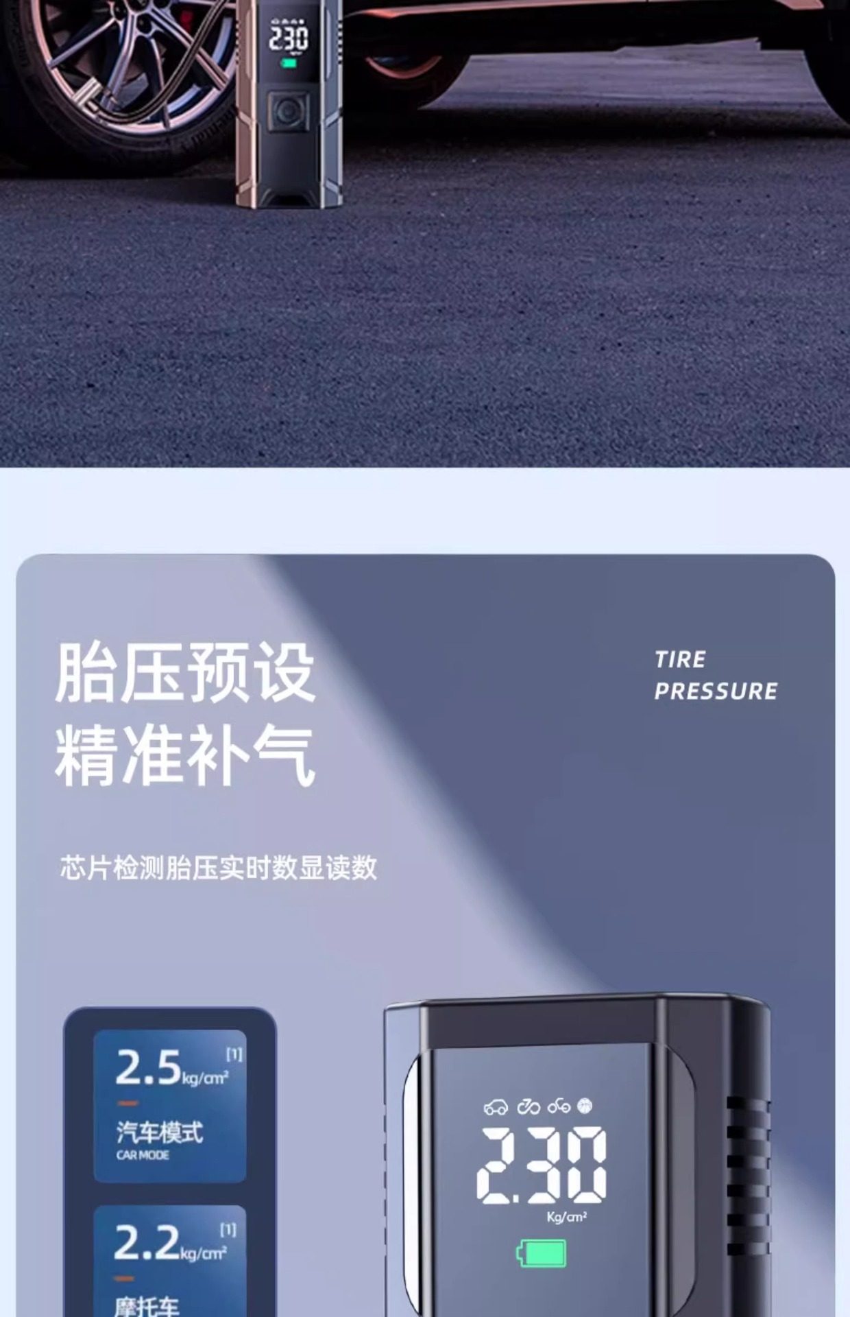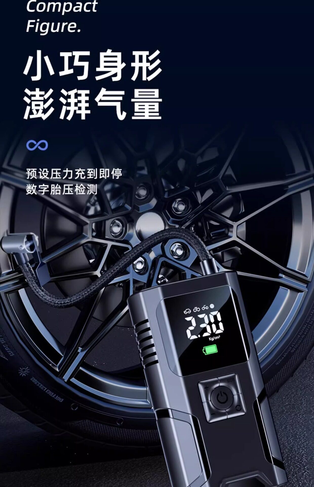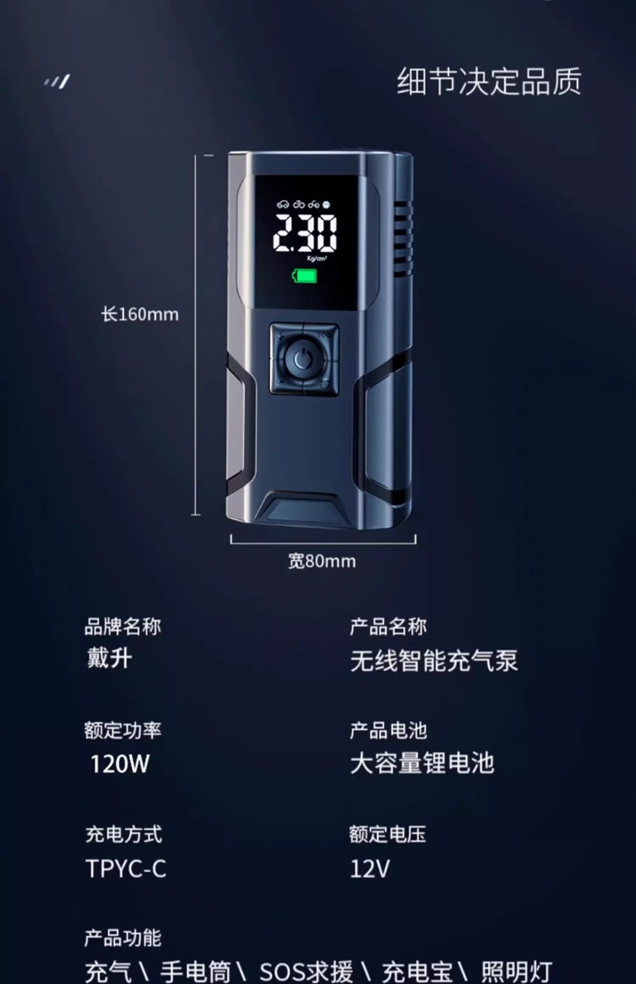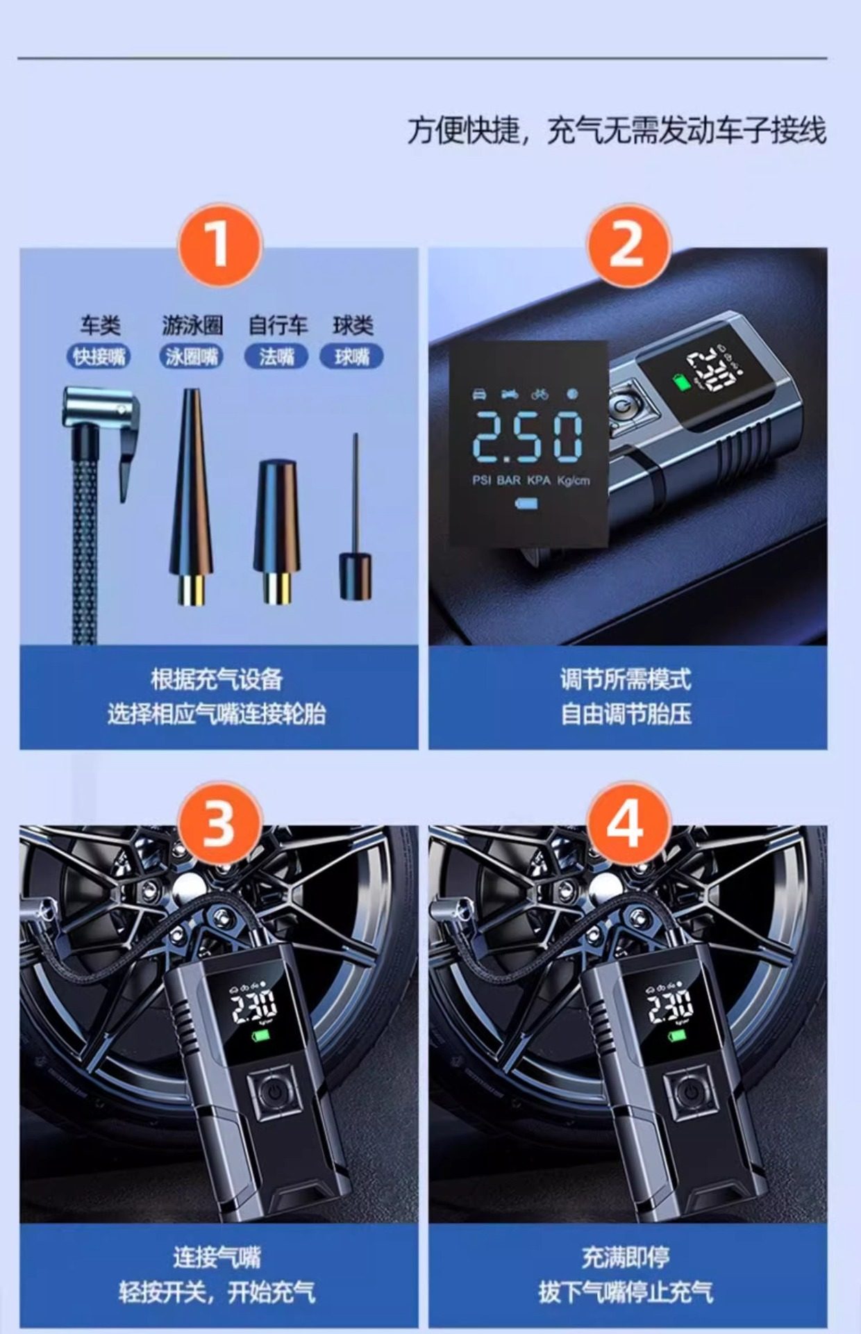 | Specification | [german wired digital display model] pump driving force, quick air replenishment in 5 seconds, free inflation kit (used by plugging in the cigarette lighter),[brushless luxury model can be used as a power bank] 5 seconds fast charging, speed increased by 100%, german ai battery, emergency lighting, cold nitrogen tire protection, automatic charging and stopping,[wireless classic model] german ai battery cell, cold nitrogen-filled tire protection, 2-second fast charging, poly-voltage lithium battery fast charging, automatic charging and stopping, free inflation kit,[can be used wirelessly or wired] german ai battery cell, cold nitrogen-filled tire protection, 2-second fast charging, poly-voltage lithium battery fast charging, automatic charging and stopping, free inflation kit,[brushless three-purpose luxury model] plug-in/rechargeable dual-use, speed increased by 150%, german ai battery core, cold nitrogen tire protection, used as power bank, emergency lighting |