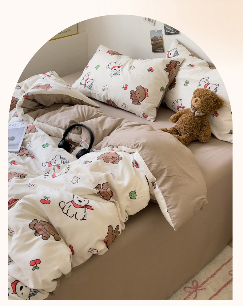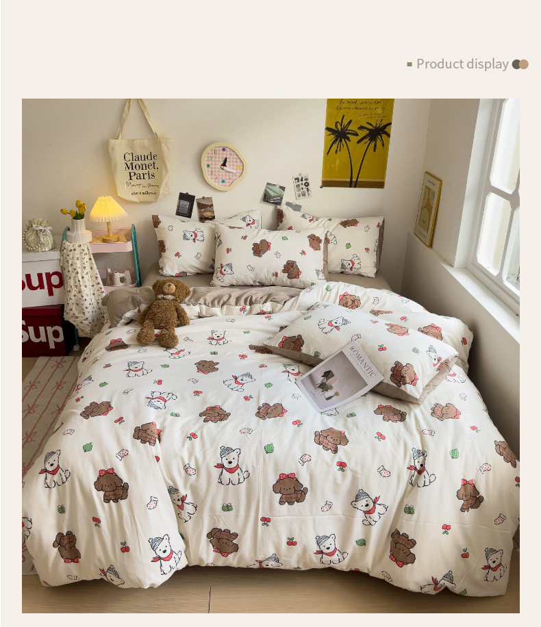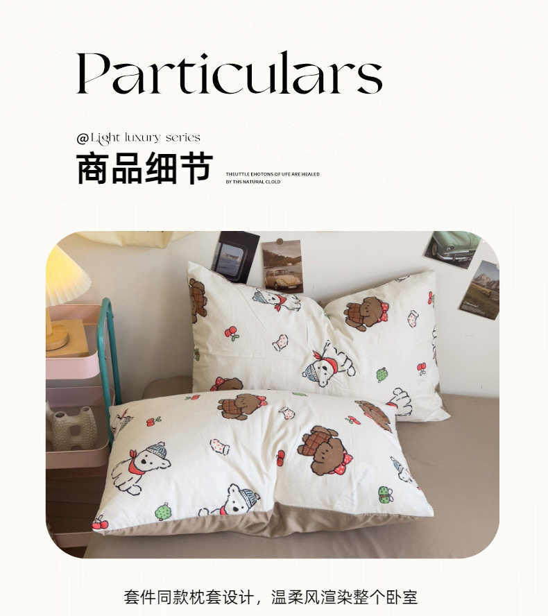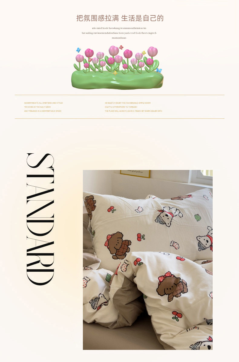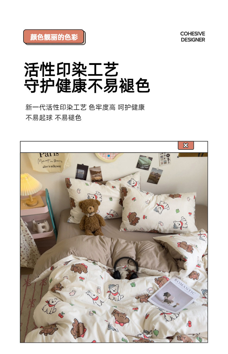 | Size specifications | 1.2 three-piece bed sheet set [quilt cover 150*200],1.5 bed sheet four-piece set [quilt cover 150*200],1.8 bed sheet four-piece set [quilt cover 180*220],2.0 bed sheet four-piece set [quilt cover 200*230],2.2 four-piece bed sheet set [quilt cover 220*240],1.5 fitted sheet set of four [quilt cover 200*230],1.8 fitted sheet set of four [quilt cover 200*230],Single quilt cover [150*200],Single quilt cover [180*220],Single quilt cover [200*230],Single quilt cover [220*240],A pair of pillowcases [48*74] |