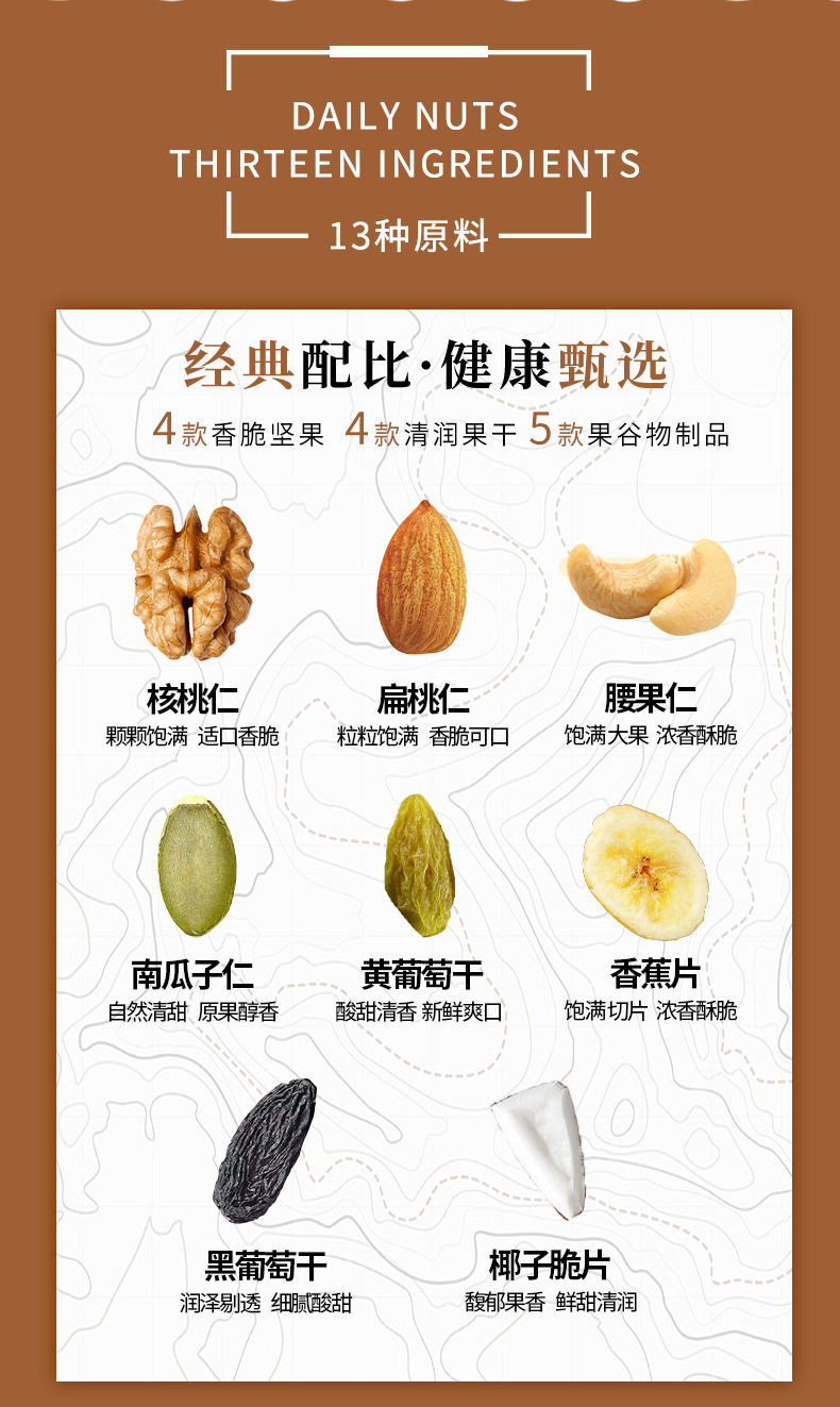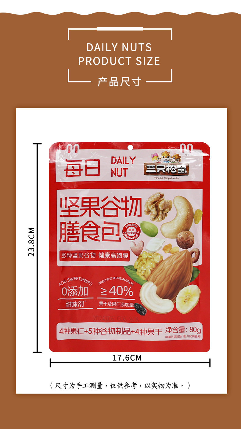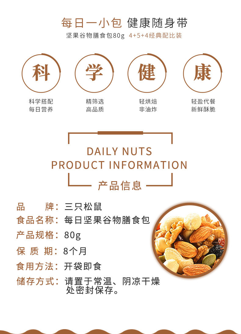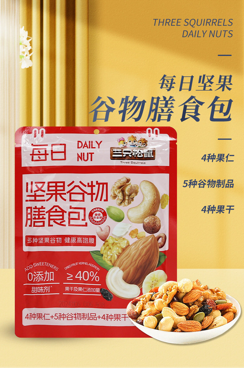 | Packaging specifications | Three squirrels daily nuts cereal meal pack 80gx1 bag,Three squirrels daily nuts cereal meal pack 80gx2 bags,Three squirrels daily nuts cereal meal pack 80gx3 bags,Three squirrels daily nuts cereal meal pack 80gx5 bags,Three squirrels daily nuts cereal meal pack 80gx10 bags |