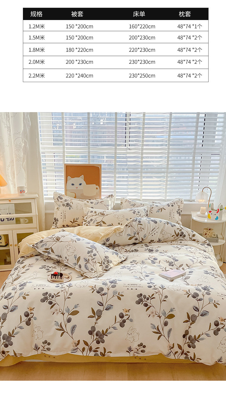 | Size specifications | 1.2m bed sheet three-piece set [quilt cover 150*200cm],1.5m bed sheet four-piece set [quilt cover 150*200cm],1.8m bed sheet four-piece set [quilt cover 180*220cm],2.0m bed sheet four-piece set [quilt cover 200*230cm],2.2m bed sheet four-piece set [quilt cover 220*240cm],Single quilt cover 150*200cm,Single quilt cover 180*220cm,Single quilt cover 200*230cm,Single quilt cover 220*240cm |