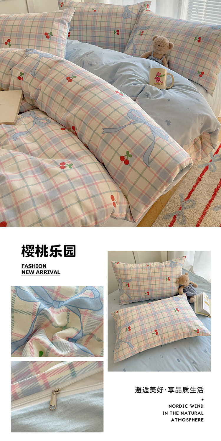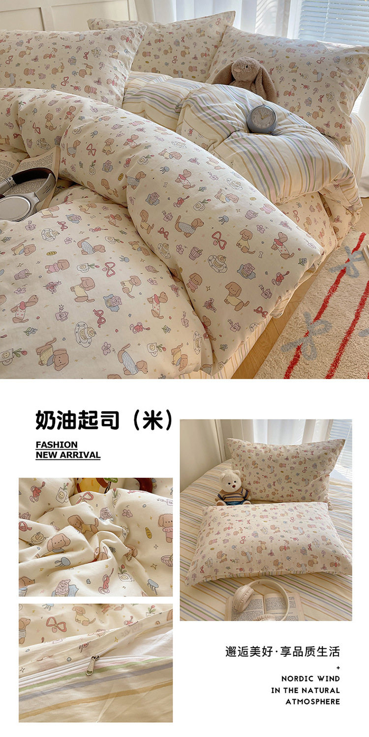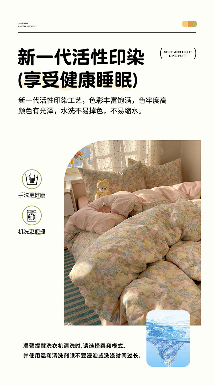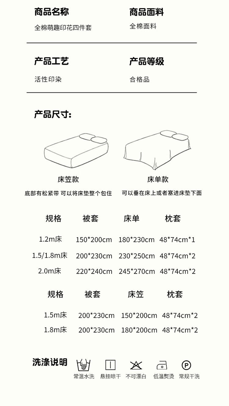 | Size specifications | 1.2m bed sheet three-piece set [quilt cover 150*200],1.5m bed sheet four-piece set [quilt cover 200*230],1.8m bed sheet four-piece set [quilt cover 200*230],1.5m fitted sheet set of four [quilt cover 200*230],1.8m fitted sheet set of four [quilt cover 200*230] |