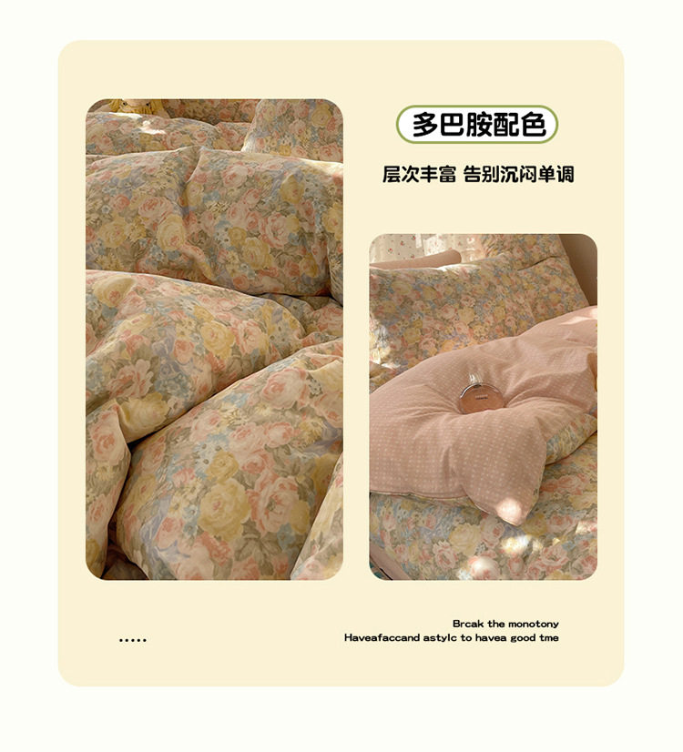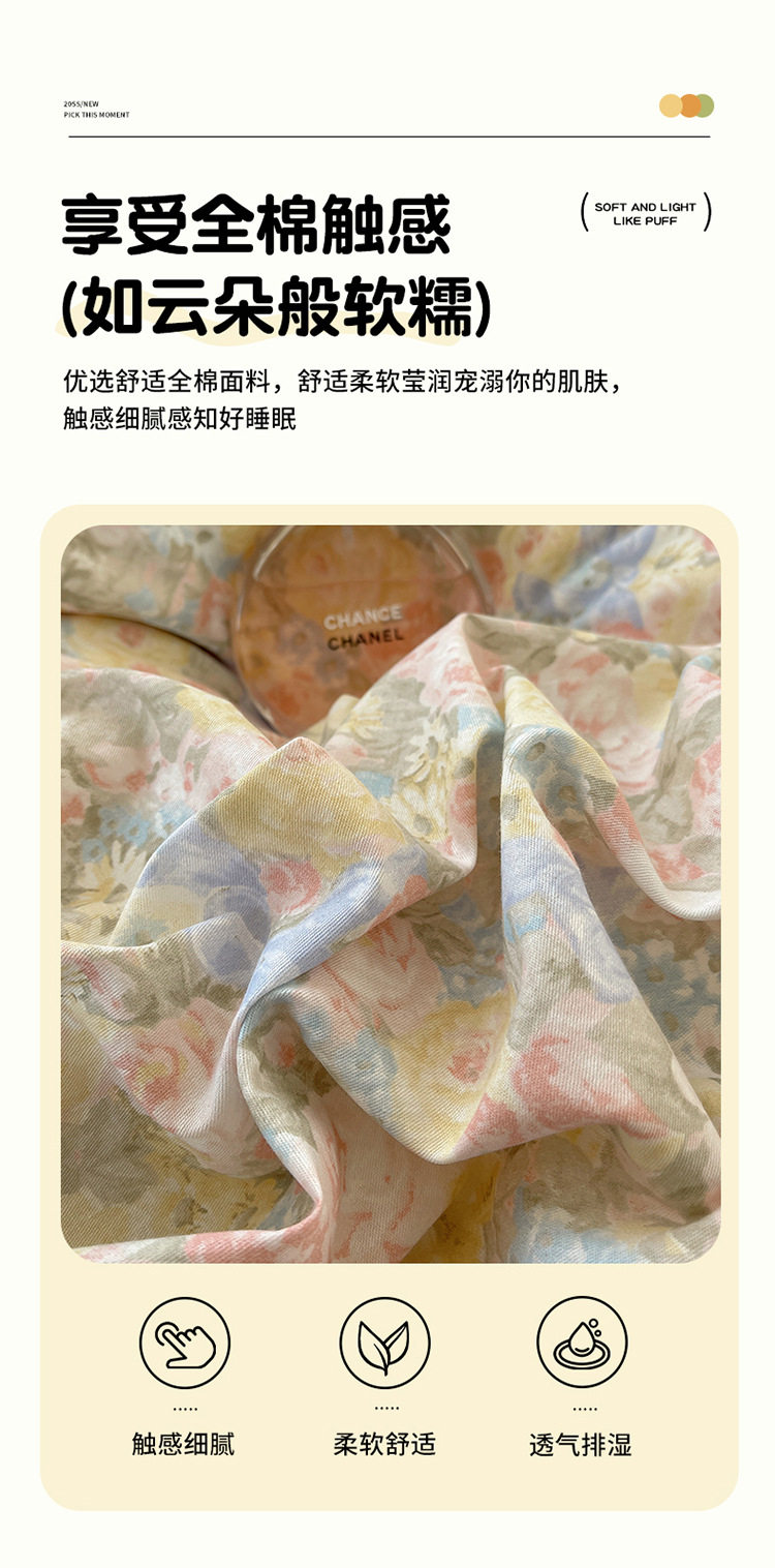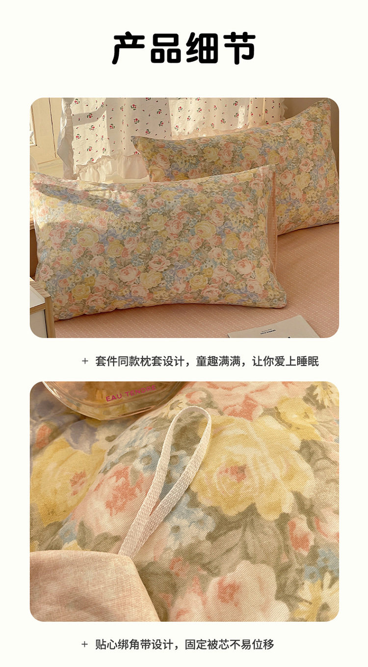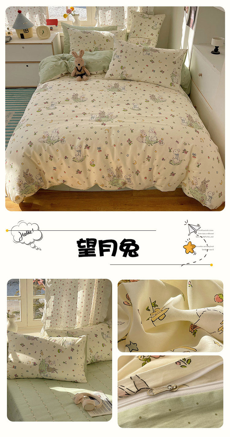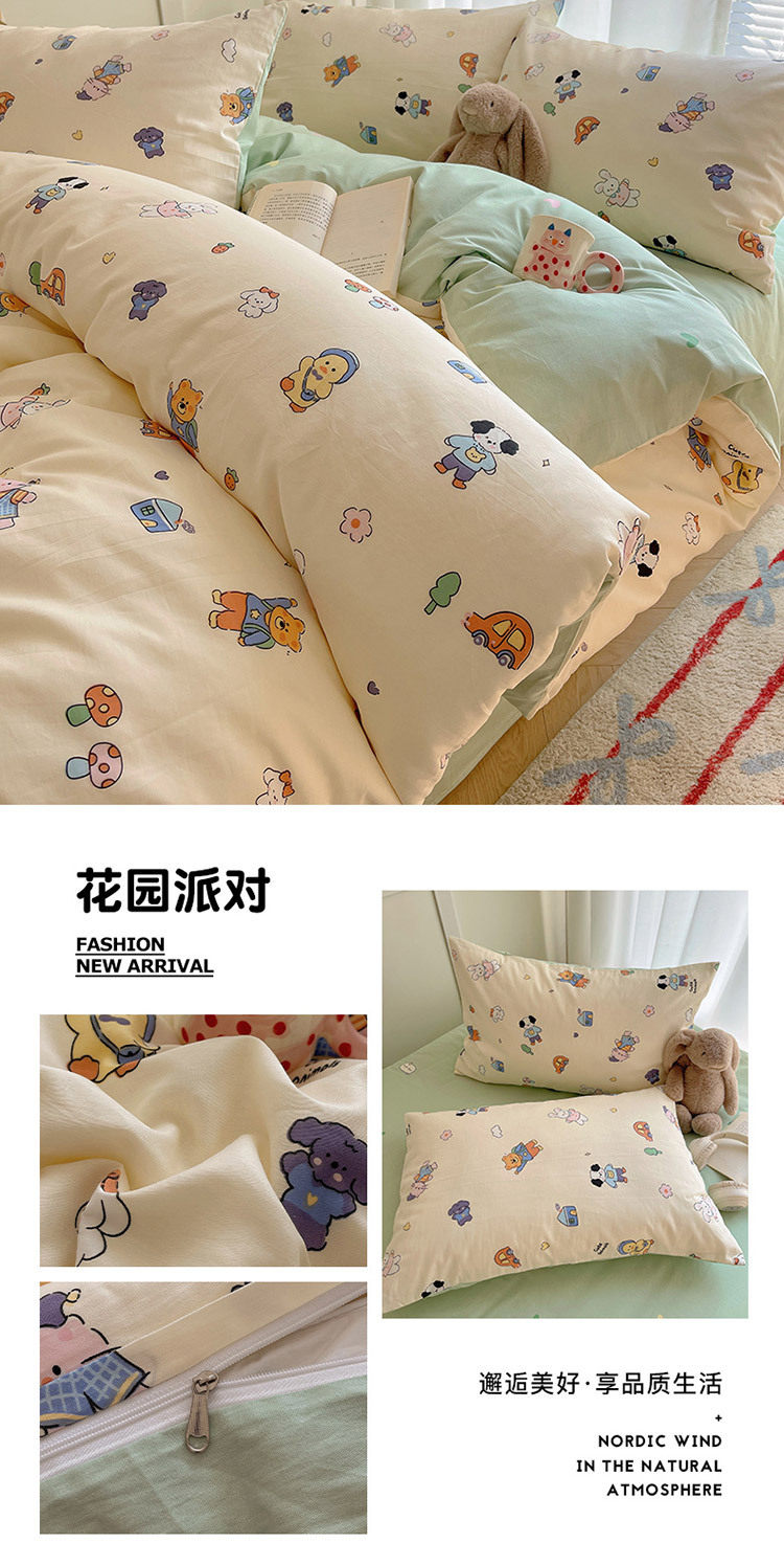 | Size specifications | 1.2m bed sheet three-piece set [quilt cover 150*200],1.5m bed sheet four-piece set [quilt cover 200*230],1.8m bed sheet four-piece set [quilt cover 200*230],1.5m fitted sheet set of four [quilt cover 200*230],1.8m fitted sheet set of four [quilt cover 200*230] |