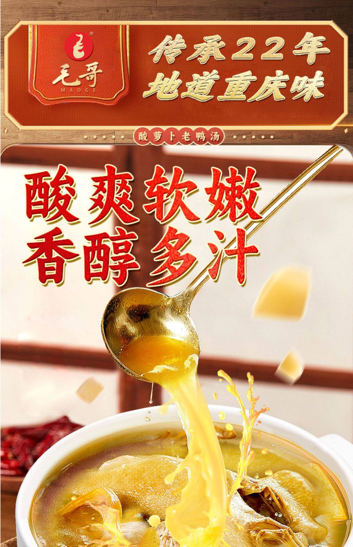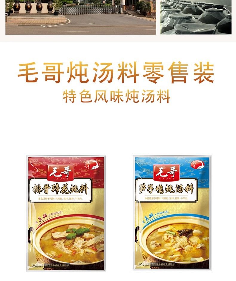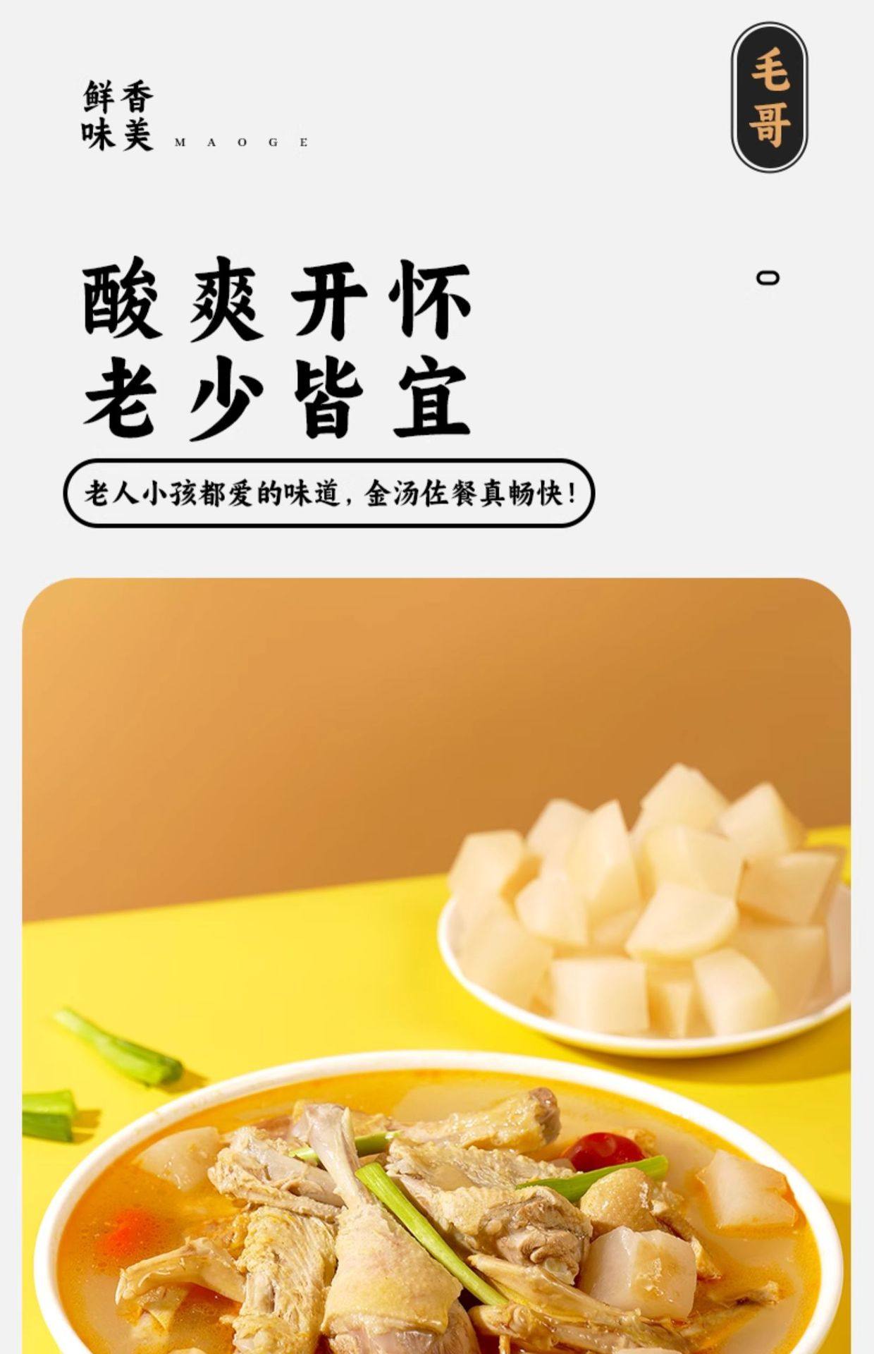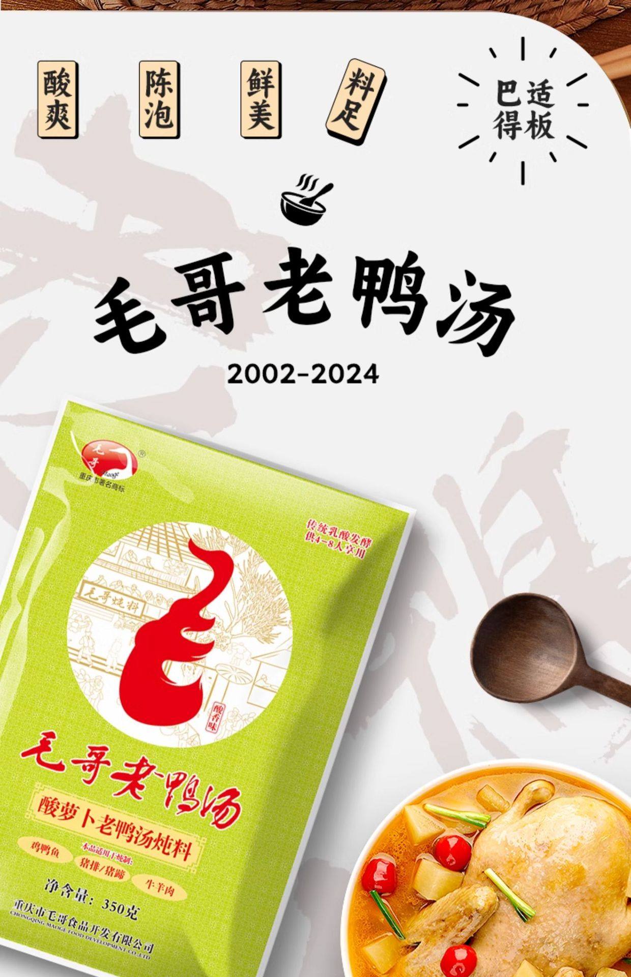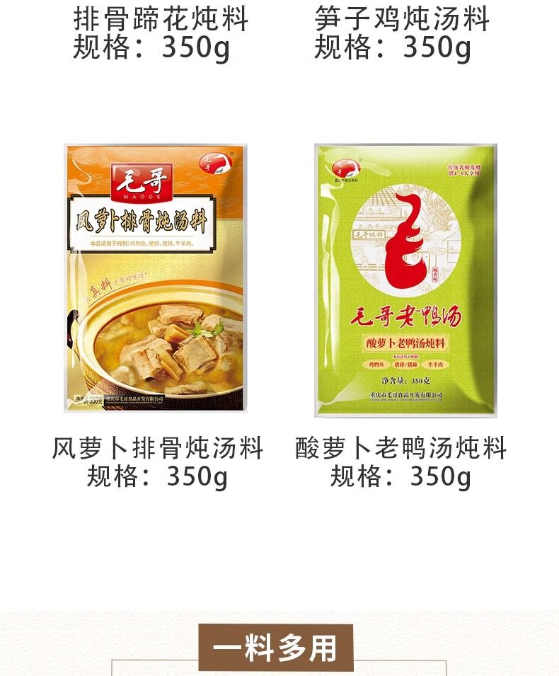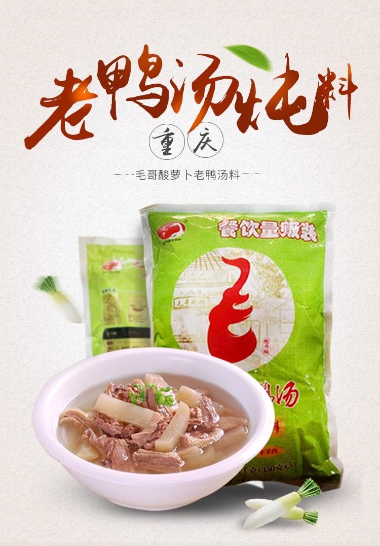 | Packaging specifications | Maoge pickled radish and duck soup 150g,Mao ge pickled radish and duck soup 240g,Mao ge pickled radish and duck soup 350g,Mao ge pickled radish duck soup 400g,Mao ge catering sour radish and duck soup 1500g,Mao ge's limited edition pickled radish and duck soup 1.75kg,Maoge style radish ribs 350g,Maoge bamboo shoot chicken 350g,Maoge pork ribs and hoof flowers 350g,Maoge fish pickled cabbage 400g |