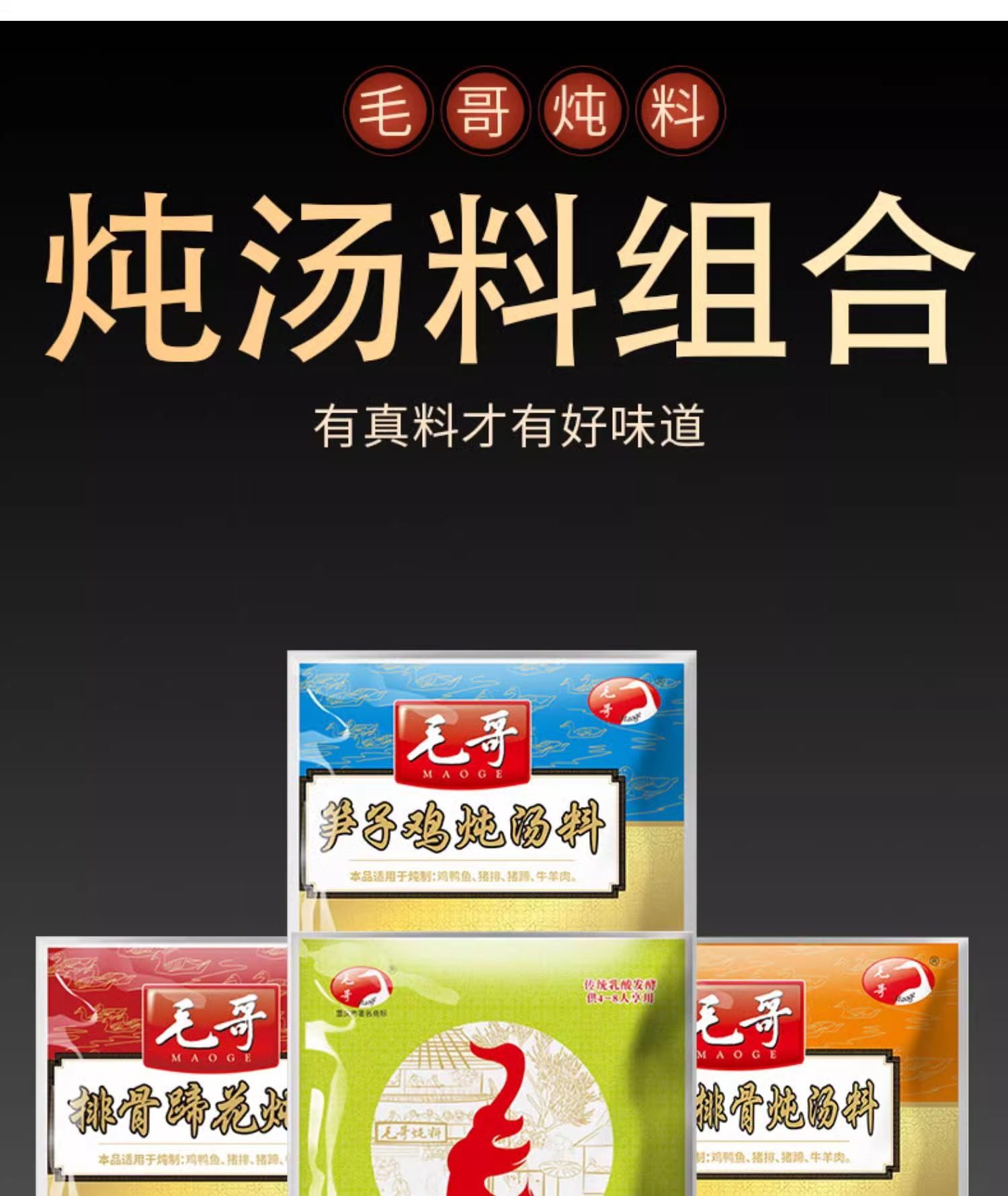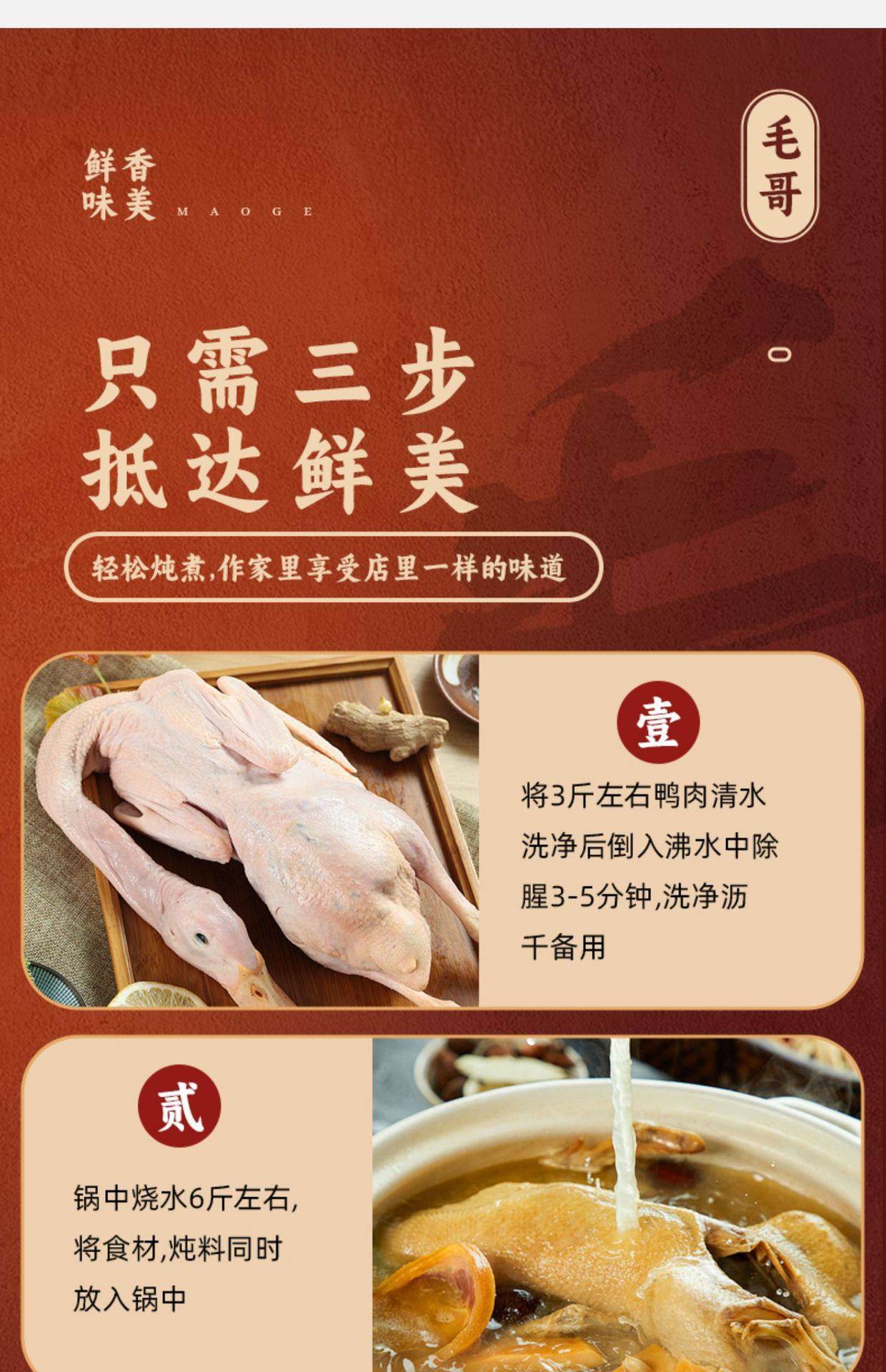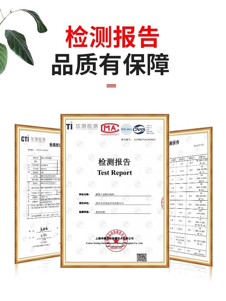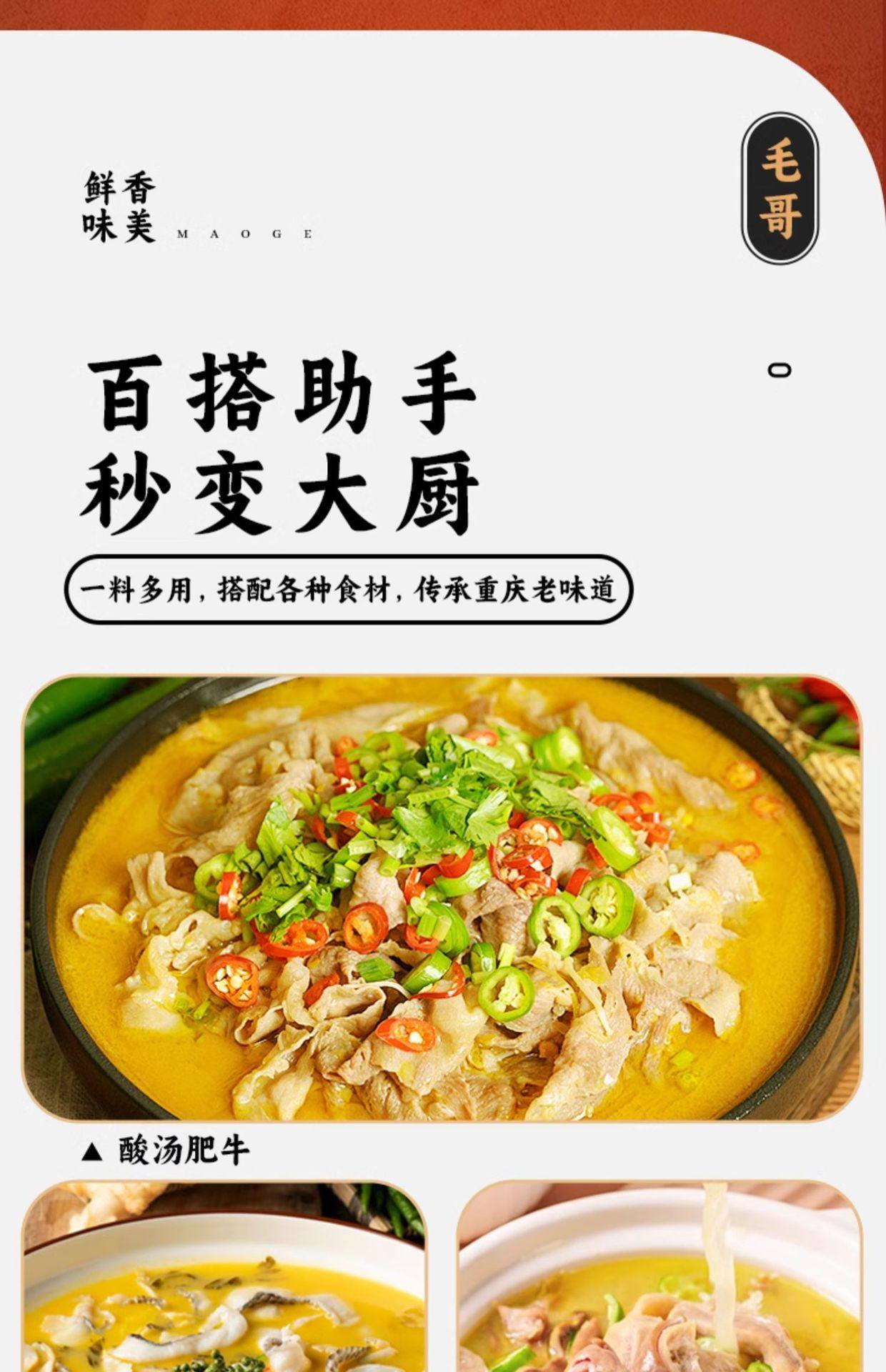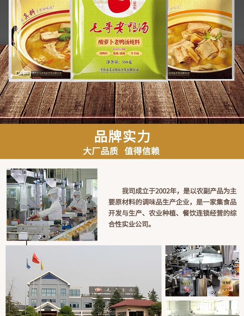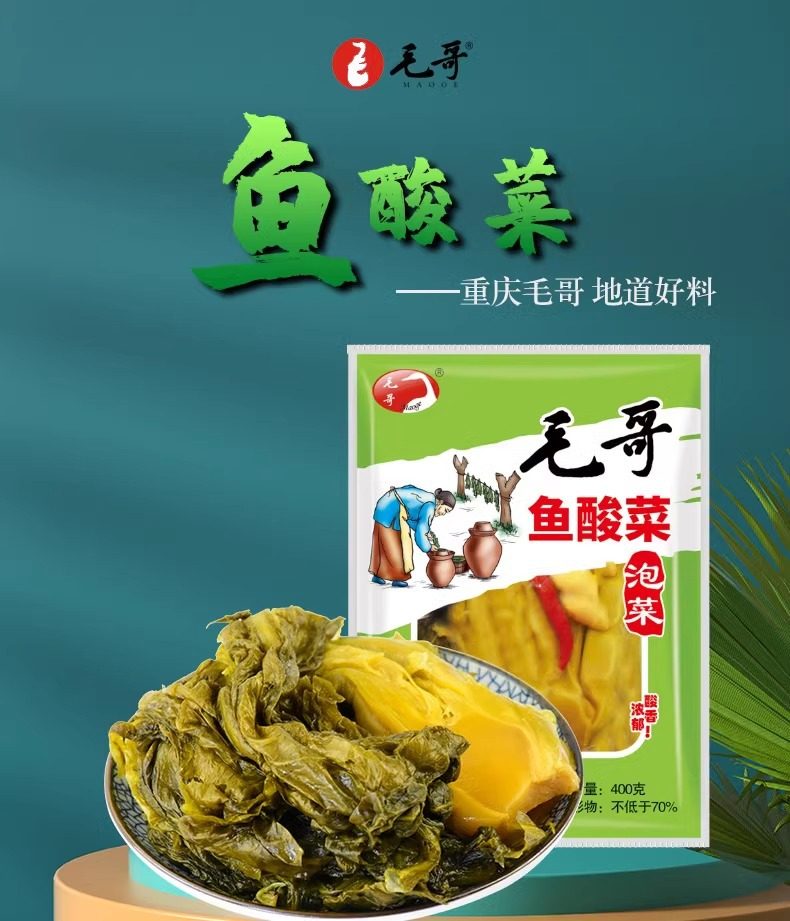 | Packaging specifications | Maoge pickled radish and duck soup 150g,Mao ge pickled radish and duck soup 240g,Mao ge pickled radish and duck soup 350g,Mao ge pickled radish duck soup 400g,Mao ge catering sour radish and duck soup 1500g,Mao ge's limited edition pickled radish and duck soup 1.75kg,Maoge style radish ribs 350g,Maoge bamboo shoot chicken 350g,Maoge pork ribs and hoof flowers 350g,Maoge fish pickled cabbage 400g |