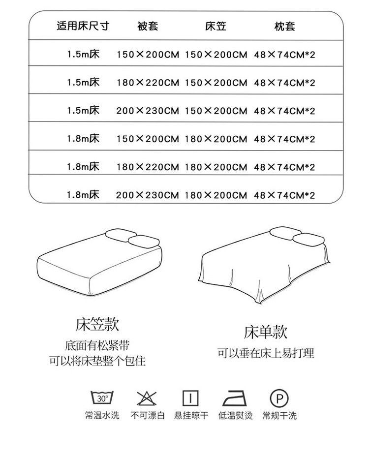 | Dimensions | 0.9m dormitory bed sheet [quilt cover 150*200] three-piece set,1.2m dormitory bed sheet [quilt cover 150*200] three-piece set,1.5m bed sheet [quilt cover 150*200] four-piece set,1.5m bed sheet [quilt cover 180*220] four-piece set,1.5m bed sheet [quilt cover 200*230] four-piece set,1.8m bed sheet [quilt cover 200*230] four-piece set,2.0m bed sheet [quilt cover 200*230] four-piece set,1.5m fitted sheet [quilt cover 150*200] four-piece set,1.5m fitted sheet [quilt cover 180*220] four-piece set,1.5m fitted sheet [quilt cover 200*230] four-piece set,1.8m fitted sheet [quilt cover 180*220] four-piece set,1.8m fitted sheet [quilt cover 200*230] four-piece set |