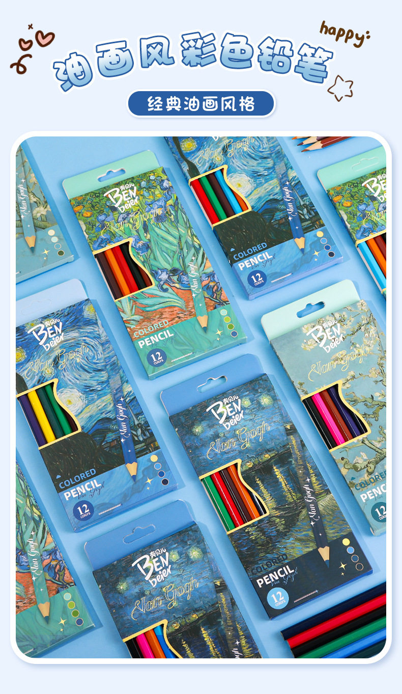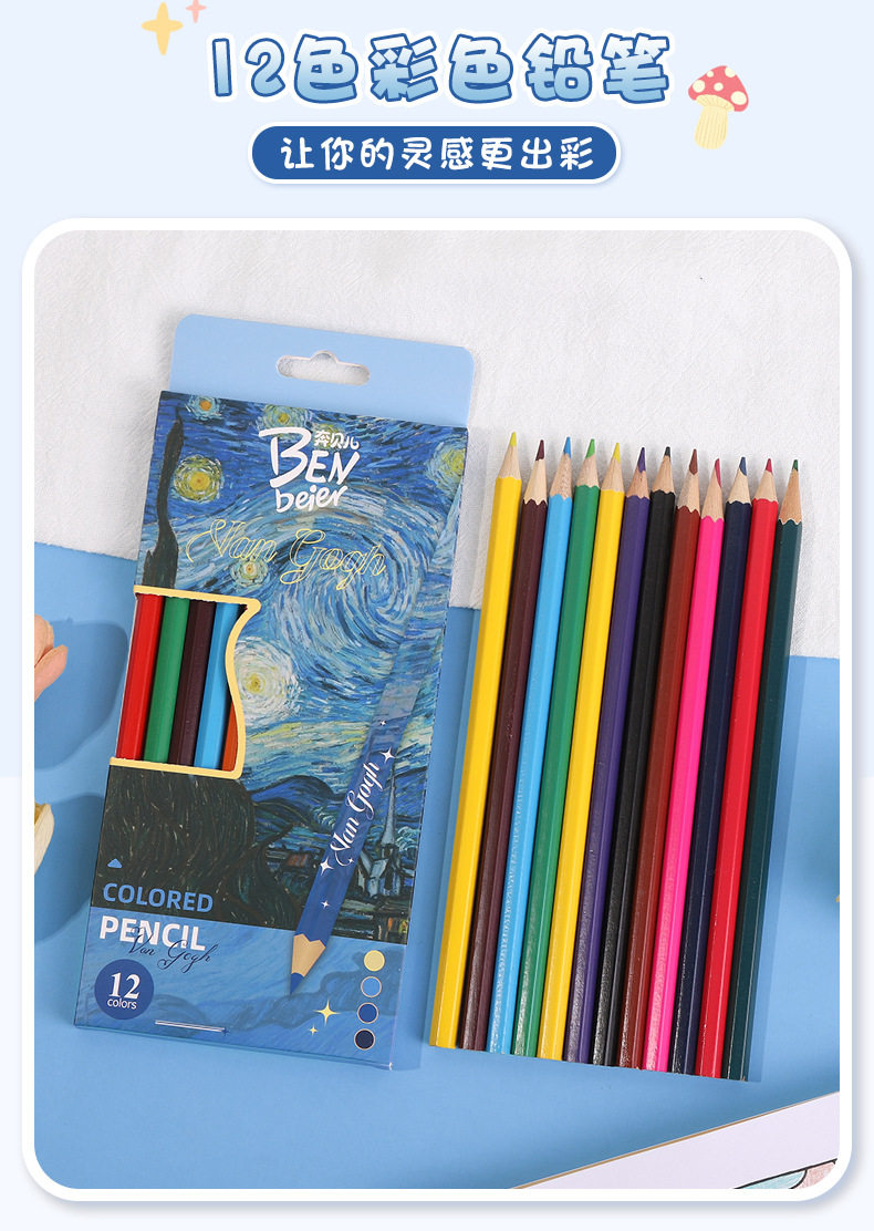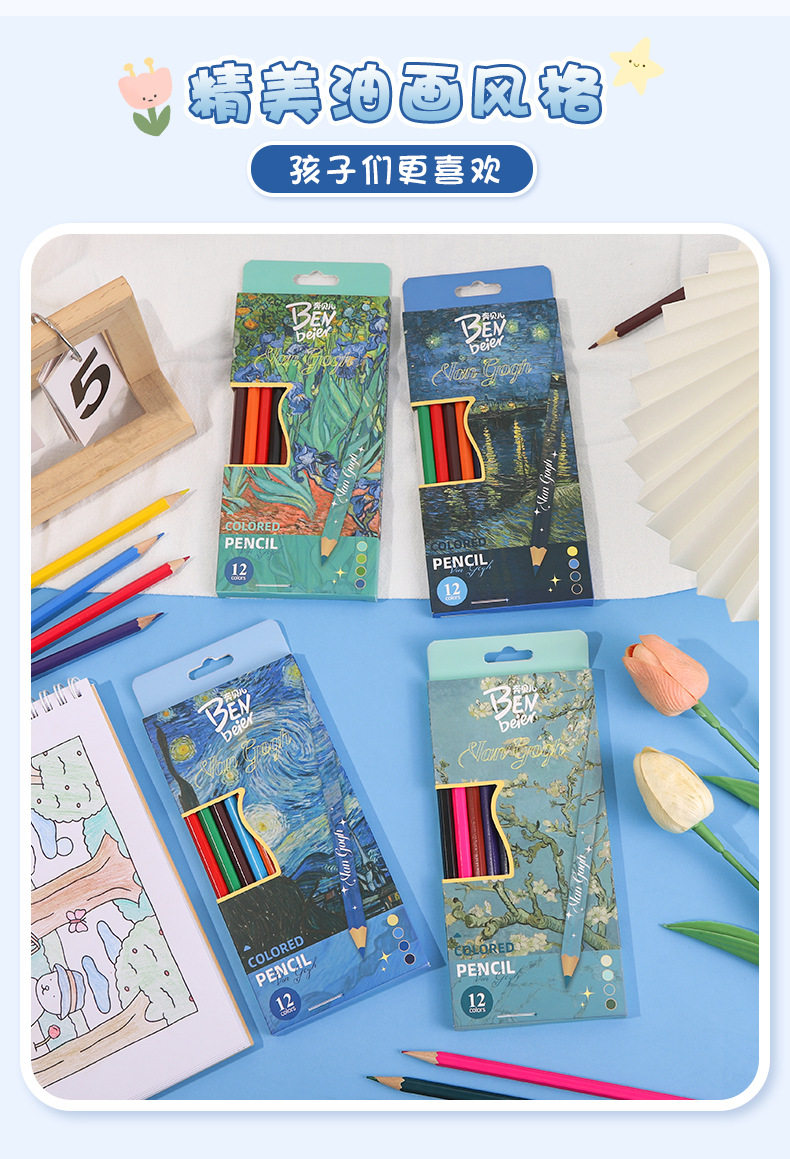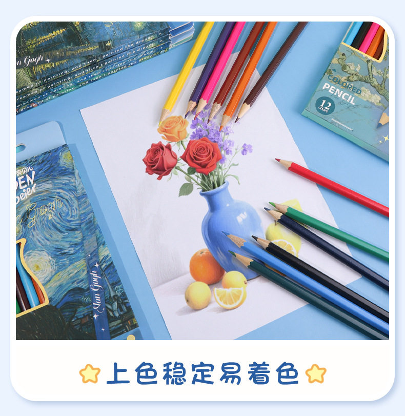 New Van Gogh Series Boxed Colorfuled Lead Student-Specific Learning Stationery Art Painting Colorfuled Pencils 12 Pieces Wholesale