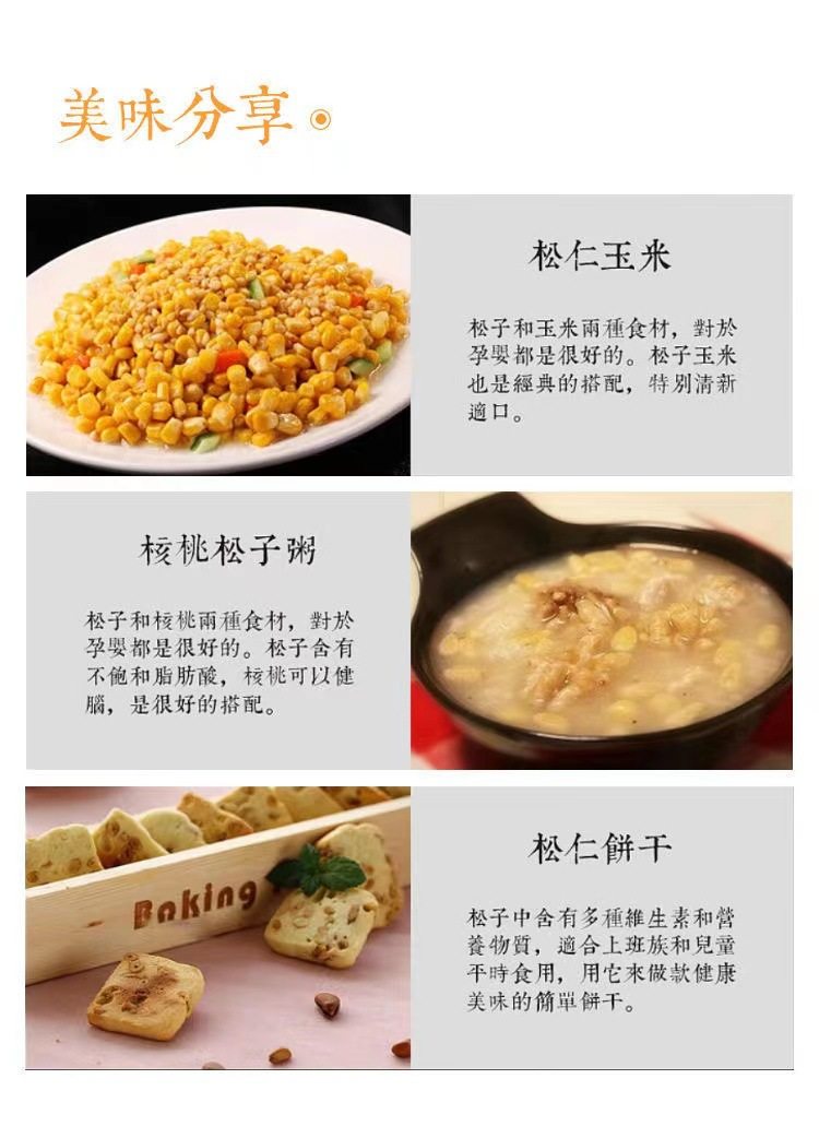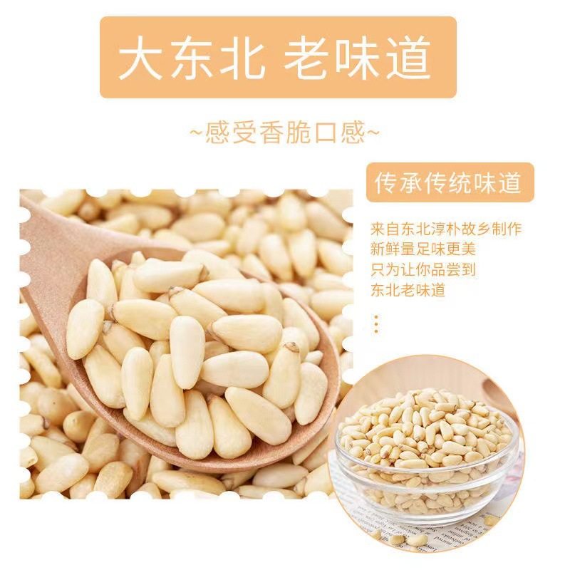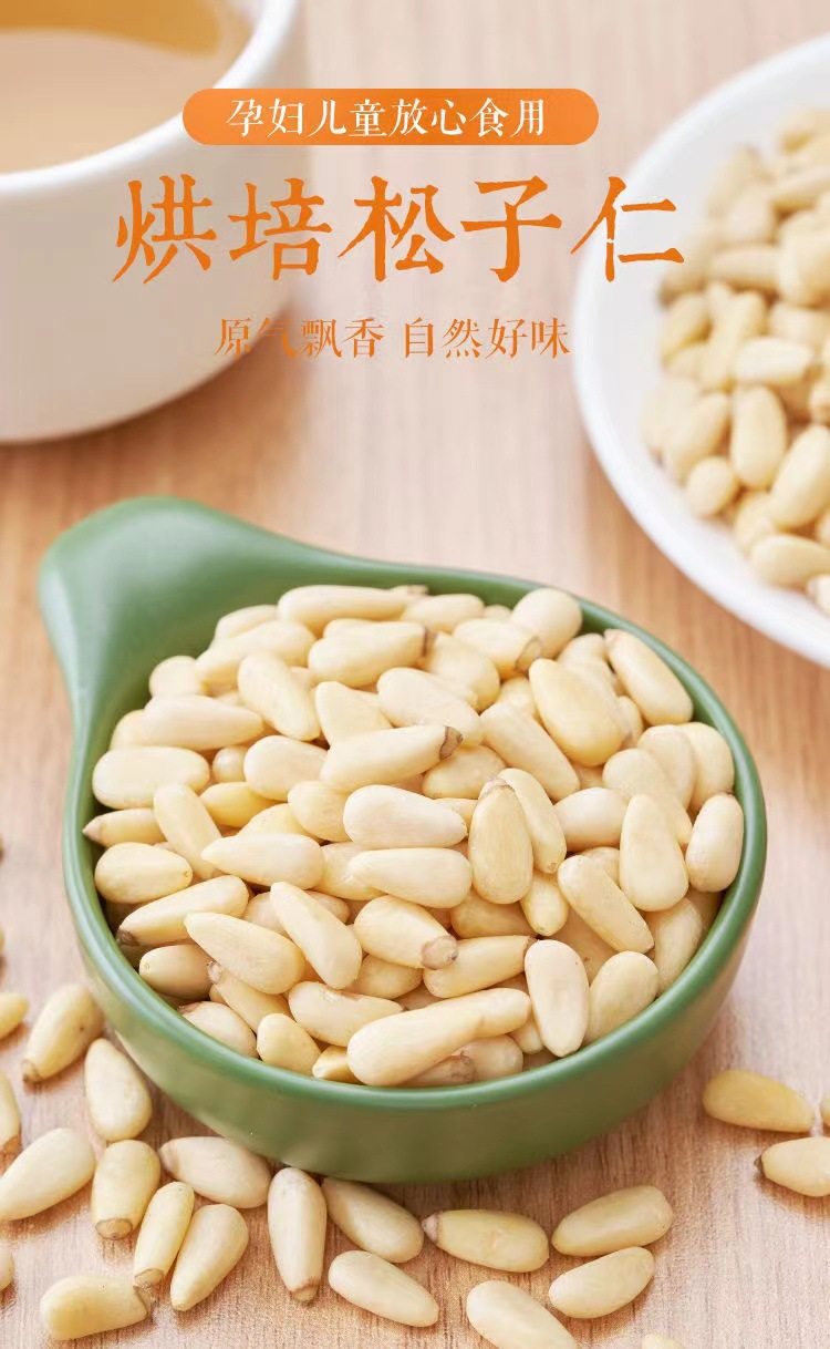 | Packaging specifications | [medium grains] raw pine nuts 250g,[medium grains] raw pine nuts 500g,[small particles] raw pine nuts 250g,[small particles] raw pine nuts 500g,[large particles] raw pine nuts 250g,Medium capsules raw pine nut kernels 205g net content per can,[large particles] raw pine nuts 500g |