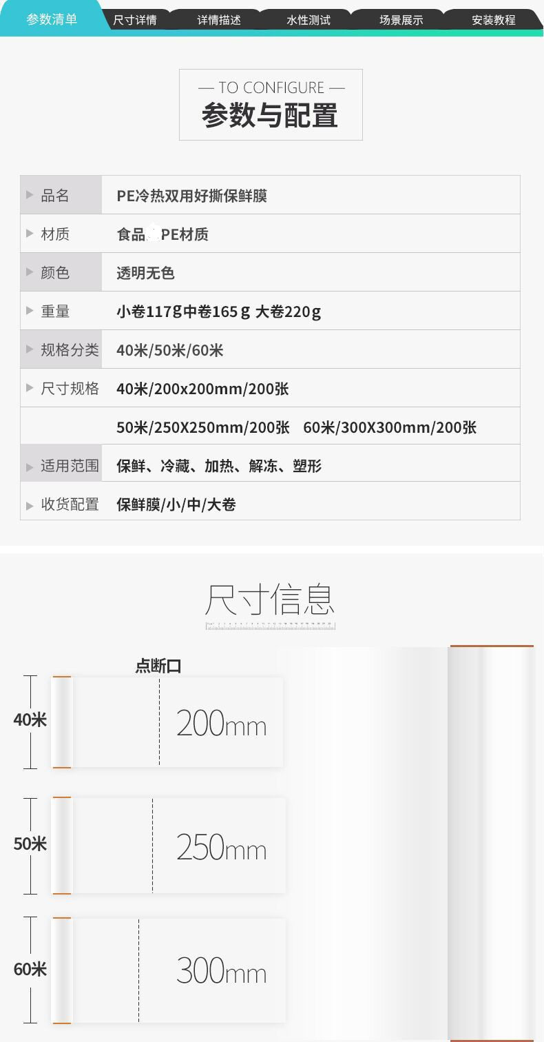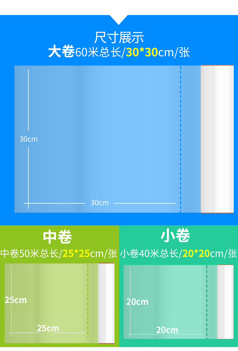 | Size | 20*20cm*200 pieces/40m,25*25cm*200 pieces/50m,30*30cm*200 pieces/60m,20cm*30m ordinary plastic wrap,25cm*30m ordinary plastic wrap,25cm*50m ordinary plastic wrap,30cm*30m ordinary plastic wrap,30cm*50m ordinary plastic wrap,30cm*100m ordinary plastic wrap |