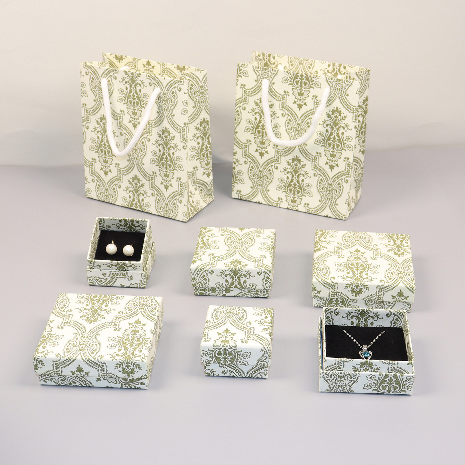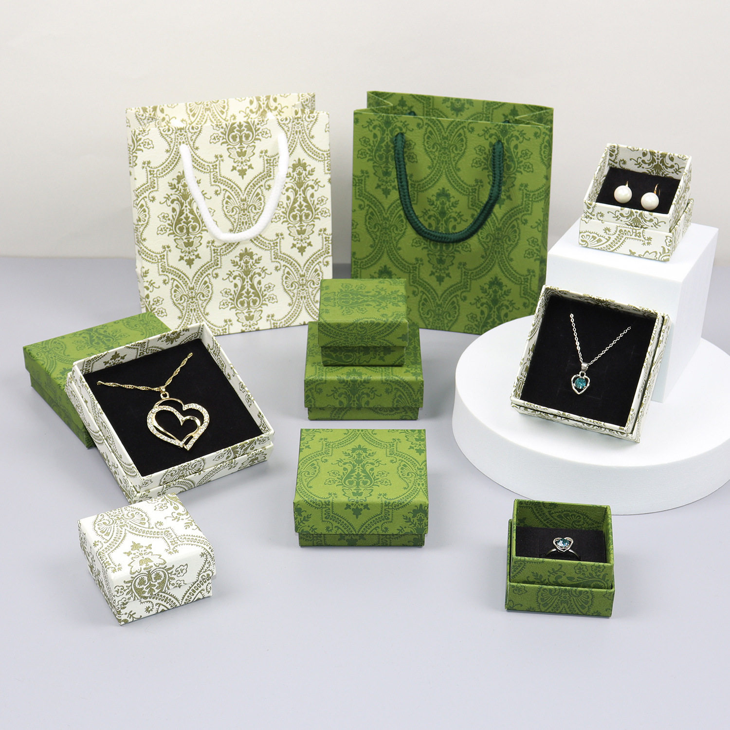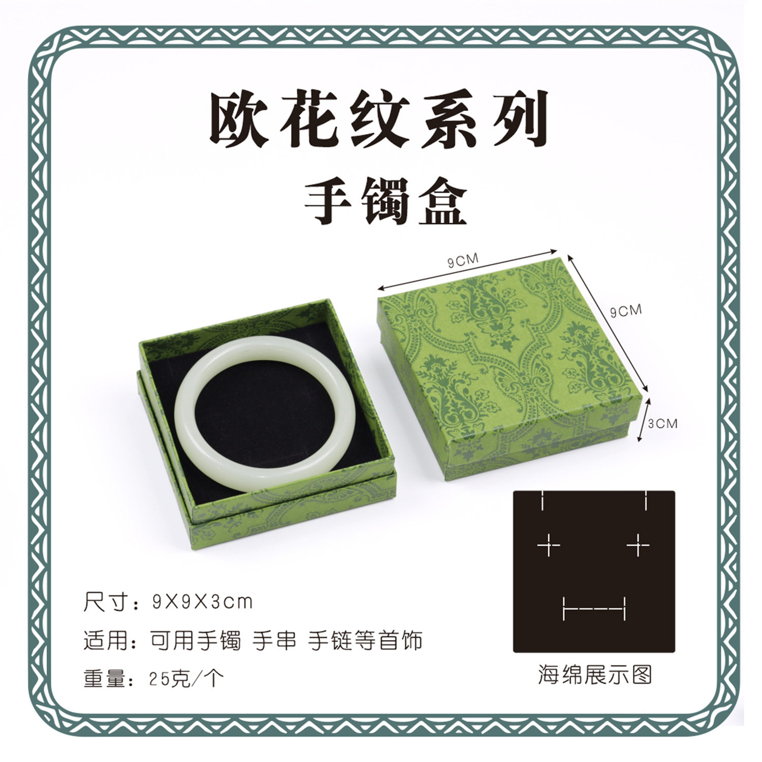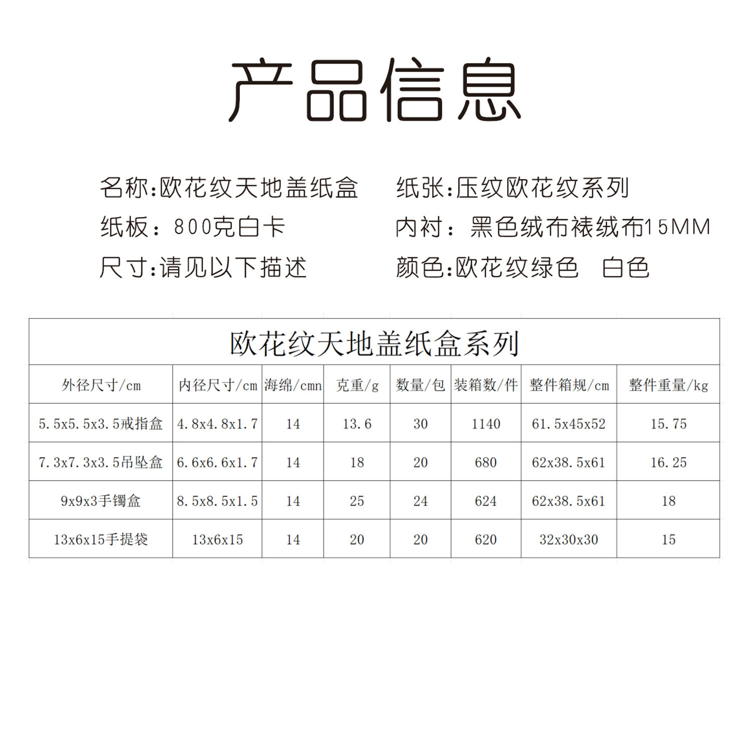 | Specifications and models | Green ring box 5.5*5.5*3.5; european pattern,Green pendant box 7.3*7.3*3.5; european pattern,Green bracelet box 9*9*3; european pattern,Green bag 13*15*6; european pattern,White ring box 5.5*5.5*3.5; european pattern,White pendant box 7.3*7.3*3.5; european pattern,White bracelet box 9*9*3; european pattern,White bag 13*15*6; european pattern |