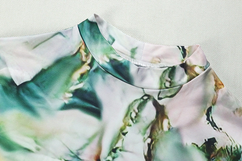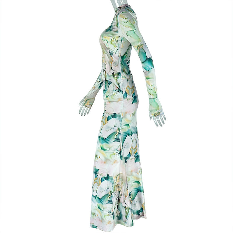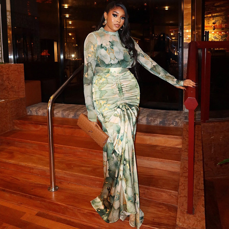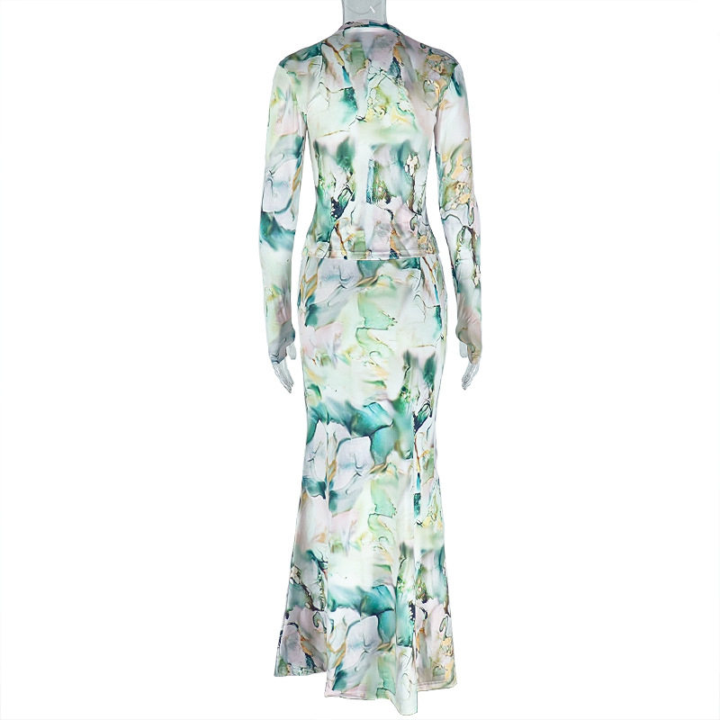 European and American-style Cross-border Printed Waist-wrapped Slim Dress suit Pleated Long Dress High Collar Fashion Two-piece Casual Commuter Women's Clothing