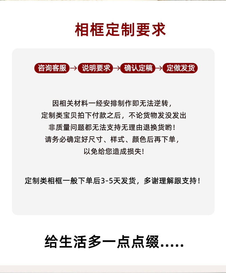 | Inner frame size | Solid wood-beveled style,Solid wood-1919 flat style,Solid wood-3020 european style,Solid wood-1528 plane,Aluminum alloy-0919 plane,Solid wood—rounded corner photo frame,Solid wood-tile photo frame,Solid wood—double-sided glass suspension frame,Solid wood-hollow photo frame,Artificial board-double-sided glass suspended photo frame,Card customization,Photo frame engraving logo |