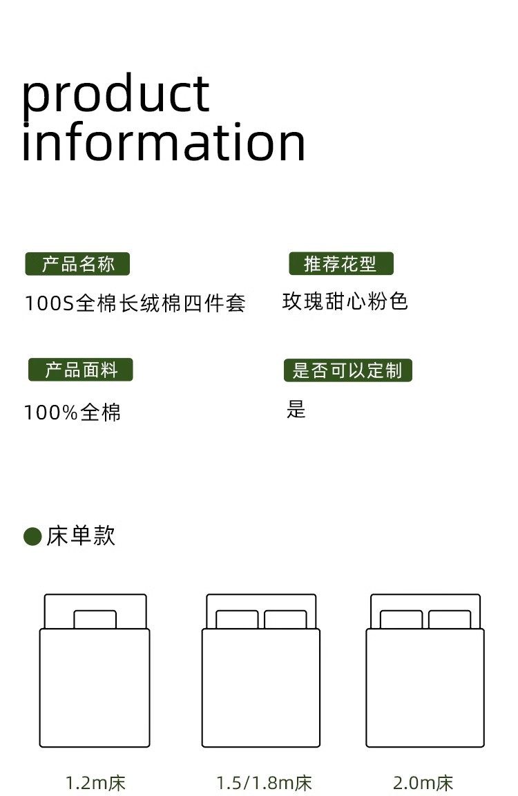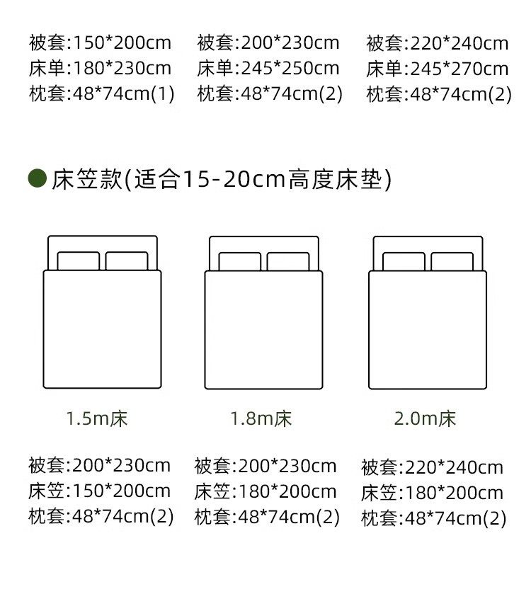 | Dimensions | 1.2m bed sheet three-piece set (suitable for quilt core 150*200cm),1.5m bed sheet four-piece set (suitable for quilt core 200*230cm),1.8m bed sheet four-piece set (suitable for quilt core 200*230cm),2.0m bed sheets four-piece set (suitable for quilt core 220*240cm),1.5m fitted sheet set of four (suitable for quilt core 200*230cm),1.8m fitted sheet set of four (suitable for quilt core 200*230cm),1.8m fitted sheet quilt cover with enlarged four-piece set (suitable for quilt core 220*240cm) |