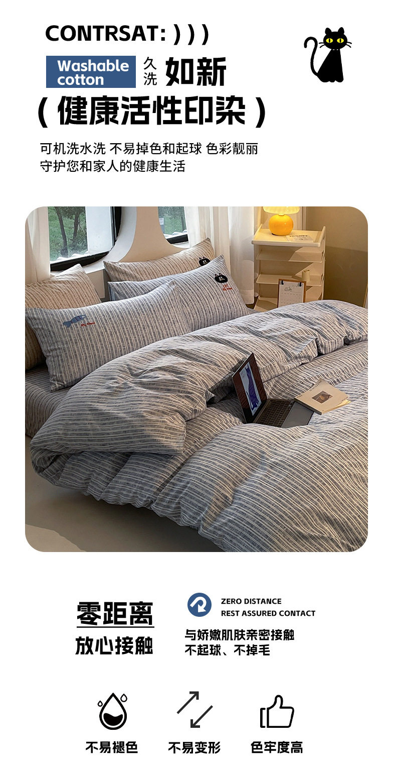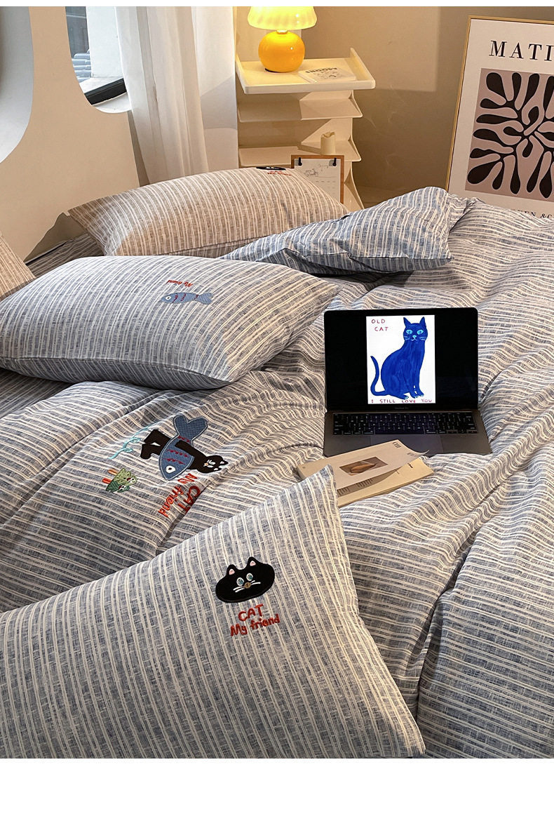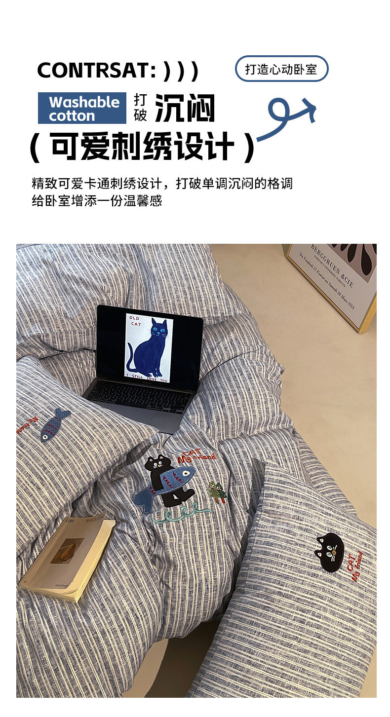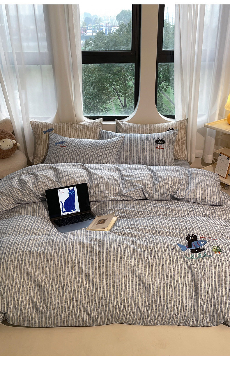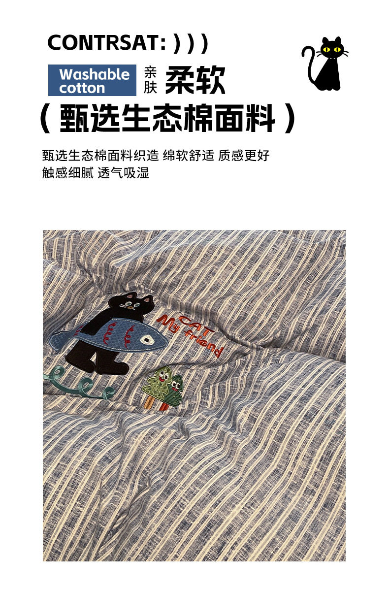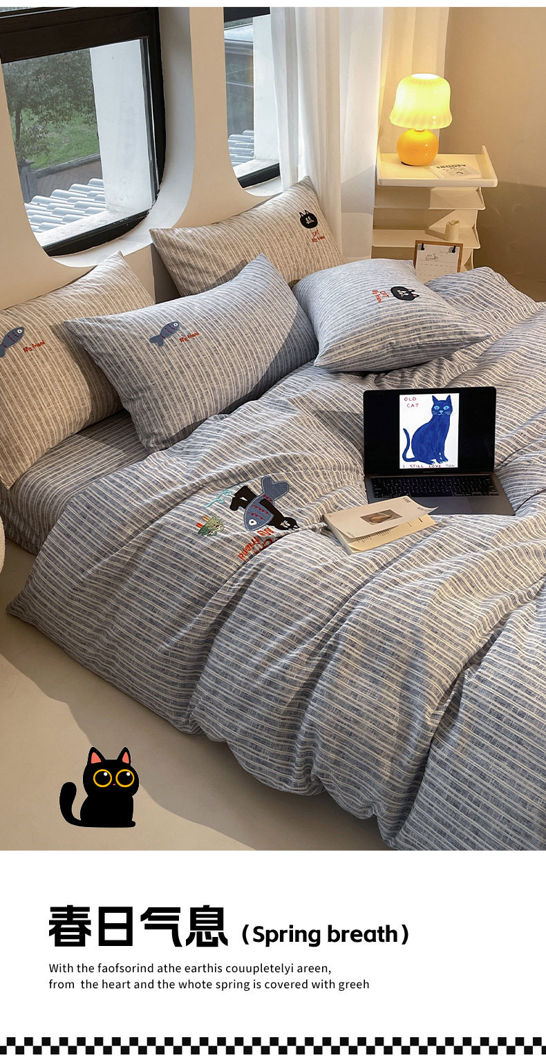 New four seasons ecological cotton and linen embroidery four-piece bed sheet-small black cat cartoon ins wind student three-piece set