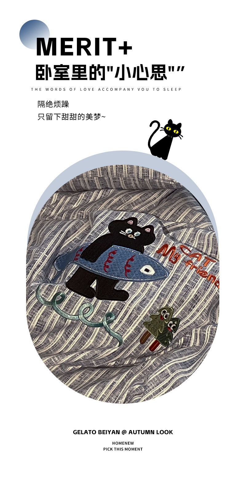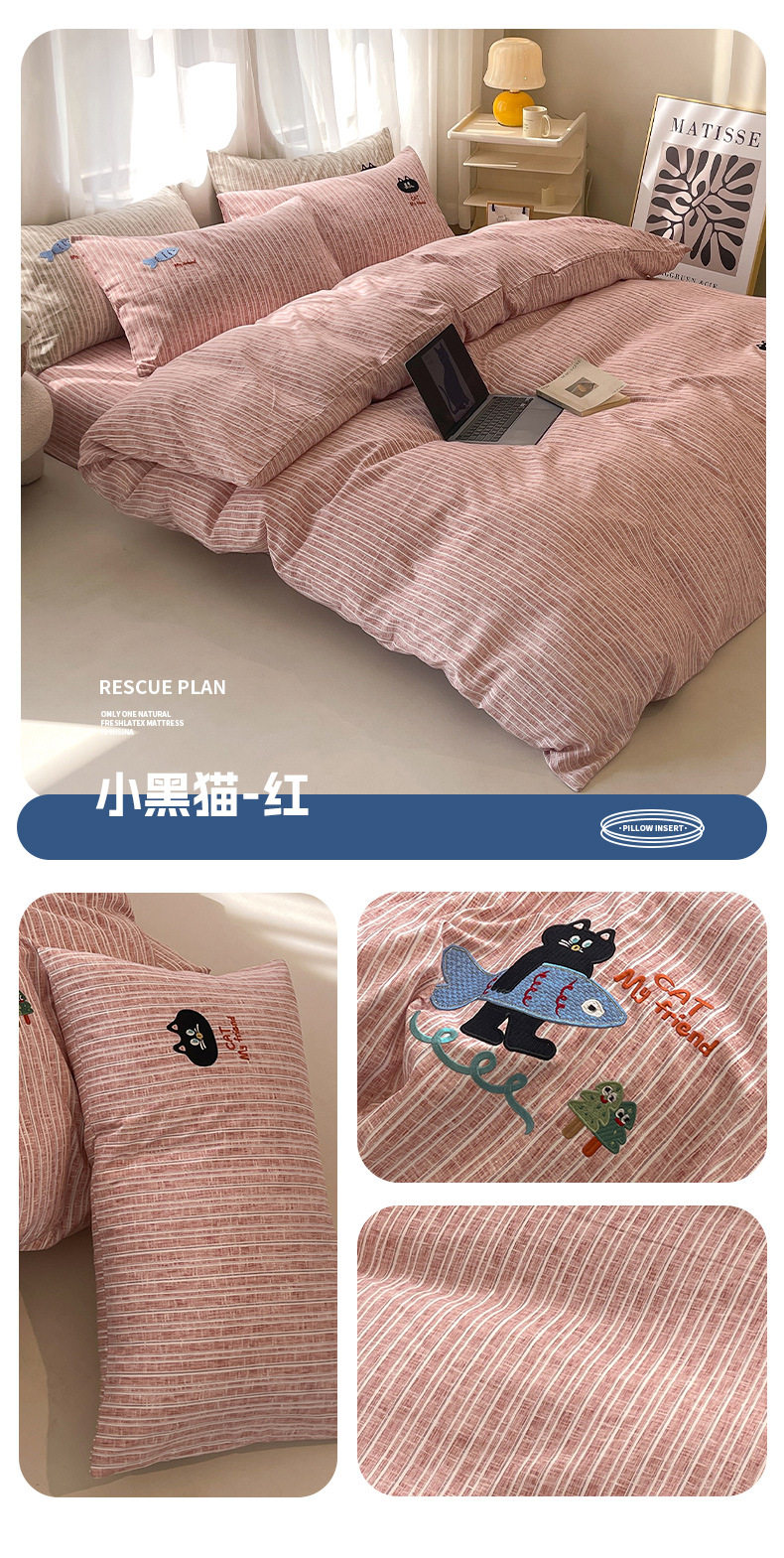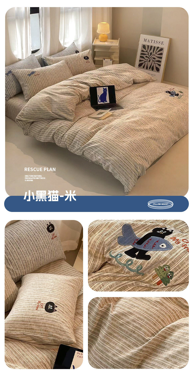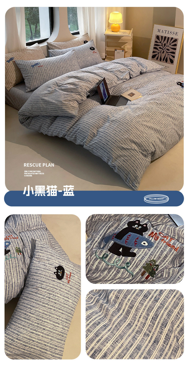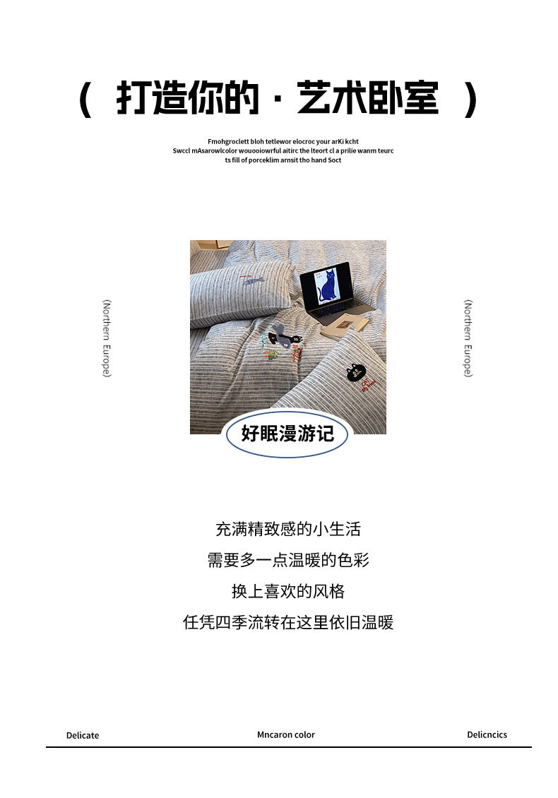 New four seasons ecological cotton and linen embroidery four-piece bed sheet-small black cat cartoon ins wind student three-piece set