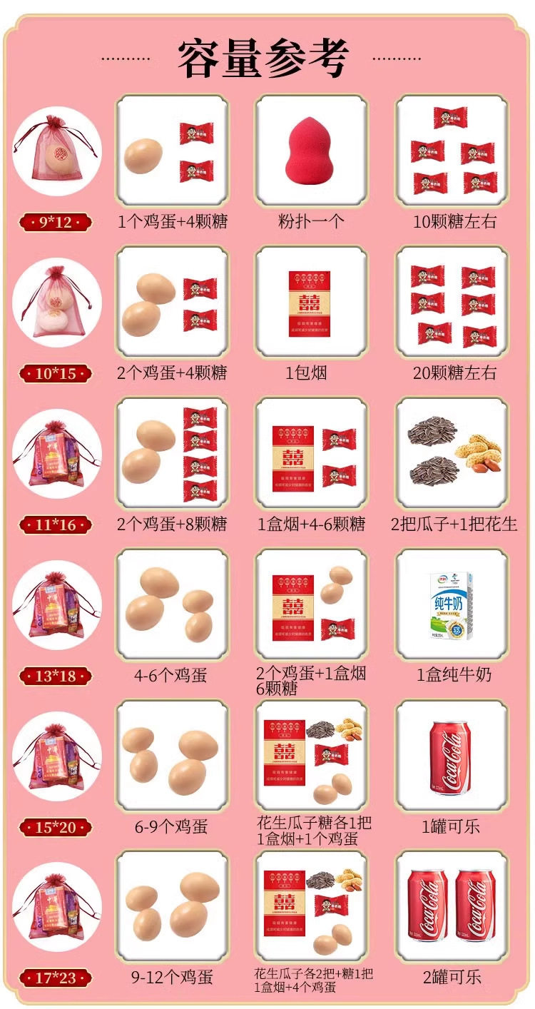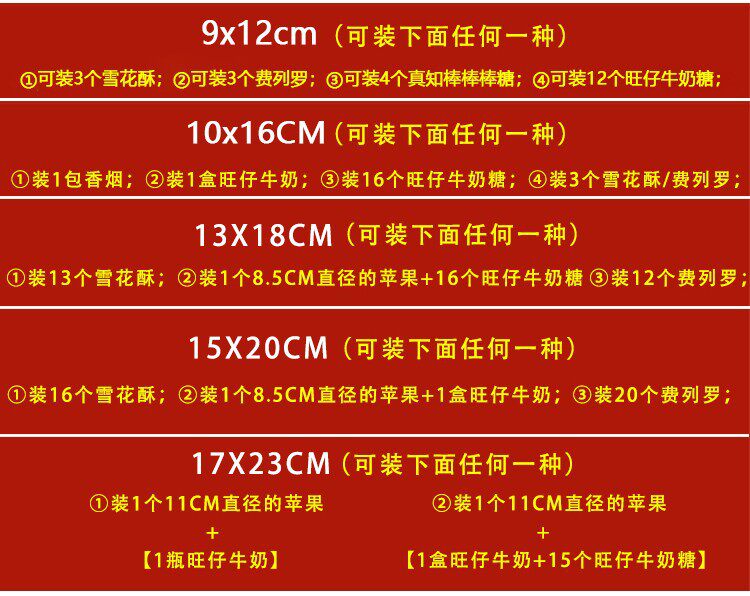 | Specifications and models | Golden chinese style randomly mixed [burgundy yarn]; 9*12cm [can hold 1 egg],Golden chinese style randomly mixed [burgundy yarn]; 11*16cm [can hold 1 pack of cigarettes],Golden chinese style randomly mixed [burgundy yarn]; 13*18cm [can hold 2 packs of cigarettes],Golden chinese style randomly mixed [burgundy yarn]; 15*20cm [can hold 1 apple],Golden chinese style randomly mixed [burgundy yarn]; 17*23cm [can hold 6 packs of cigarettes],Golden chinese style randomly mixed [burgundy yarn]; 20*30cm [can hold 8 packs of cigarettes],Golden national style-good luck [burgundy yarn]; 9*12cm [can hold 1 egg],Golden national style-good luck [burgundy yarn]; 11*16cm [can hold 1 pack of cigarettes],Golden national style-good luck [burgundy yarn]; 13*18cm [can hold 2 packs of cigarettes],Golden national style-good luck [burgundy yarn]; 15*20cm [can hold 1 apple],Golden national style-good luck [burgundy yarn]; 17*23cm [can hold 6 packs of cigarettes],Golden national style-good luck [burgundy yarn]; 20*30cm [can hold 8 packs of cigarettes],Golden national style-ruyi [burgundy yarn]; 9*12cm [can hold 1 egg],Golden national style-ruyi [burgundy yarn]; 11*16cm [can hold 1 pack of cigarettes],Golden national style-ruyi [burgundy yarn]; 13*18cm [can hold 2 packs of cigarettes],Golden national style-ruyi [burgundy yarn]; 15*20cm [can hold 1 apple],Golden national style-ruyi [burgundy yarn]; 17*23cm [can hold 6 packs of cigarettes],Golden national style-ruyi [burgundy yarn]; 20*30cm [can hold 8 packs of cigarettes],Golden national style-shunshui [burgundy yarn]; 9*12cm [can hold 1 egg],Golden national style-shunshui [burgundy yarn]; 11*16cm [can hold 1 pack of cigarettes],Golden national style-shunshui [burgundy yarn]; 13*18cm [can hold 2 packs of cigarettes],Golden national style-shunshui [burgundy yarn]; 15*20cm [can hold 1 apple],Golden national style-shunshui [burgundy yarn]; 17*23cm [can hold 6 packs of cigarettes],Golden national style-shunshui [burgundy yarn]; 20*30cm [can hold 8 packs of cigarettes],Golden national style-changle [wine red gauze]; 9*12cm [can hold 1 egg],Golden national style-changle [wine red yarn]; 11*16cm [can hold 1 pack of cigarettes],Golden national style-changle [wine red yarn]; 13*18cm [can hold 2 packs of cigarettes],Golden national style-changle [wine red gauze]; 15*20cm [can hold 1 apple],Golden national style-changle [wine red yarn]; 17*23cm [can hold 6 packs of cigarettes],Golden national style-changle [burgundy yarn]; 20*30cm [can hold 8 packs of cigarettes],Golden national style - joy [burgundy gauze]; 9*12cm [can hold 1 egg];,Golden national style-happiness [burgundy yarn]; 11*16cm [can hold 1 pack of cigarettes],Golden national style-happiness [burgundy yarn]; 13*18cm [can hold 2 packs of cigarettes],Golden national style - joy [burgundy gauze]; 15*20cm [can hold 1 apple],Golden national style-happiness [burgundy yarn]; 17*23cm [can hold 6 packs of cigarettes],Golden national style - joy [burgundy yarn]; 20*30cm [can hold 8 packs of cigarettes],Golden national style - rich [burgundy yarn]; 9*12cm [can hold 1 egg],Golden national style - rich [burgundy yarn]; 11*16cm [can hold 1 pack of cigarettes],Golden national style - rich [burgundy yarn]; 13*18cm [can hold 2 packs of cigarettes],Golden national style - rich [burgundy yarn]; 15*20cm [can hold 1 apple],Golden national style - rich [burgundy yarn]; 17*23cm [can hold 6 packs of cigarettes],Golden national style - rich [burgundy yarn]; 20*30cm [can hold 8 packs of cigarettes],The word "fu" is randomly mixed [burgundy yarn]; 9*12cm [can hold 1 egg],The word "fu" is randomly mixed [burgundy yarn]; 11*16cm [can hold 1 pack of cigarettes],The word "fu" is randomly mixed [burgundy yarn]; 13*18cm [can hold 2 packs of cigarettes],The word "fu" is randomly mixed [burgundy yarn]; 15*20cm [can hold 1 apple],The word "fu" is randomly mixed [burgundy yarn]; 17*23cm [can hold 6 packs of cigarettes],The word "fu" is randomly mixed [burgundy yarn]; 20*30cm [can hold 8 packs of cigarettes],Perfect blessing [wine red yarn]; 9*12cm [can hold 1 egg],Perfect blessing [wine red yarn]; 11*16cm [can hold 1 pack of cigarettes],Perfect blessing [burgundy yarn]; 13*18cm [can hold 2 packs of cigarettes],Perfect blessing [burgundy yarn]; 15*20cm [can hold 1 apple],Perfect blessing [burgundy yarn]; 17*23cm [can hold 6 packs of cigarettes],Perfect blessing [wine red yarn]; 20*30cm [can hold 8 packs of cigarettes],Calligraphy style-fu [burgundy yarn]; 9*12cm [can hold 1 egg],Calligraphy style-fu [burgundy yarn]; 11*16cm [can hold 1 pack of cigarettes],Calligraphy style-fu [burgundy gauze]; 13*18cm [can hold 2 packs of cigarettes],Calligraphy style-fu [burgundy gauze]; 15*20cm [can hold 1 apple],Calligraphy style-fu [burgundy yarn]; 17*23cm [can hold 6 packs of cigarettes],Calligraphy style-fu [burgundy yarn]; 20*30cm [can hold 8 packs of cigarettes],Round blessing [burgundy yarn]; 9*12cm [can hold 1 egg],Round blessing [burgundy yarn]; 11*16cm [can hold 1 pack of cigarettes],Round blessing [burgundy gauze]; 13*18cm [can hold 2 packs of cigarettes],Round blessing [burgundy yarn]; 15*20cm [can hold 1 apple],Round blessing [burgundy gauze]; 17*23cm [can hold 6 packs of cigarettes],Round blessing [burgundy gauze]; 20*30cm [can hold 8 packs of cigarettes],Golden blessing character [burgundy gauze]; 9*12cm [can hold 1 egg],Golden blessing character [burgundy gauze]; 11*16cm [can hold 1 pack of cigarettes],Golden blessing character [burgundy gauze]; 13*18cm [can hold 2 packs of cigarettes],Golden blessing character [burgundy gauze]; 15*20cm [can hold 1 apple],Golden blessing character [burgundy gauze]; 17*23cm [can hold 6 packs of cigarettes],Golden blessing character [burgundy gauze]; 20*30cm [can hold 8 packs of cigarettes],The exam is randomly mixed [burgundy gauze]; 9*12cm [can hold 1 egg],The exam is randomly mixed [burgundy yarn]; 11*16cm [can hold 1 pack of cigarettes],The exam is randomly mixed [burgundy yarn]; 13*18cm [