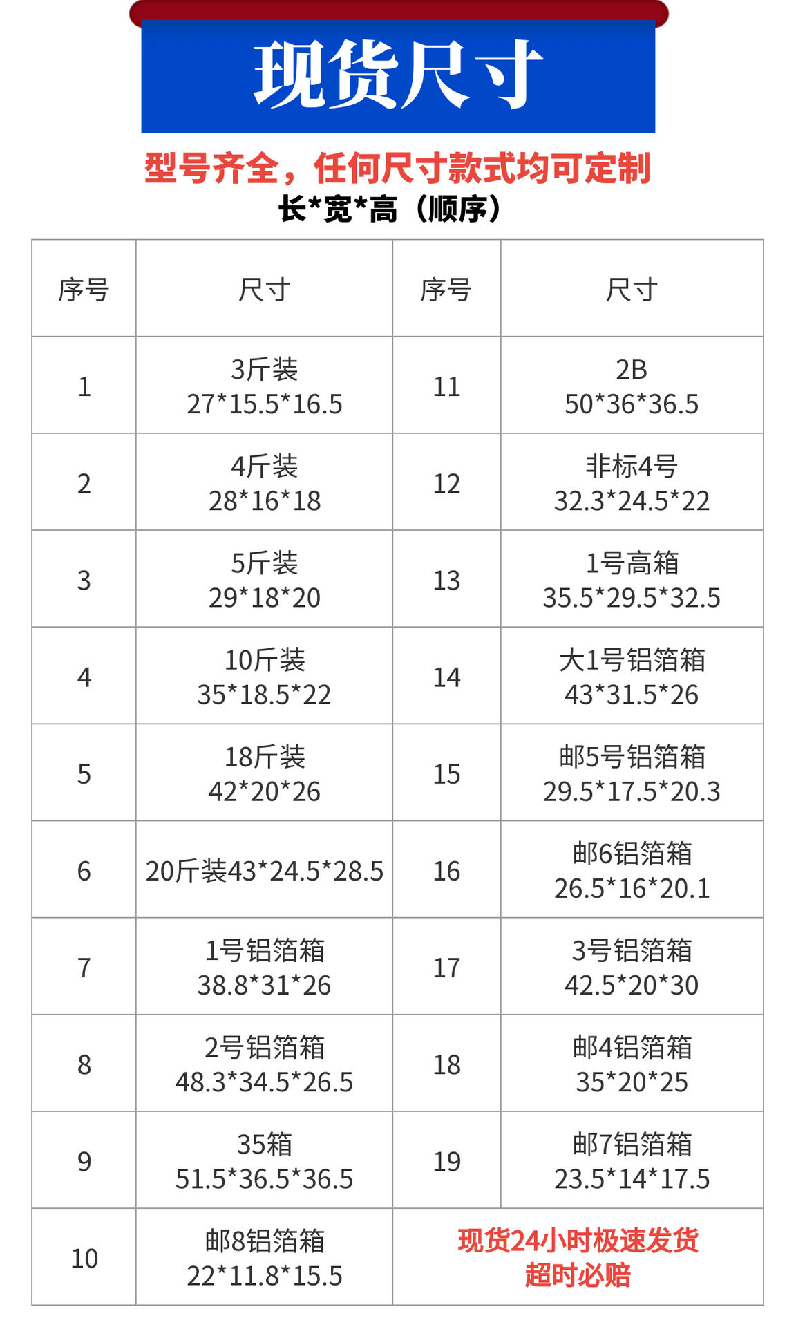 | Specification | No. 9 19.5*10.5*13.5,2.5kg installed 29*18*20,5kg installed 35*18.5*22,10kg installed 43*24.5*28.5,1.5kg installed 27*15.5*16.5,2kg installed 28*16*18,No. 1 high box 35.5*29.5*32.5,35 boxes 51.5*36.5*36.5,Non-standard no. 4 32.3*24.5*22,No. 1 aluminum foil box 38.8*31*26,No. 2 aluminum foil box 48.3*34.5*26.5,Large 1 size aluminum foil box 43*31.5*26,Post 5 aluminum foil box (29.5*17.5*20.3),Post 6 aluminum foil box (26.5*16*20.1),No. 3 aluminum foil box 42.5*20*30,Mail 4 aluminum foil box 35*20*25,You7 aluminum foil box 23.5*14*17.5,You8 aluminum foil box 22*11.8*15.5,55 boxes of aluminum foil boxes 55.5*55.5*38.5,2b aluminum foil box 51*35.8*30.8,Multi-time heating pack (72 hours),Multi-time heating pack (110 hours),Hemerocallis fever pack (48 hours),Multi-time heating pack (48 hours),Hemerocallis fever pack (110 hours),Hemerocallis fever pack (72 hours),0.5-1.0kg pack 19.5*10.5*13.5 (no. 9) |