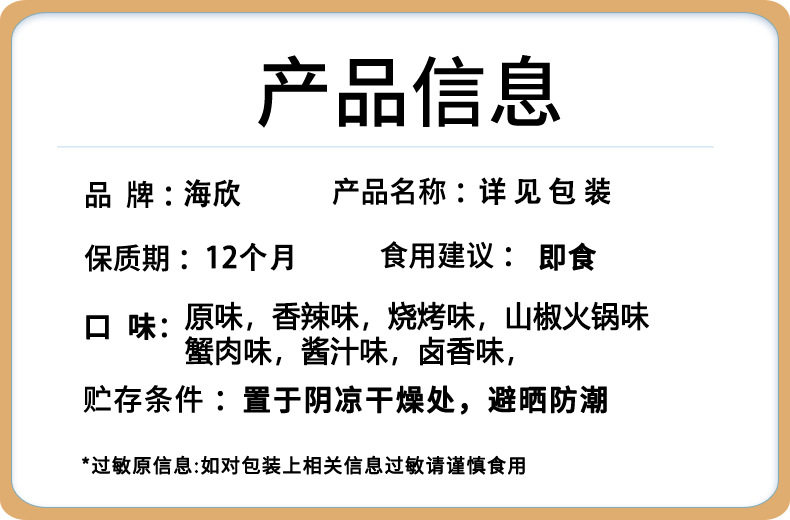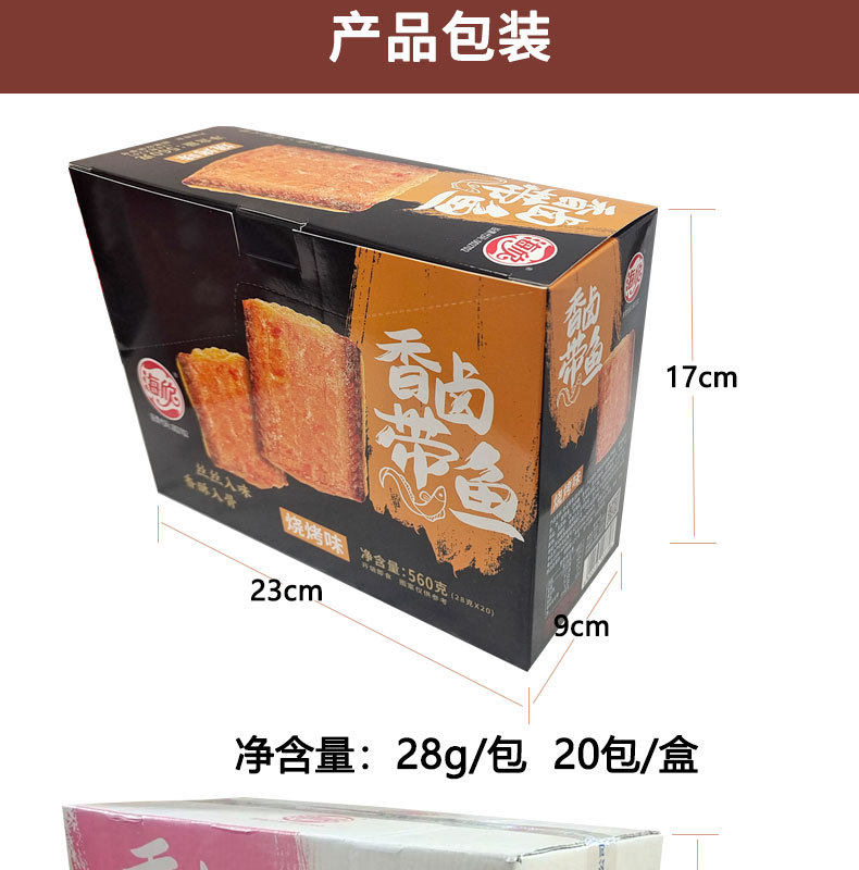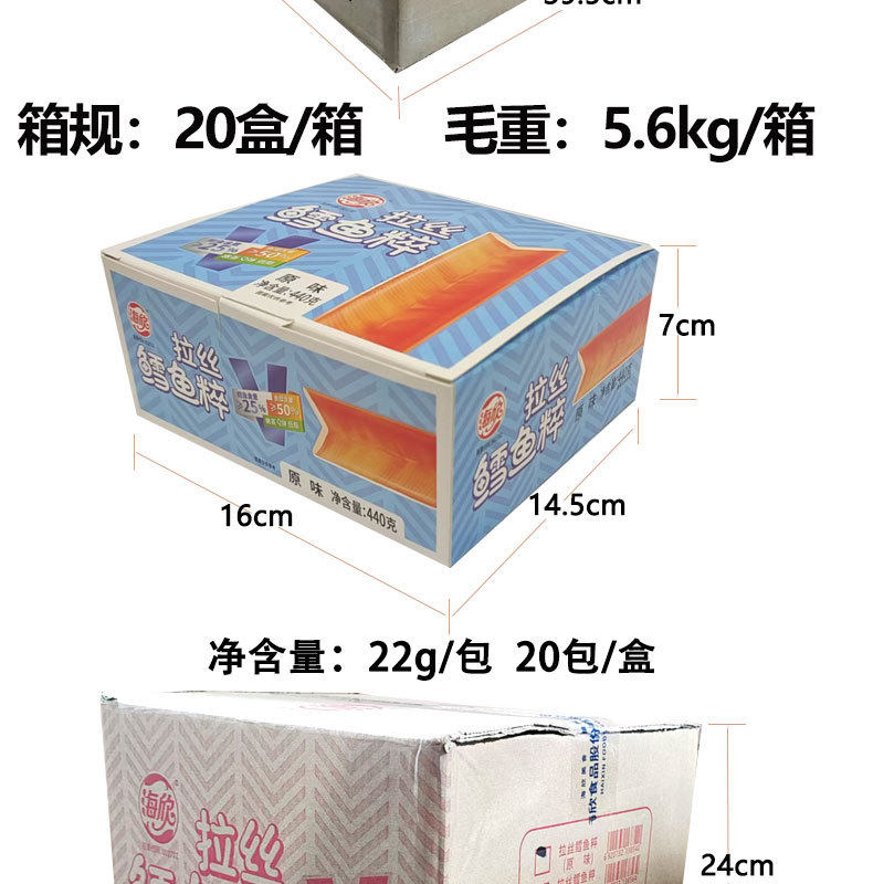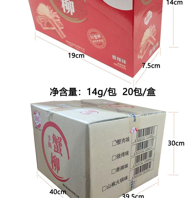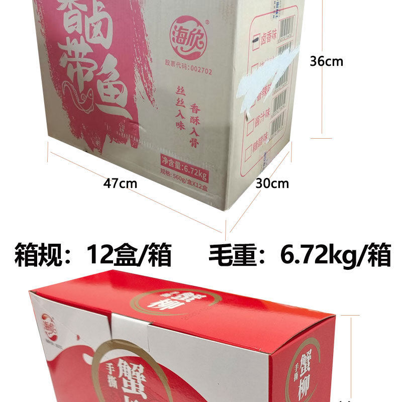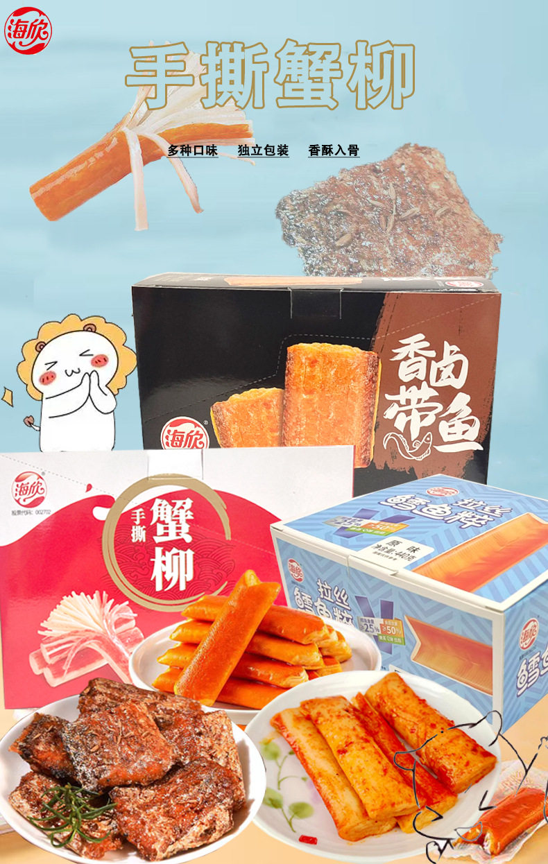 | Packaging specifications | Haixin shredded crab sticks 14g*20 packs (spicy flavor),Haixin shredded crab sticks 14g*20 packs (bbq flavor),Haixin hand-shredded crab sticks 14g*20 packs (sansho pepper hot pot flavor),Haixin shredded crab sticks 14g*20 packs (crab meat flavor),Haixin brushed cod fish 22g*20 packs (spicy flavor),Haixin brushed cod fish 22g*20 packs (original flavor),Haixin brushed cod fish 22g*20 packs (barbecue flavor),Haixin fragrant braised hairtail fish 28g*20 packs (spicy flavor),Haixin fragrant braised hairtail fish 28g*20 packs (barbecue flavor),Haixin fragrant braised hairtail fish 28g*20 packs (braised flavor),Haixin fragrant braised hairtail fish 28g*20 packs (sauce flavor) |