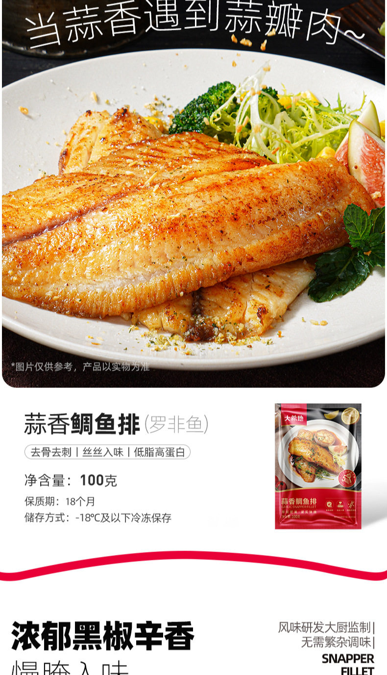 | Packaging specifications | Black pepper snapper steak 100g*3 bags,Garlic snapper steak 100g*3 bags,Black pepper snapper steak 100g*6 bags,Garlic snapper steak 100g*6 bags,Black pepper snapper steak 100g*8 bags,Garlic snapper steak 100g*8 bags,Black pepper snapper steak 100g*10 bags,Garlic snapper steak 100g*10 bags,Black pepper snapper steak 100g*20 bags,Garlic snapper steak 100g*20 bags,[8 bags mixed] black pepper*4+garlic*4,【10 bags mixed】garlic*5+black pepper*5,【20 bags mixed】garlic*10+black pepper*10,【20 bags mixed】black pepper*15+garlic*5,[15 bags of three-flavor mix] garlic*5+black pepper*5+orleans fish steak 100g*5,[30 bags of three-flavor mix] garlic*10+black pepper*10+orleans fish steak 100g*10 |