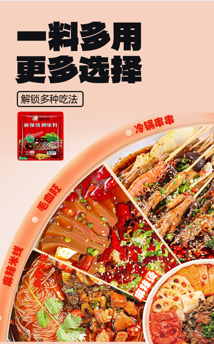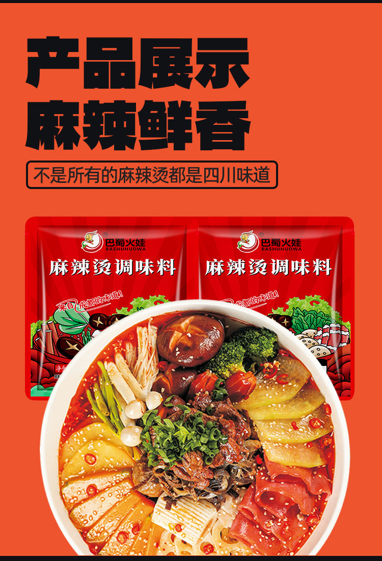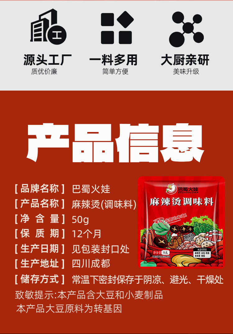 | Packaging specifications | Malatang seasoning 50g/bag |