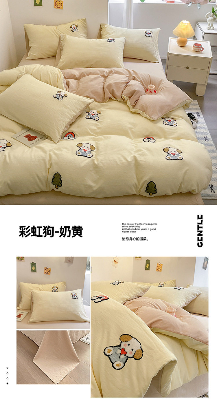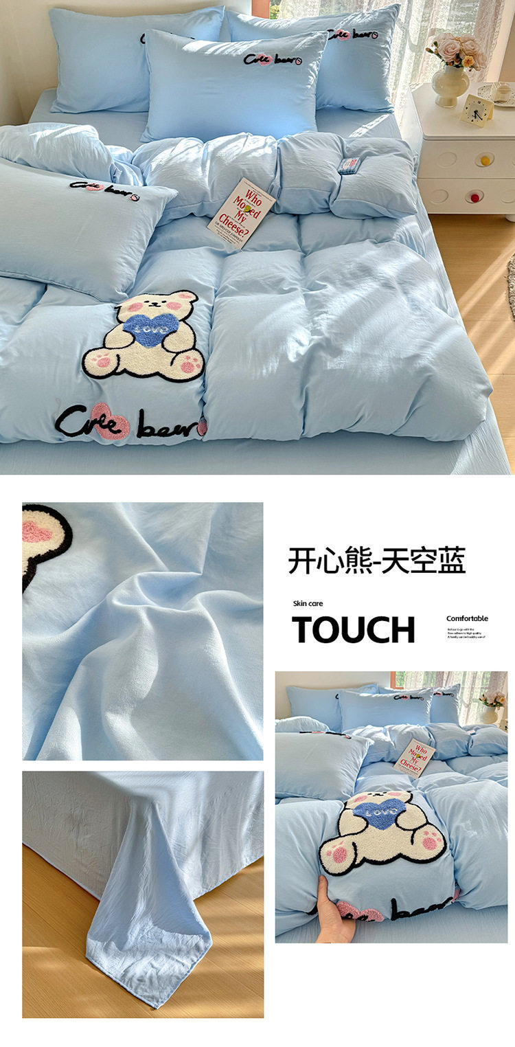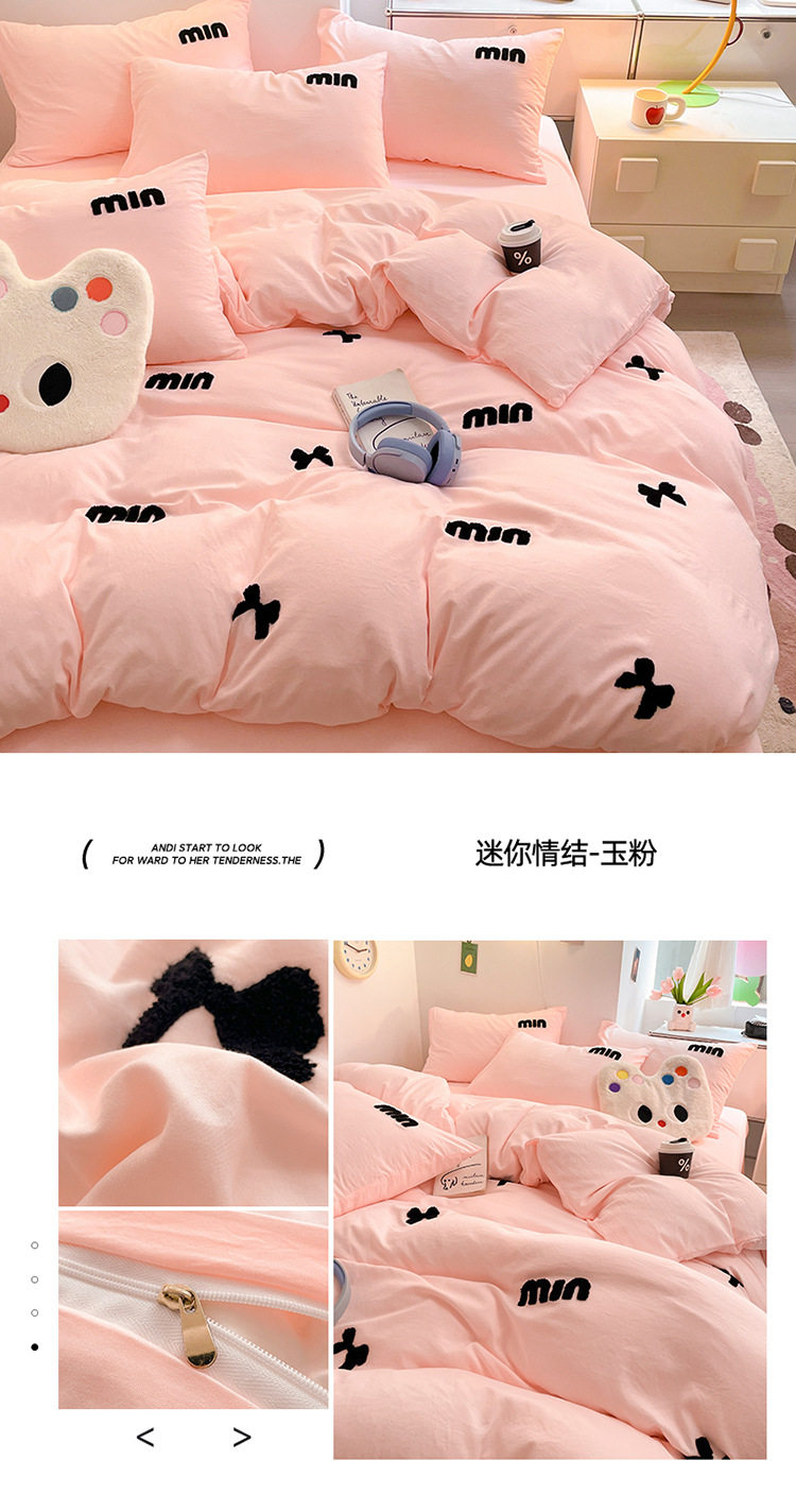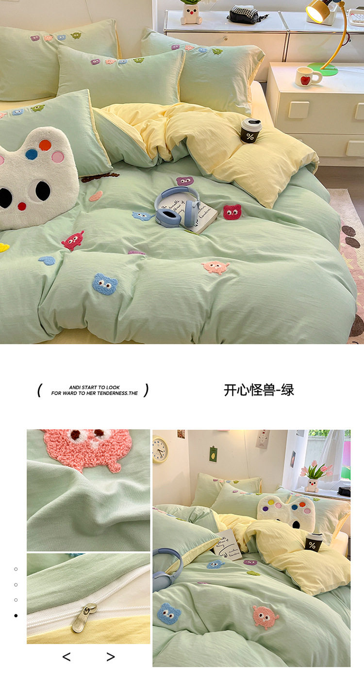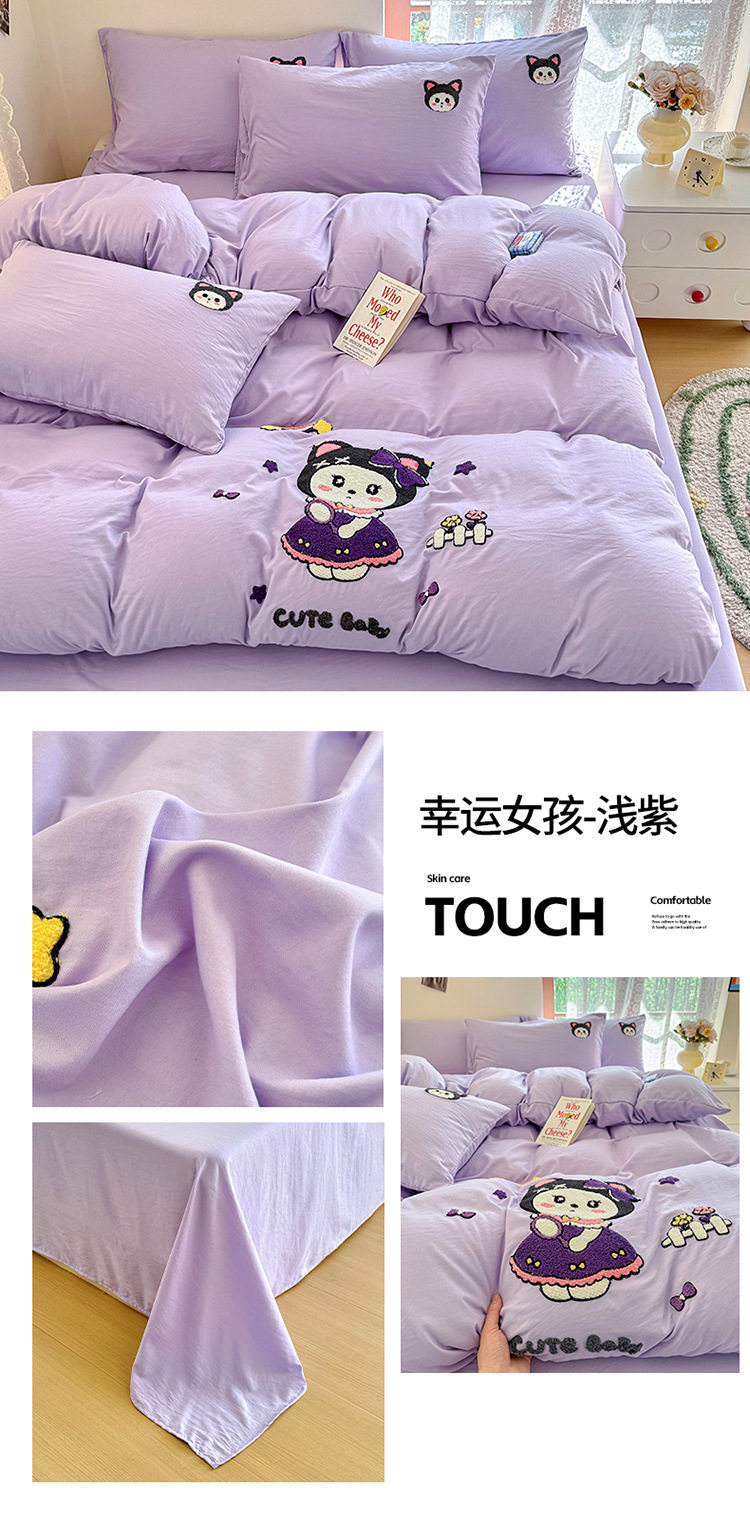 Class A Bedding Four-piece Solid Color Cotton Cartoon Towel Embroidered Quilt Cover Skin-friendly Washable Cotton Student Dormitory Cute Kit