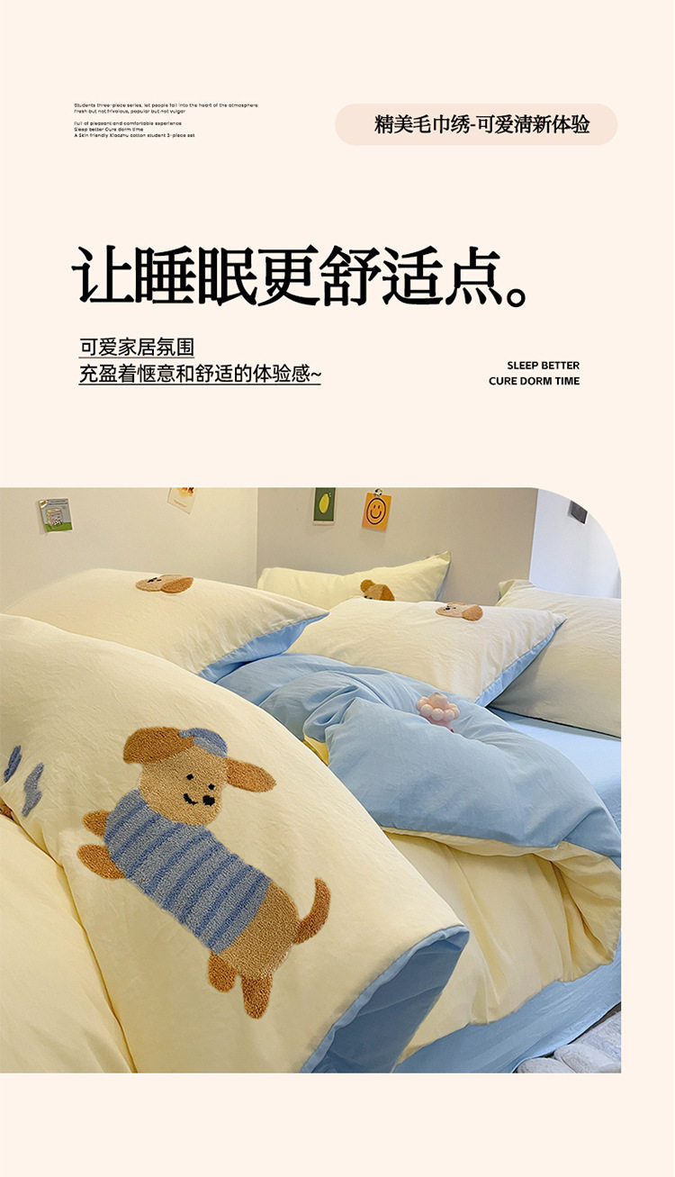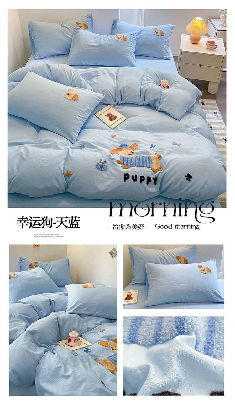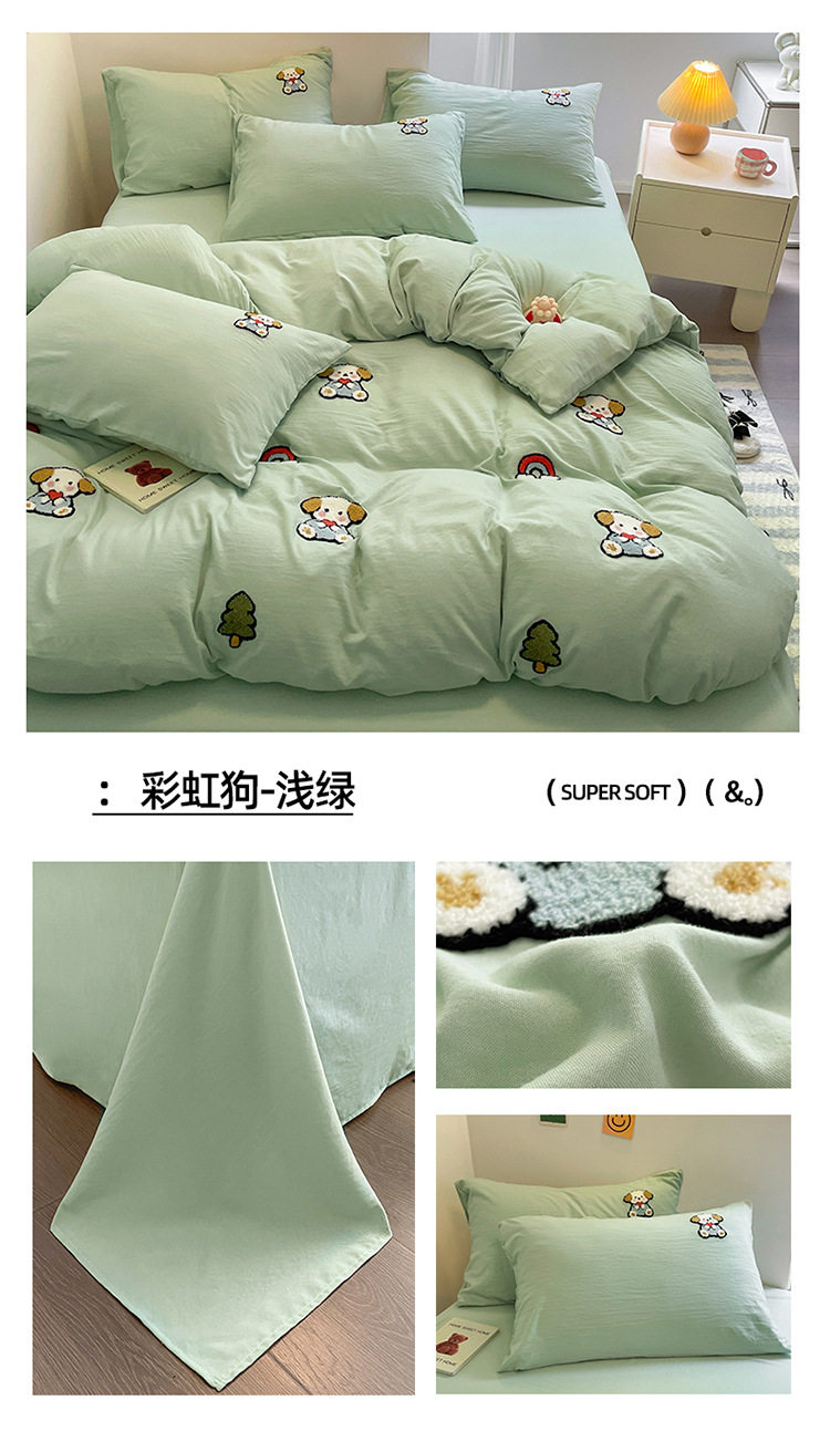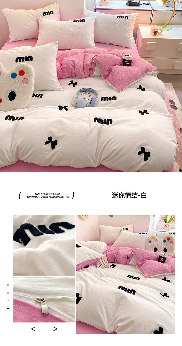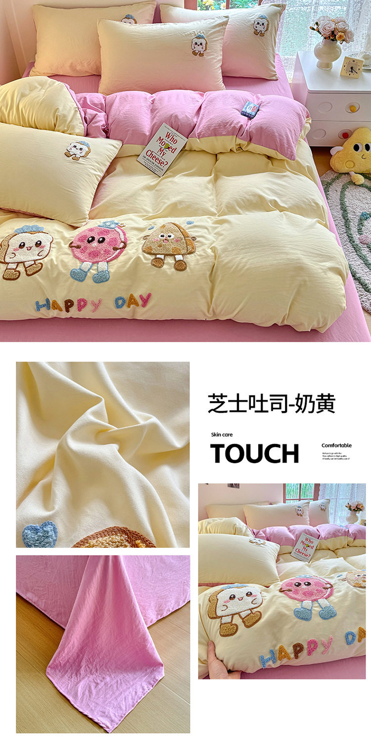 Class A Bedding Four-piece Solid Color Cotton Cartoon Towel Embroidered Quilt Cover Skin-friendly Washable Cotton Student Dormitory Cute Kit