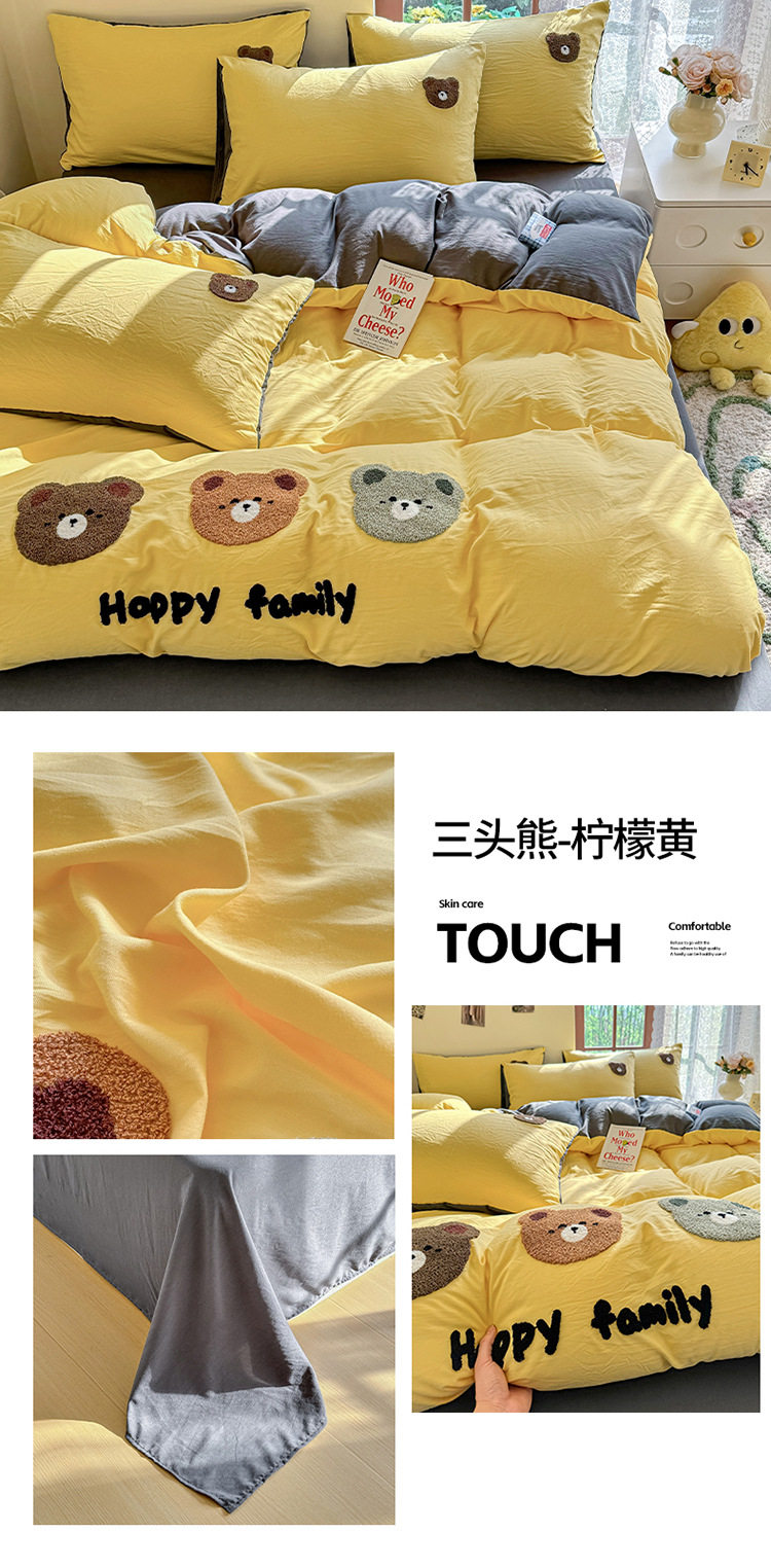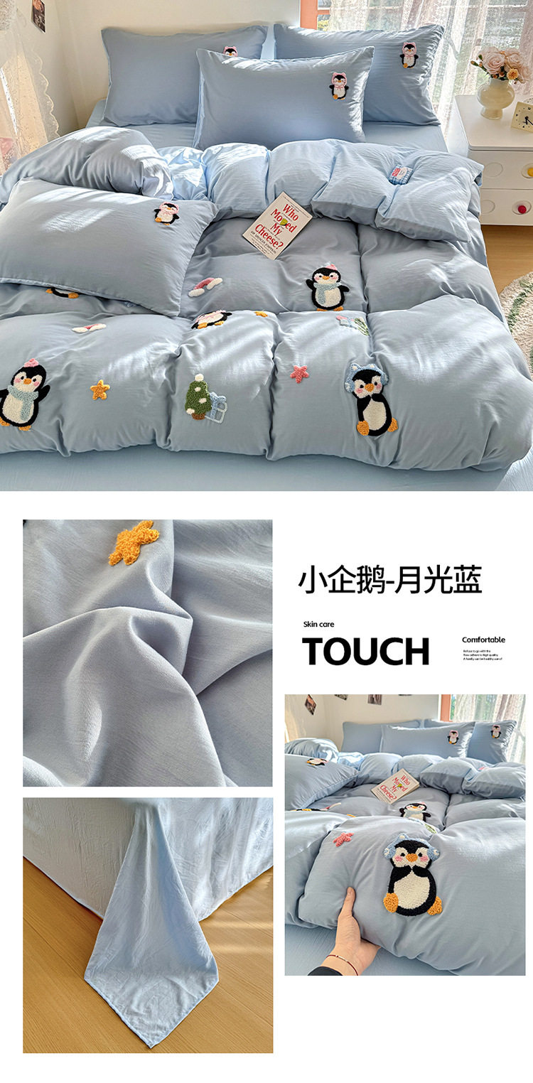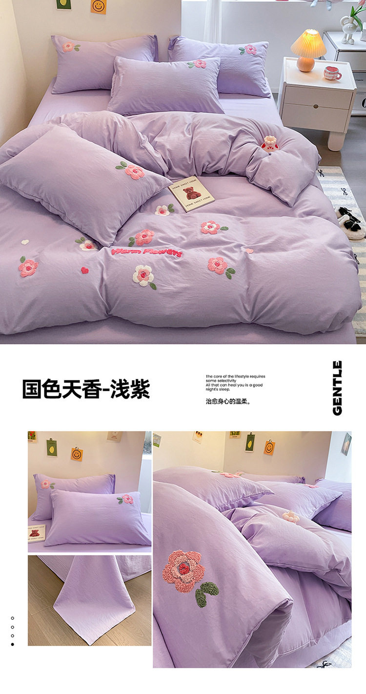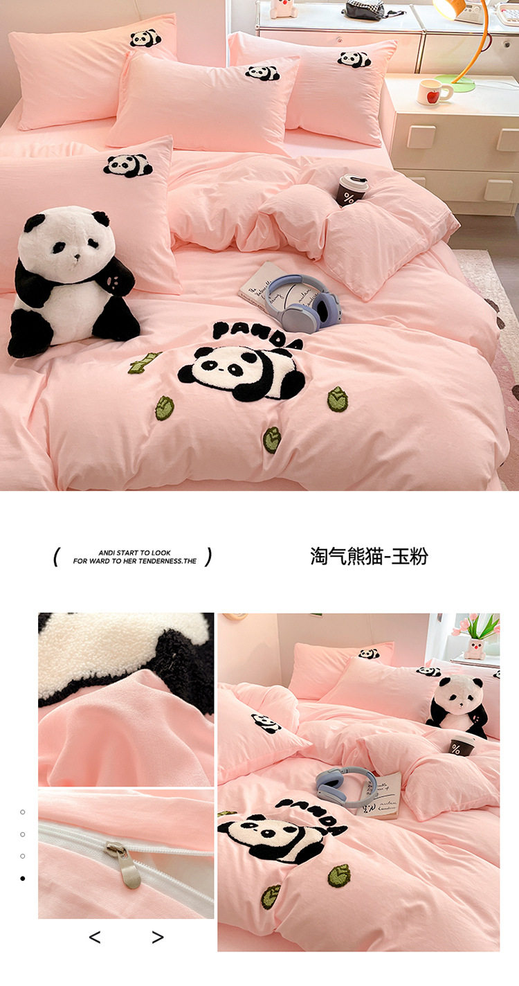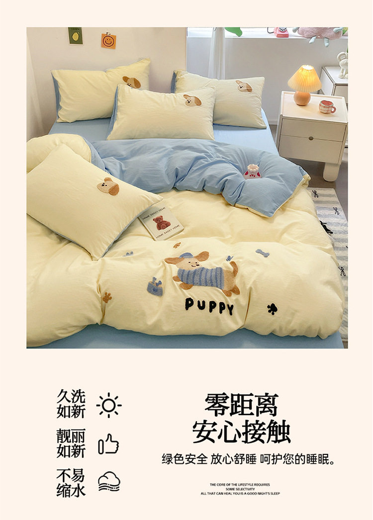 Class A Bedding Four-piece Solid Color Cotton Cartoon Towel Embroidered Quilt Cover Skin-friendly Washable Cotton Student Dormitory Cute Kit