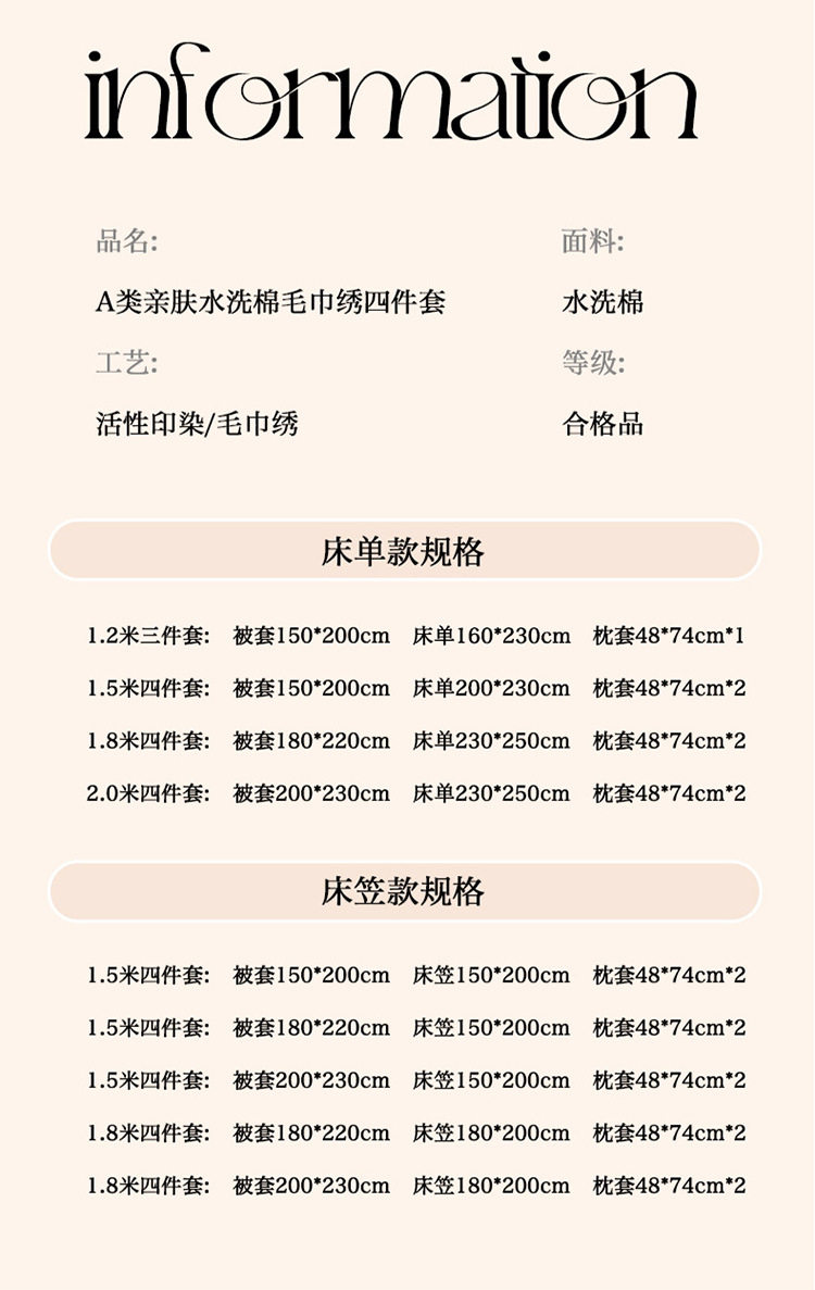 | Dimensions | 1.2m bed sheet three-piece quilt cover 150x200,1.5mbed sheets four-piece quilt cover 150x200,1.8m bed sheet four-piece quilt cover 180x220,2.0mbed sheets four-piece quilt cover 200x230,1.5m fitted sheet four-piece quilt cover 150x200,1.5m fitted sheet four-piece quilt cover 180x220,1.5m fitted sheet four-piece quilt cover 200x230,1.8m fitted sheet four-piece quilt cover 180x220,1.8m fitted sheet four-piece quilt cover 200x230 |