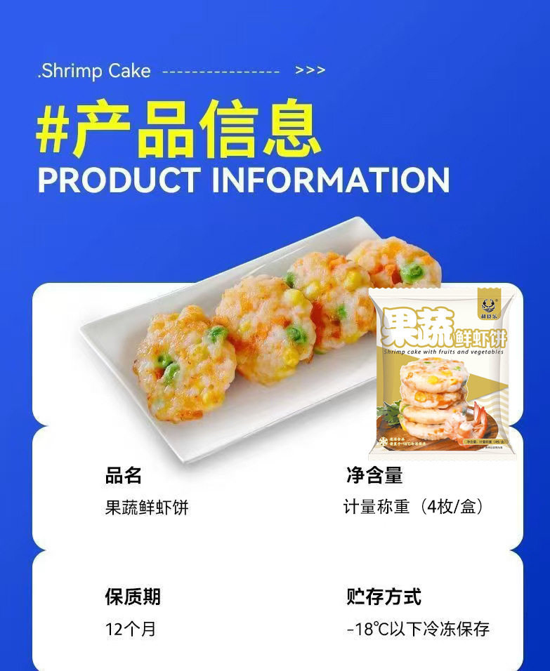 | Packaging specifications | Fruit and vegetable shrimp cakes 100g*2 bags,Fruit and vegetable shrimp cakes 100g*4 bags,Fruit and vegetable shrimp cakes 100g*6 bags,Fruit and vegetable shrimp cakes 100g*8 bags |