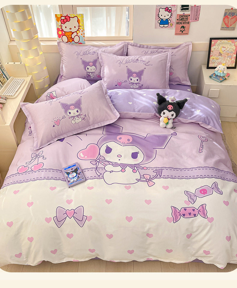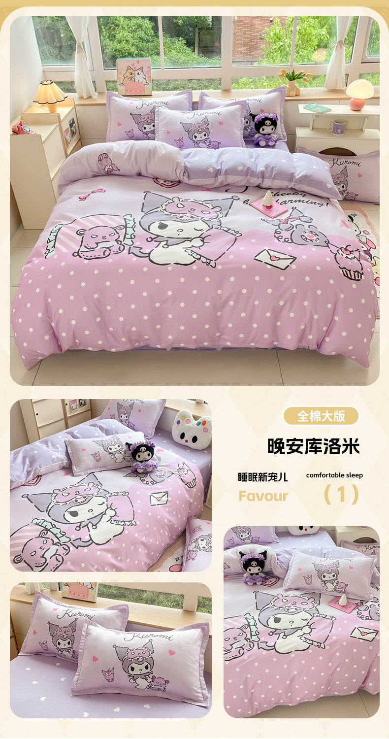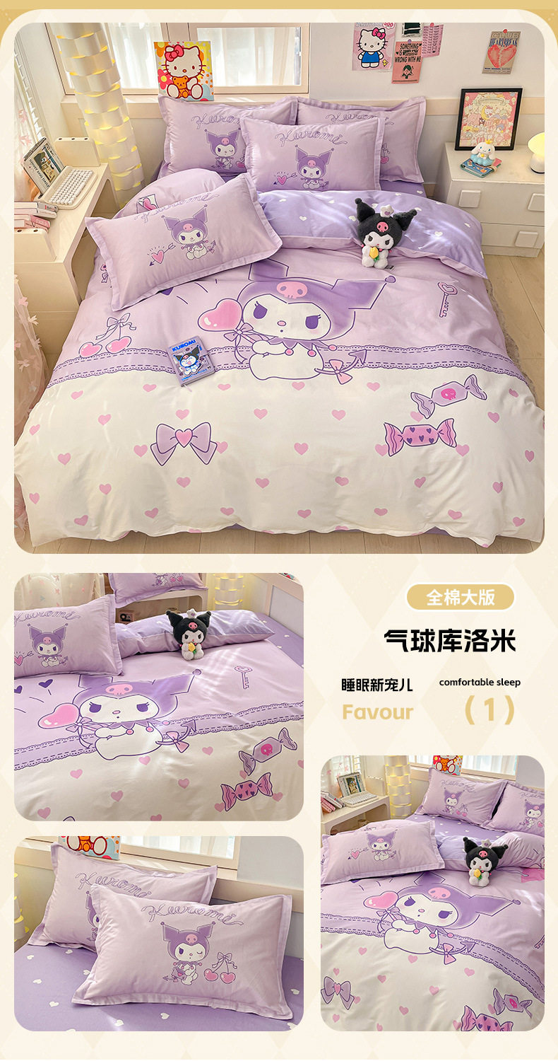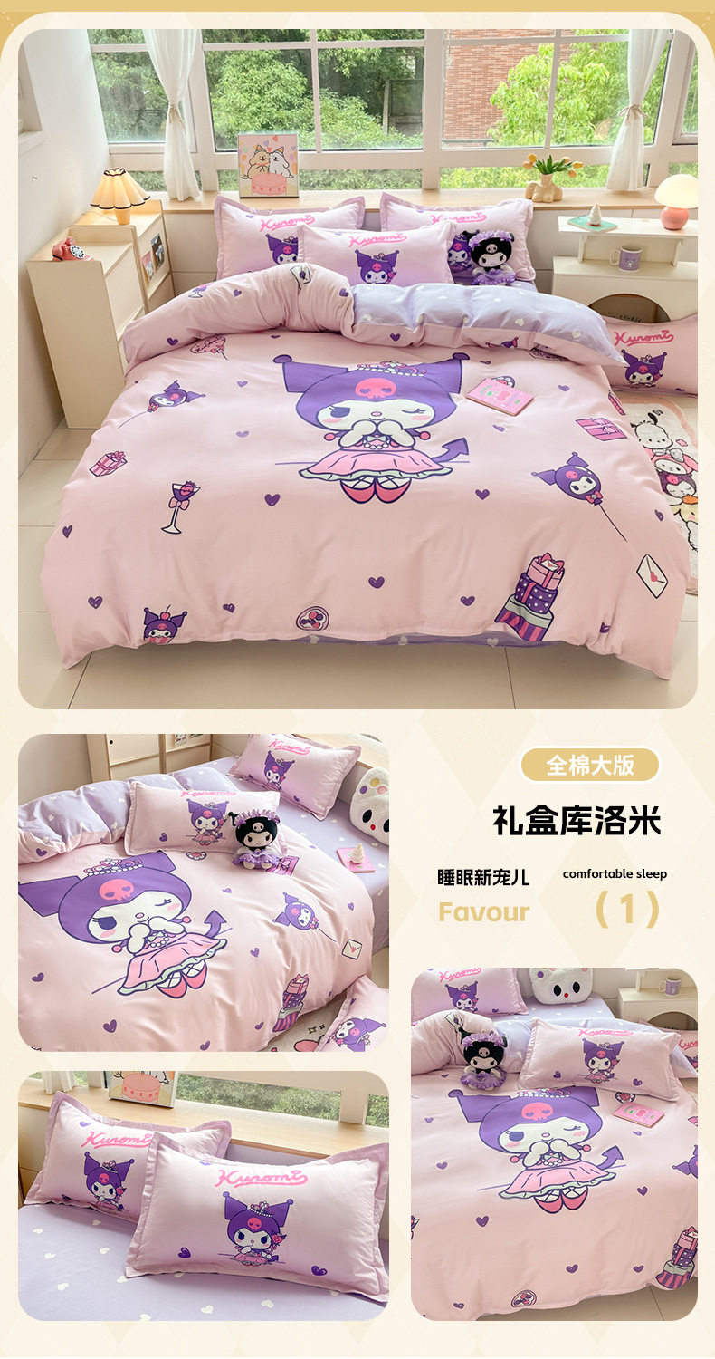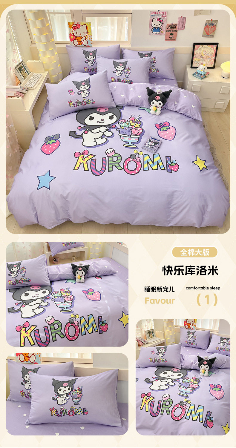 Sanrio Large Printed Cotton Four-Piece Set Pure Cotton Cartoon Kuromi Student Three-Piece Set Fitted Sheet and Quilt Cover Cross-Border