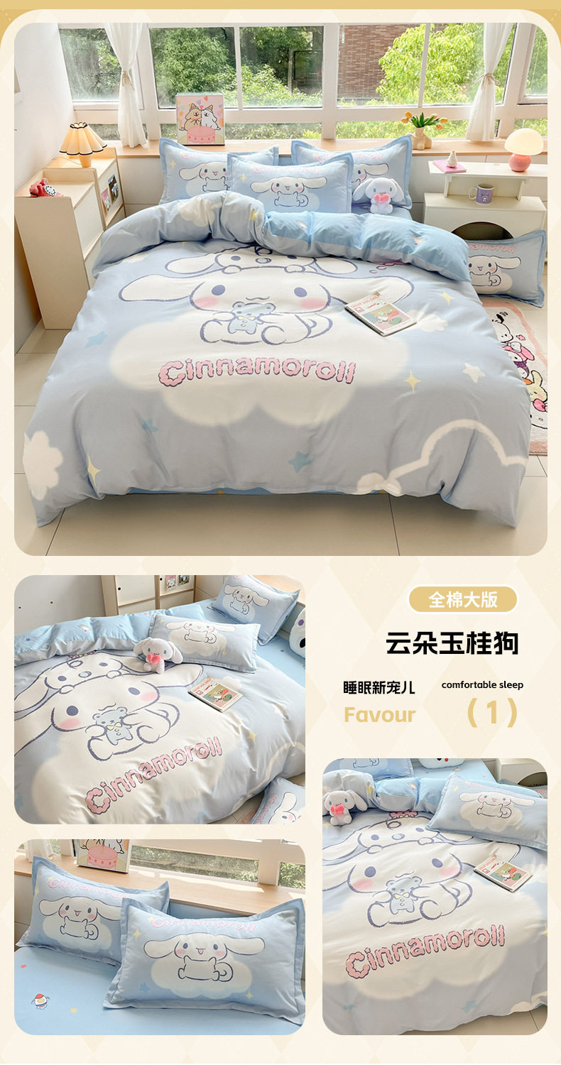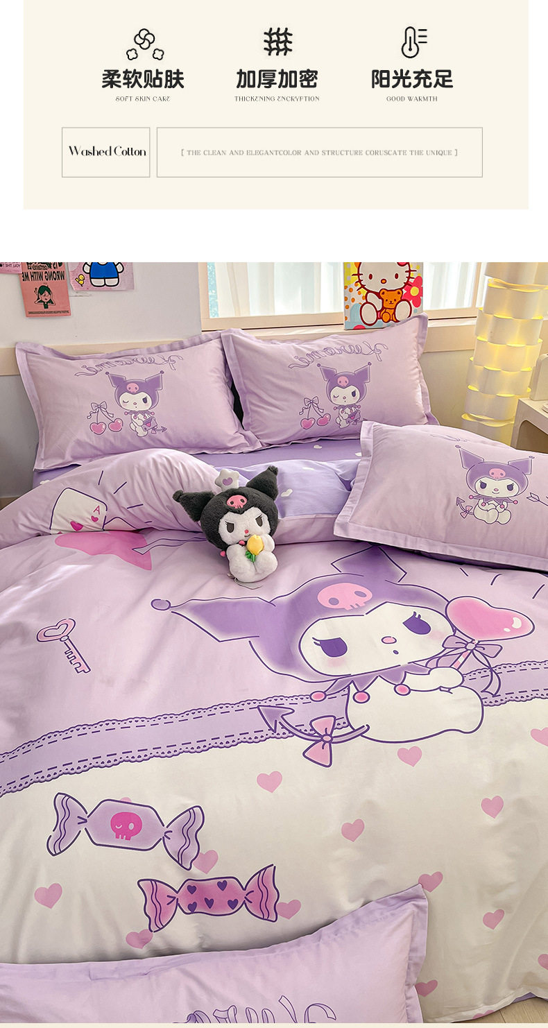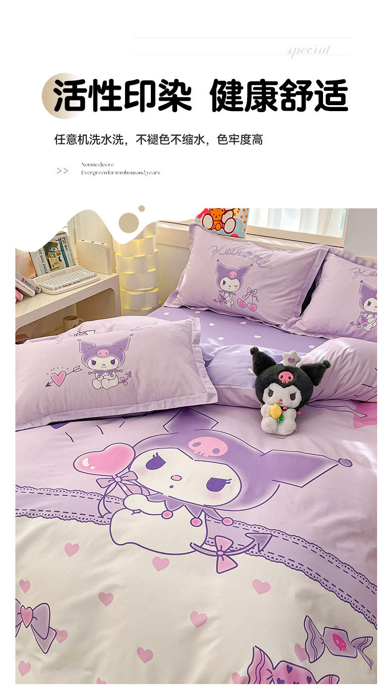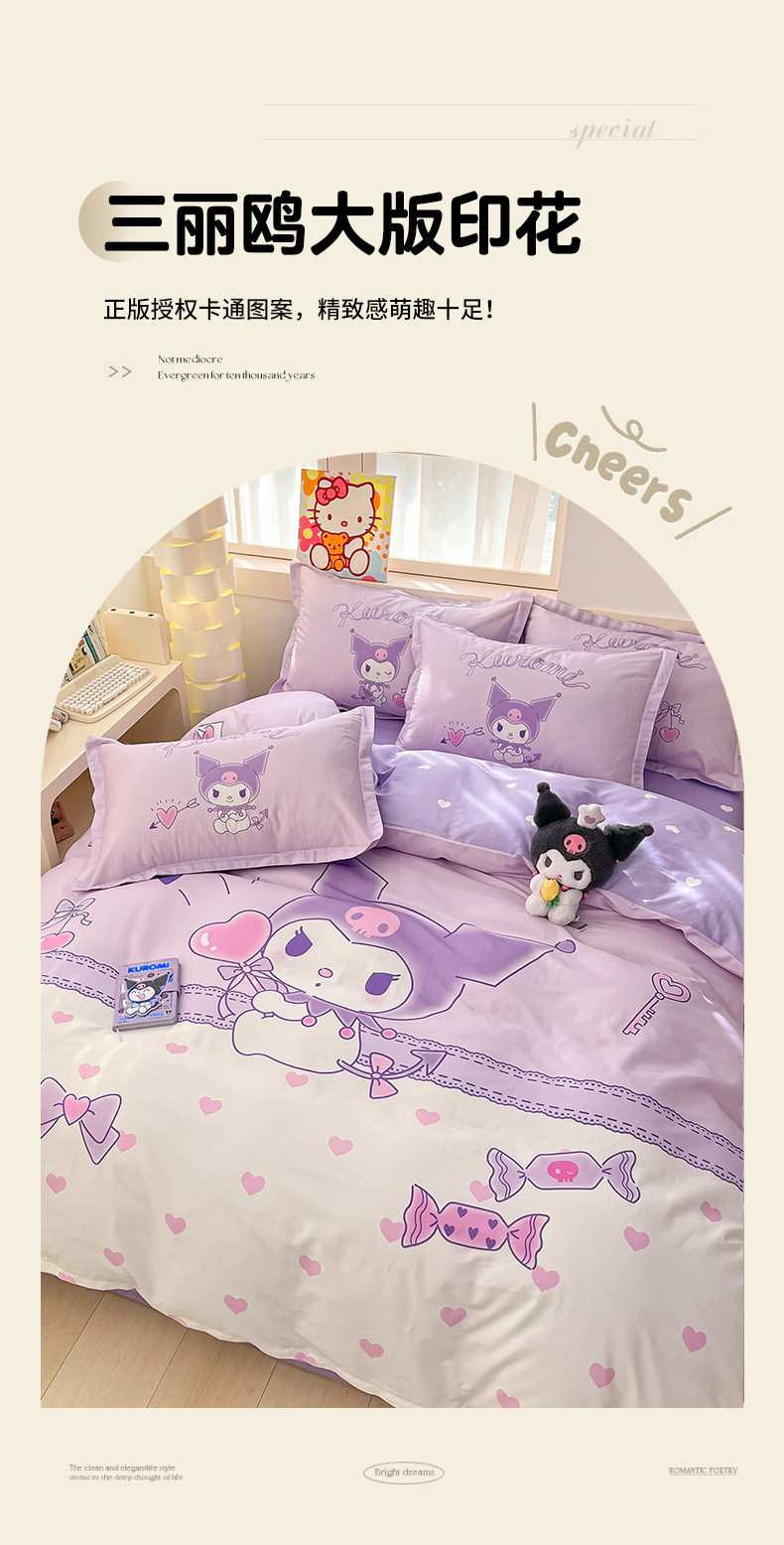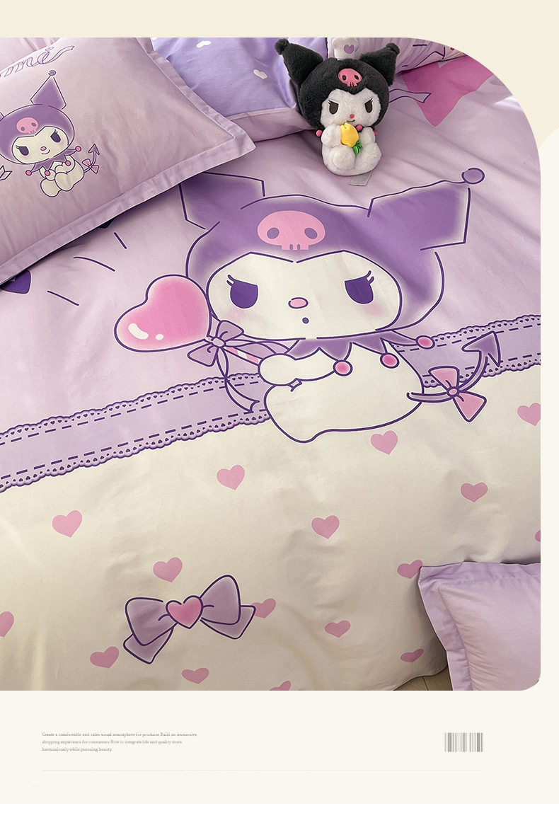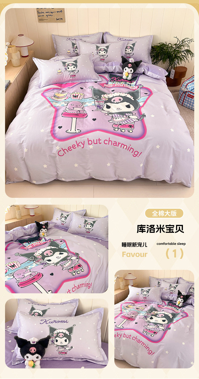 Sanrio Large Printed Cotton Four-Piece Set Pure Cotton Cartoon Kuromi Student Three-Piece Set Fitted Sheet and Quilt Cover Cross-Border