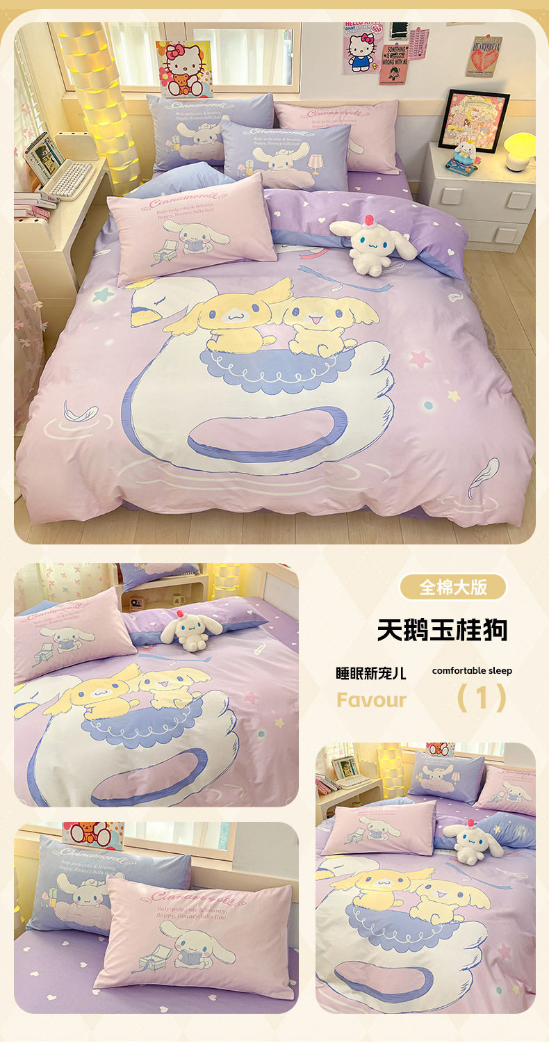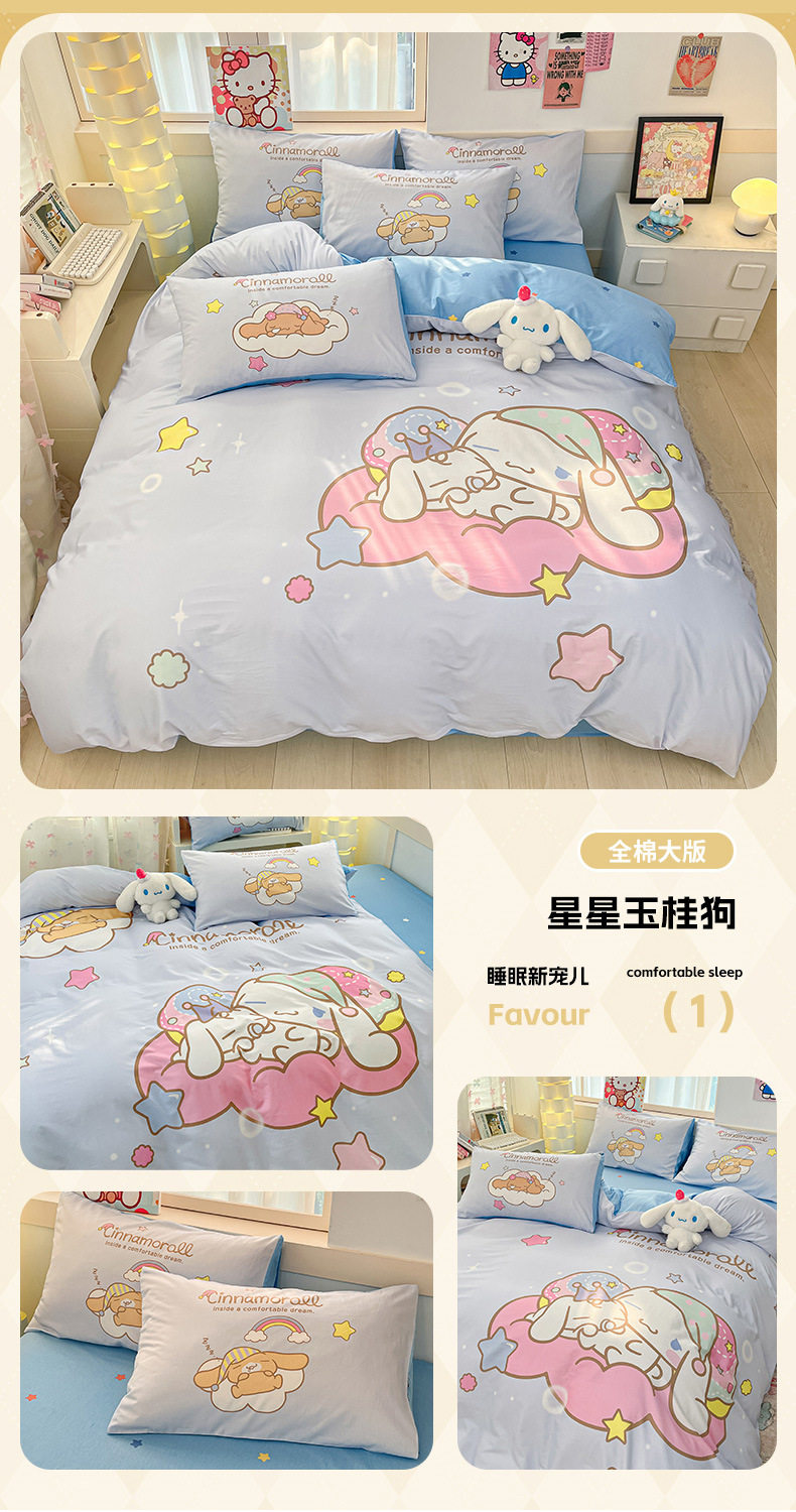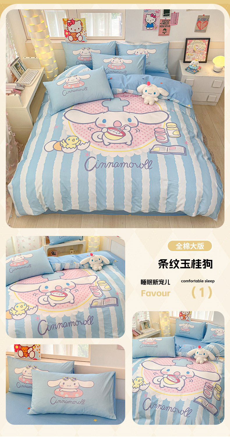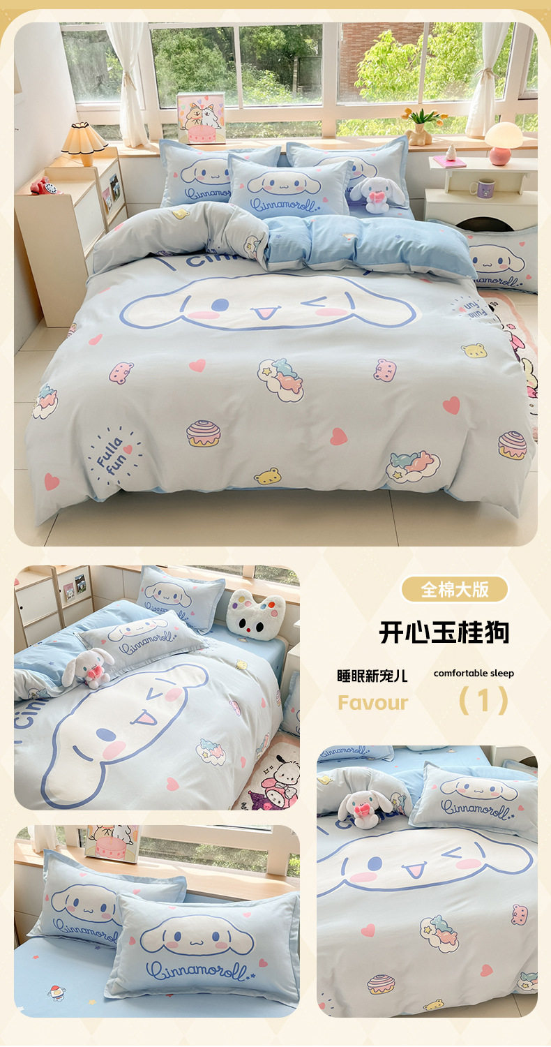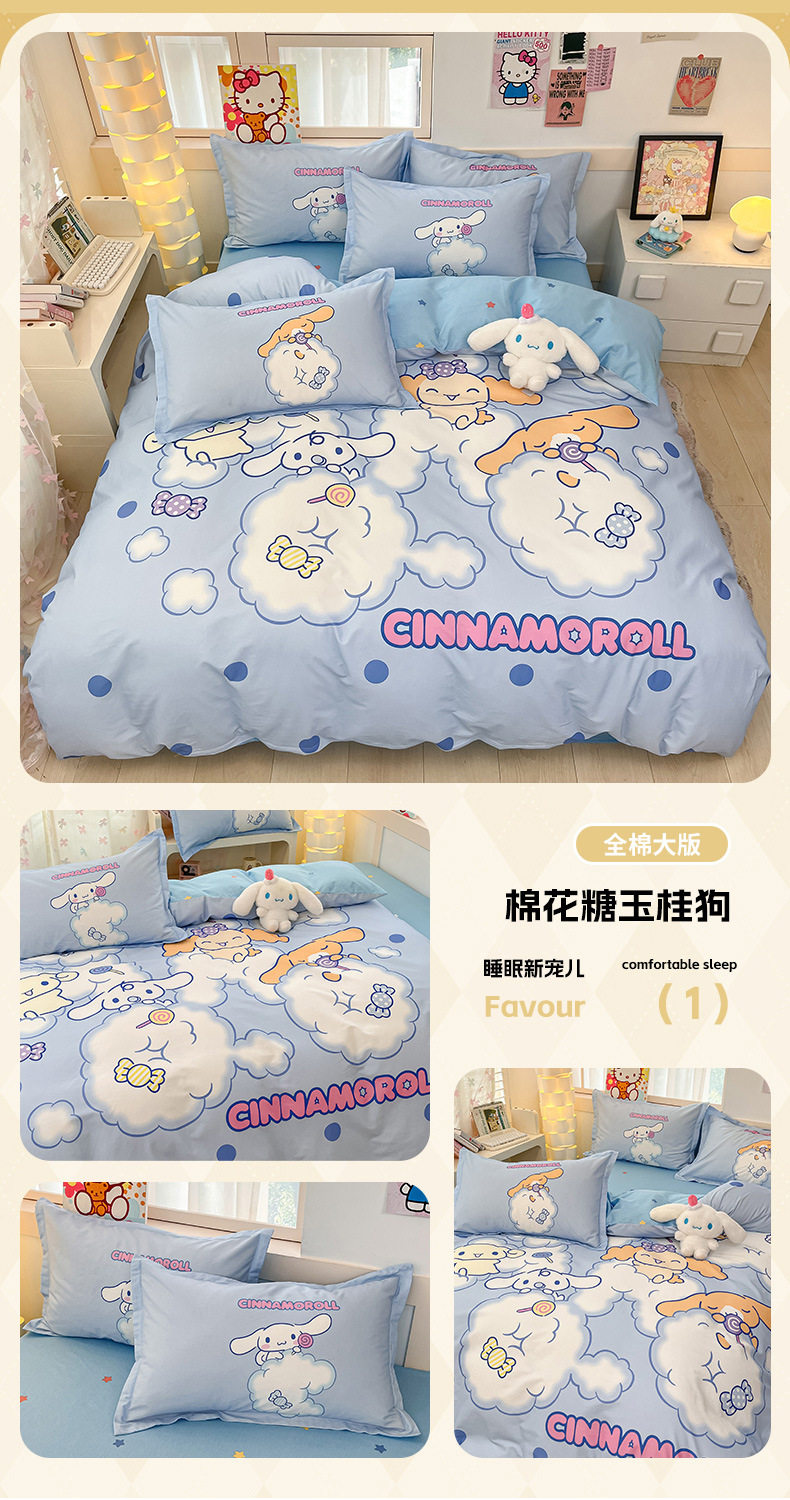 Sanrio Large Printed Cotton Four-Piece Set Pure Cotton Cartoon Kuromi Student Three-Piece Set Fitted Sheet and Quilt Cover Cross-Border
