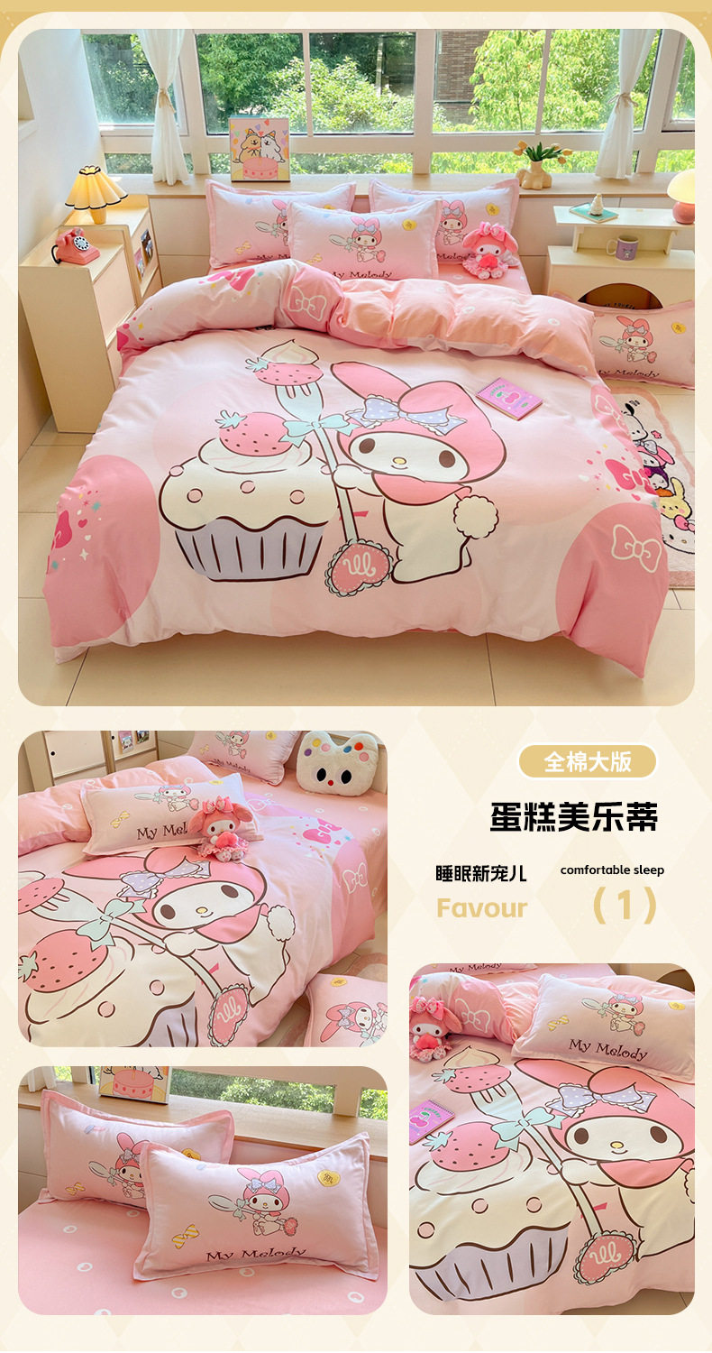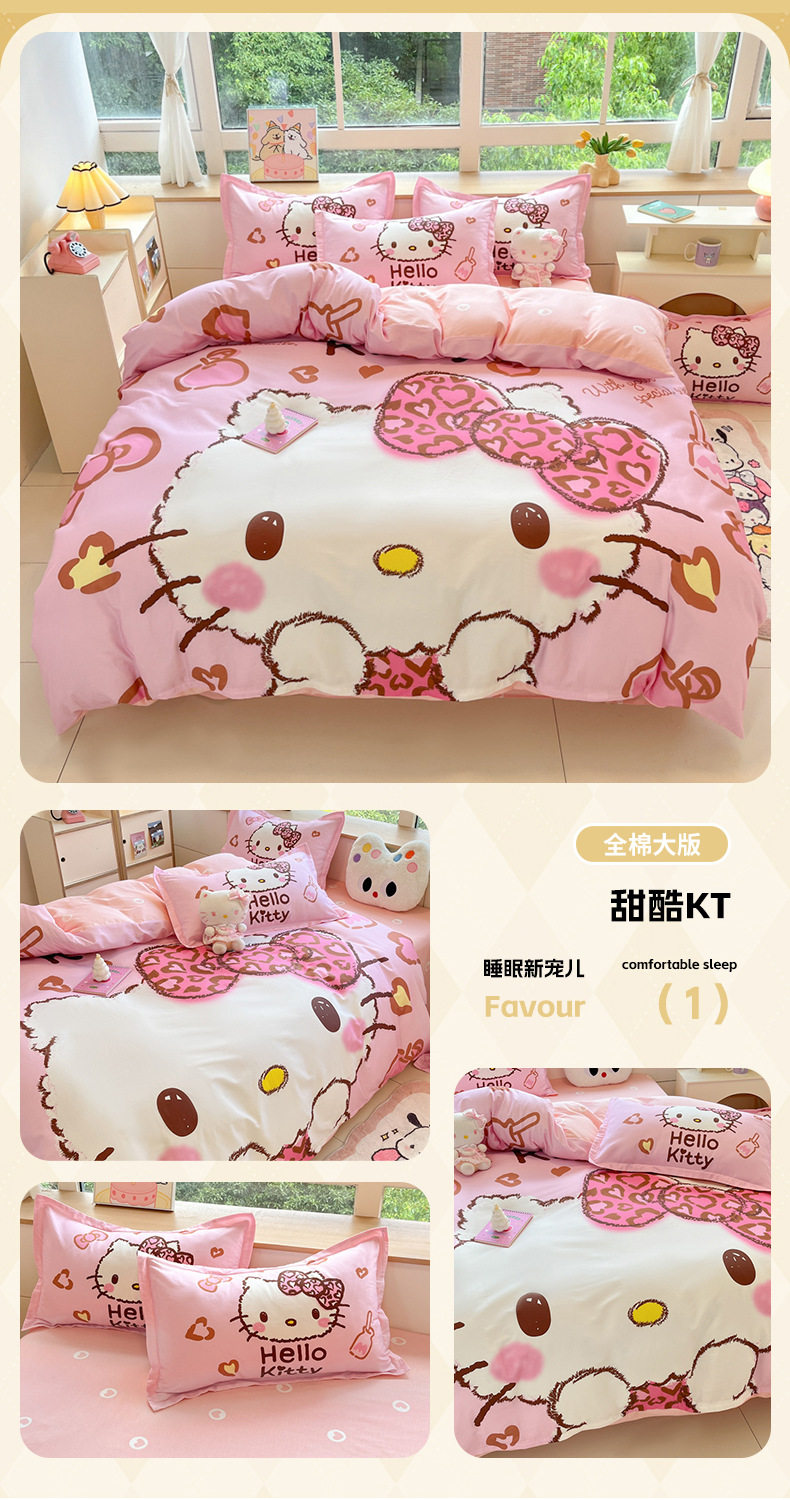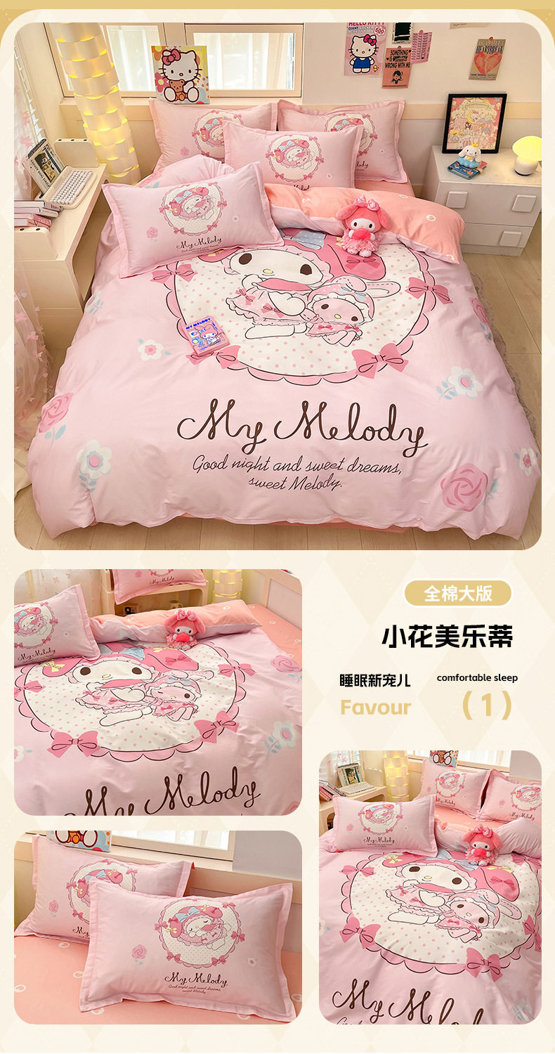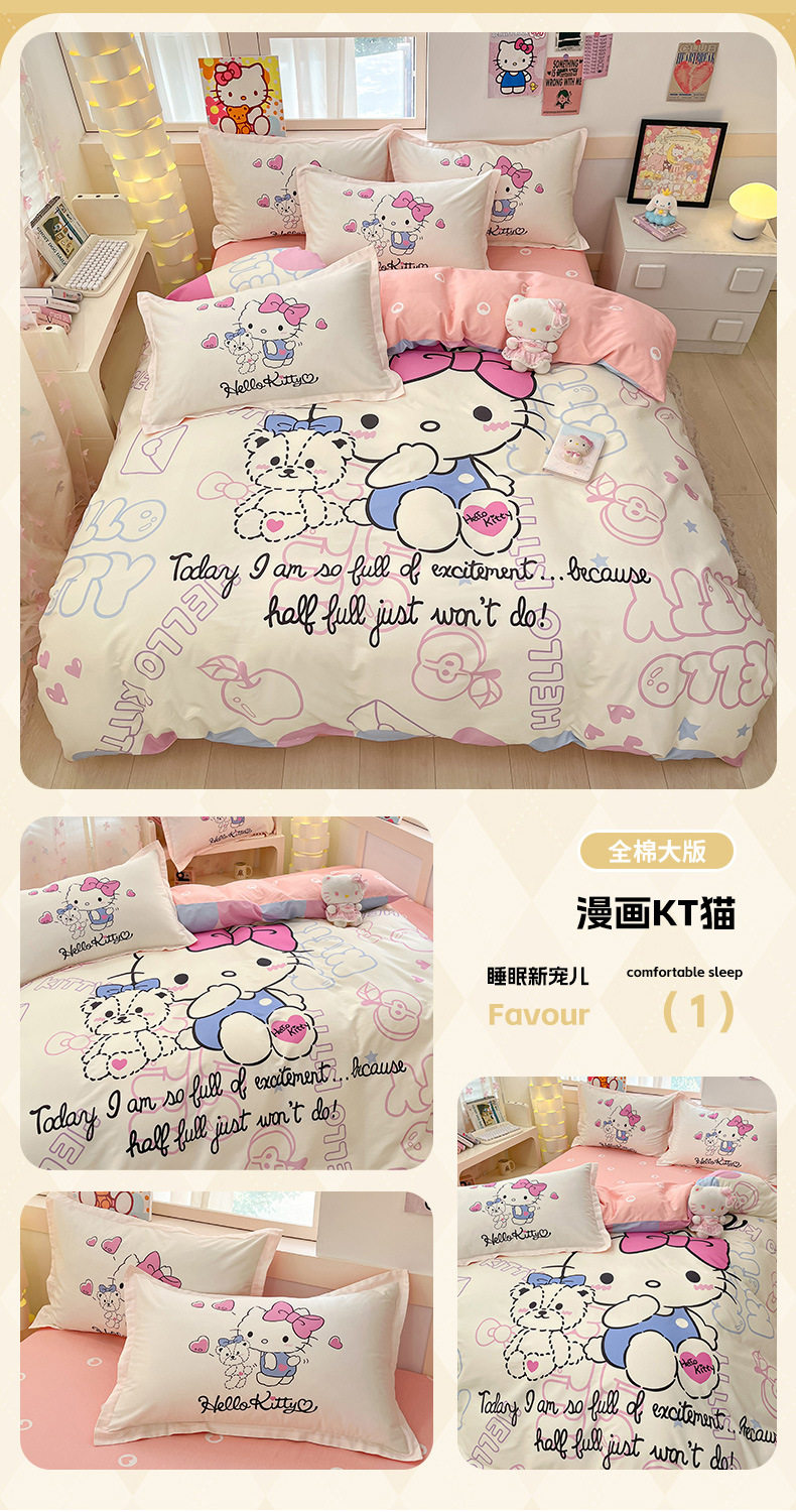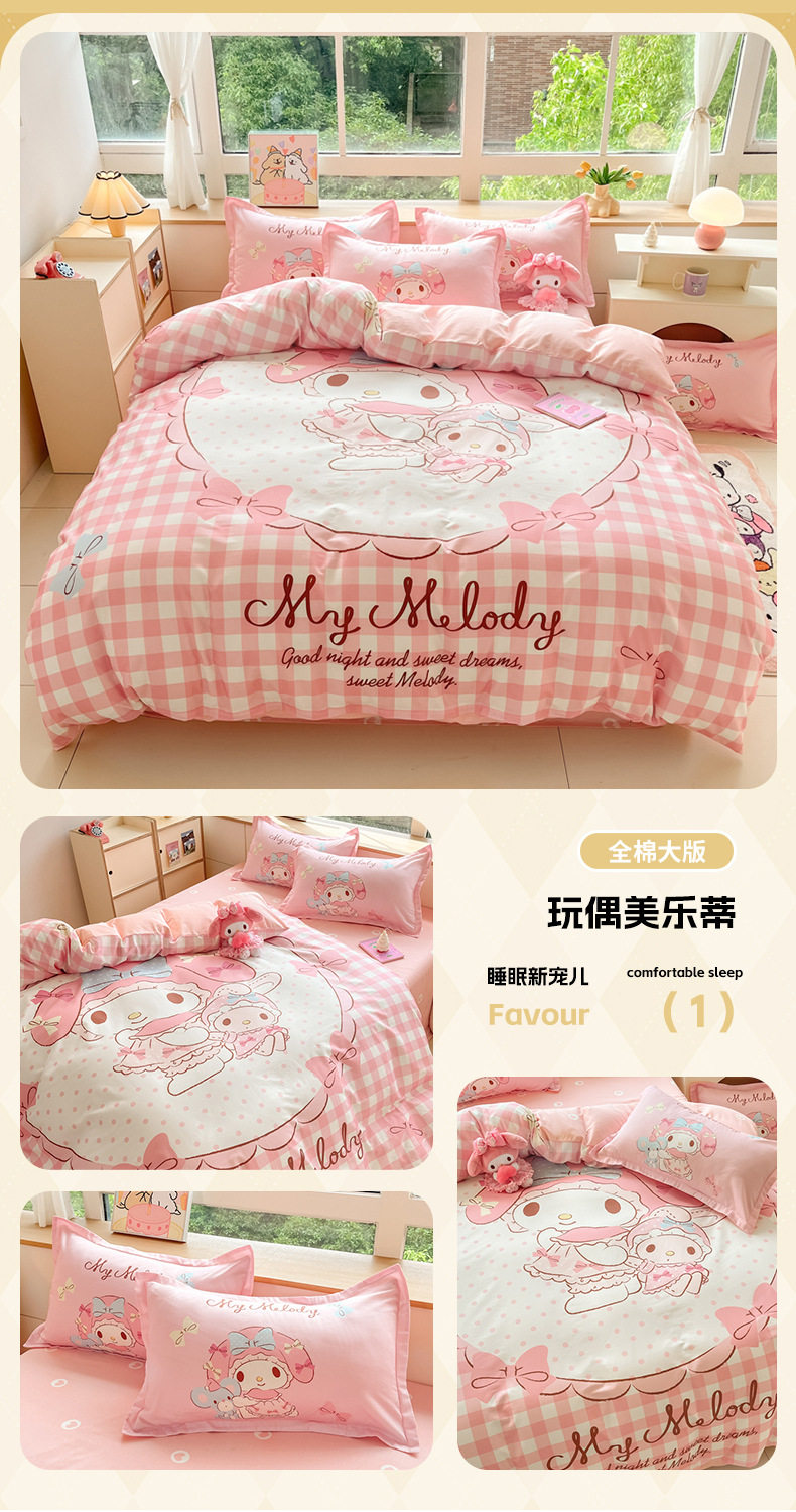 Sanrio Large Printed Cotton Four-Piece Set Pure Cotton Cartoon Kuromi Student Three-Piece Set Fitted Sheet and Quilt Cover Cross-Border