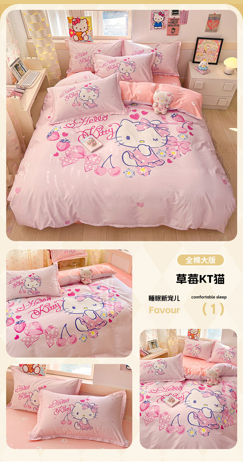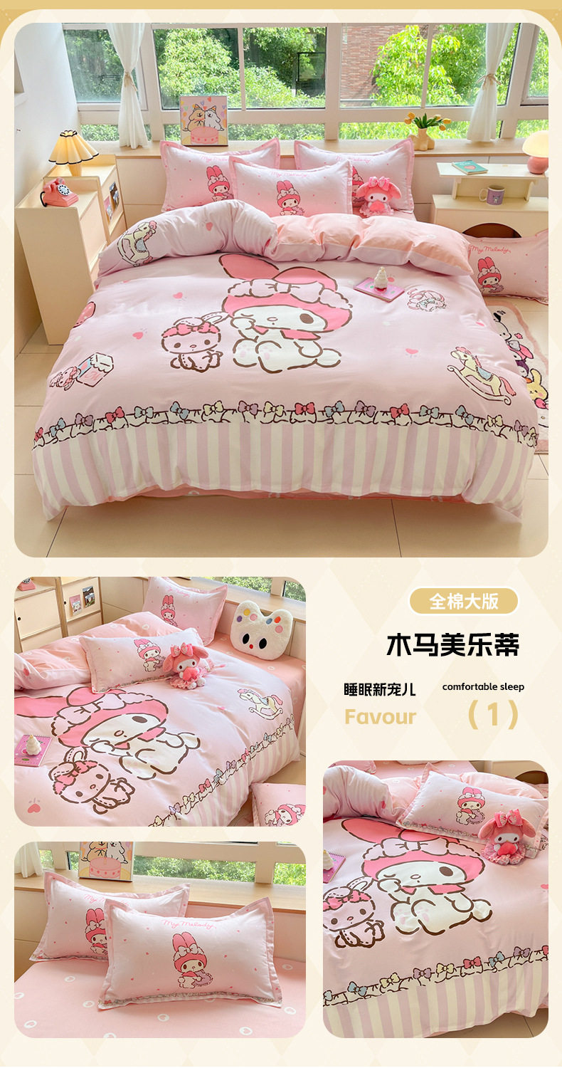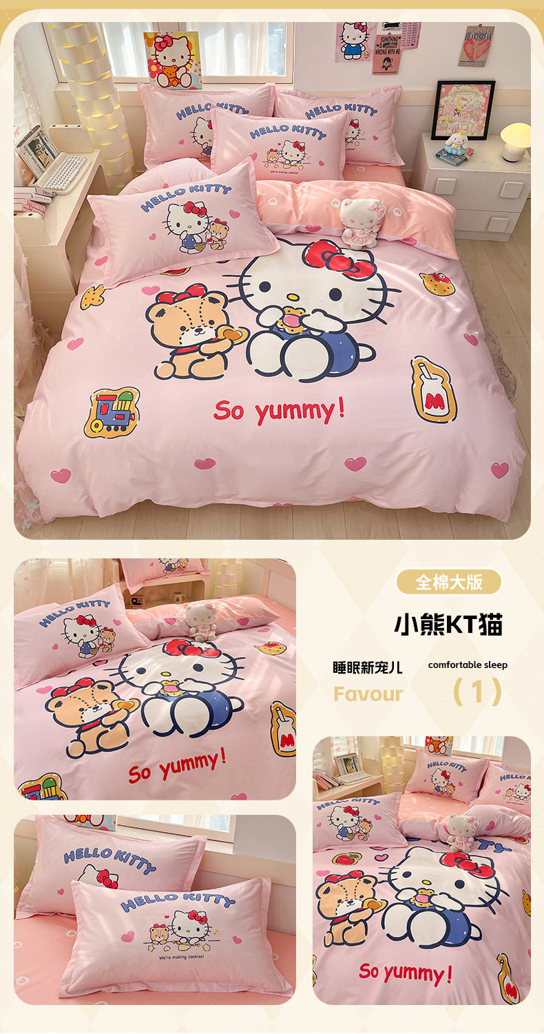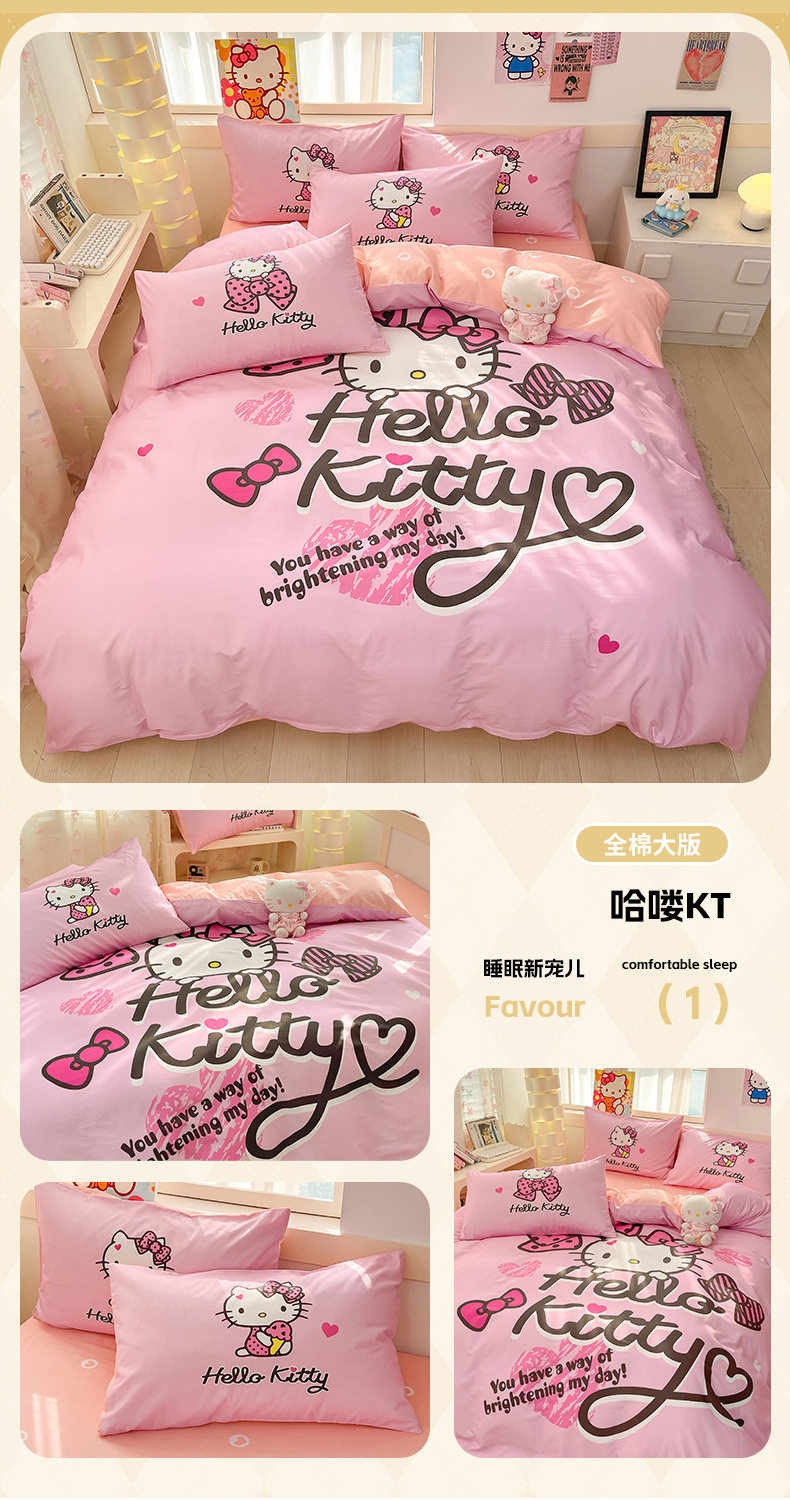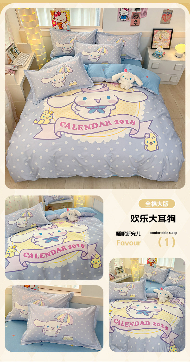 Sanrio Large Printed Cotton Four-Piece Set Pure Cotton Cartoon Kuromi Student Three-Piece Set Fitted Sheet and Quilt Cover Cross-Border