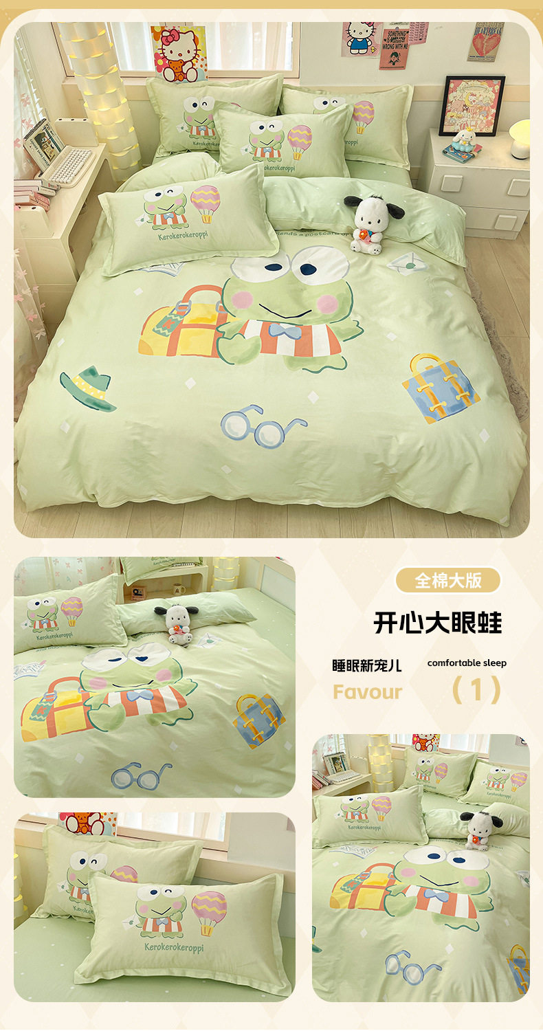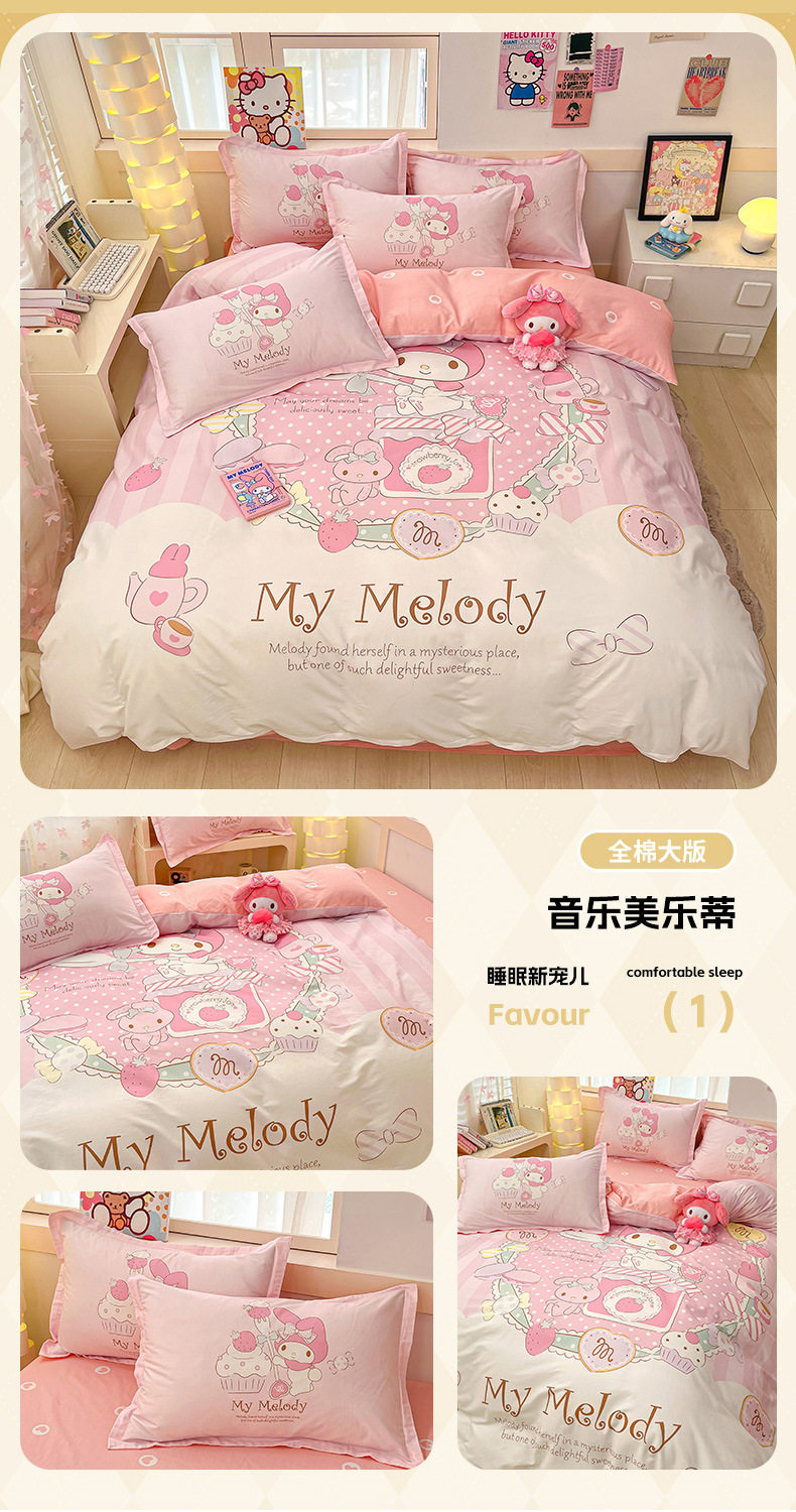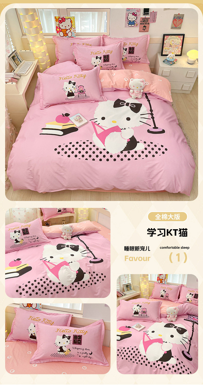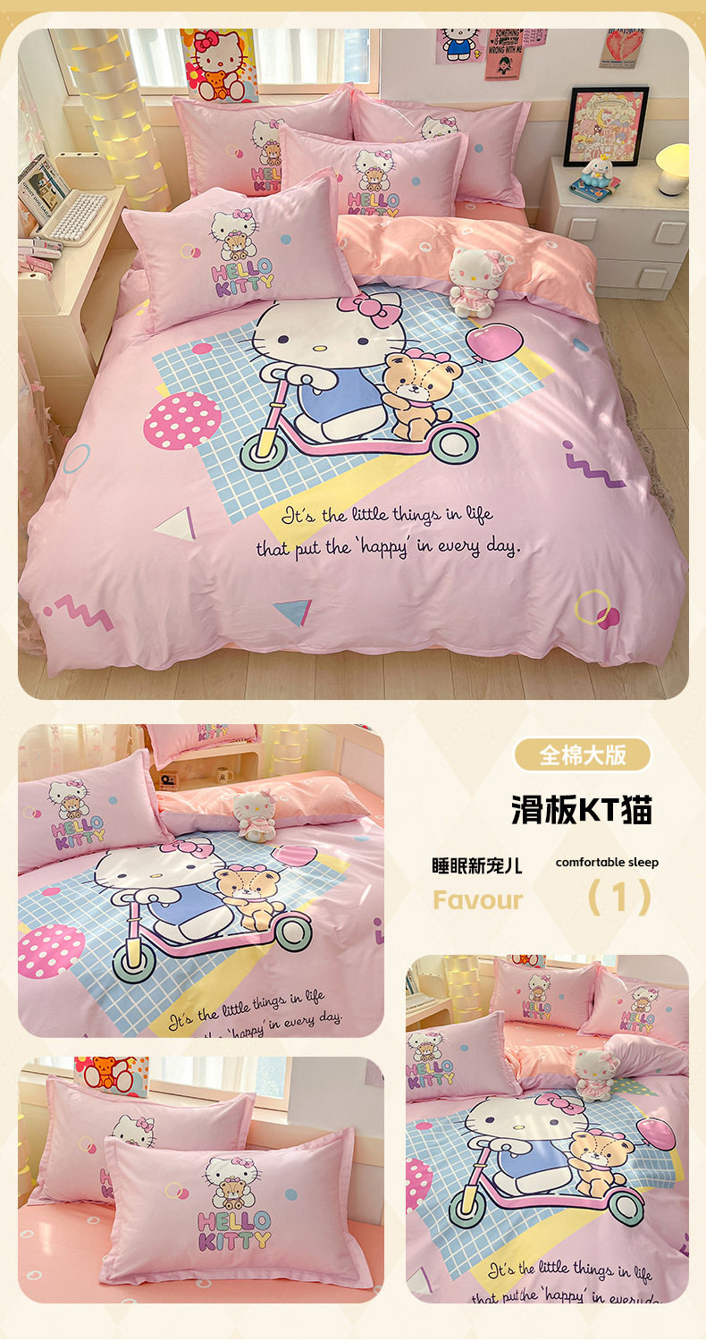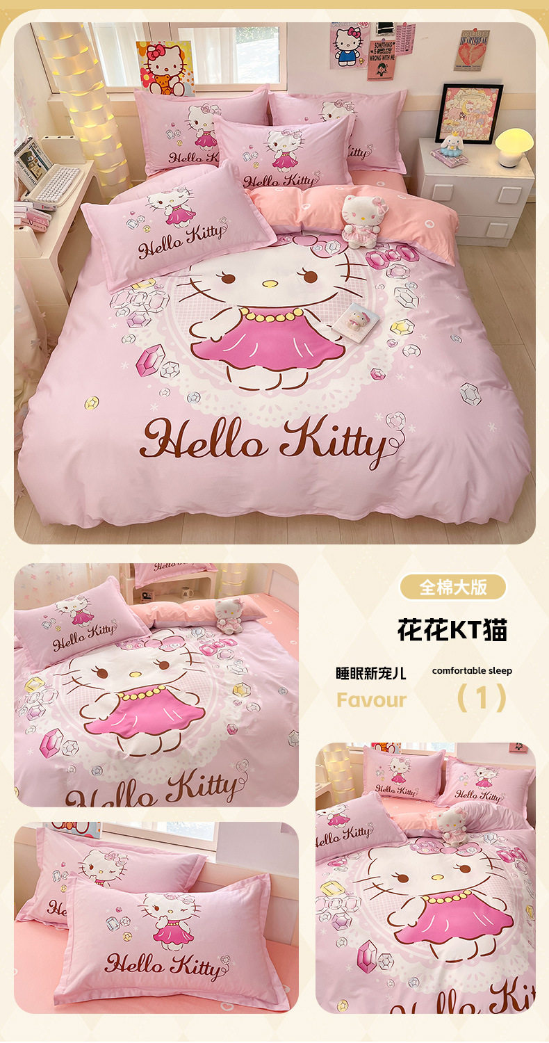 Sanrio Large Printed Cotton Four-Piece Set Pure Cotton Cartoon Kuromi Student Three-Piece Set Fitted Sheet and Quilt Cover Cross-Border